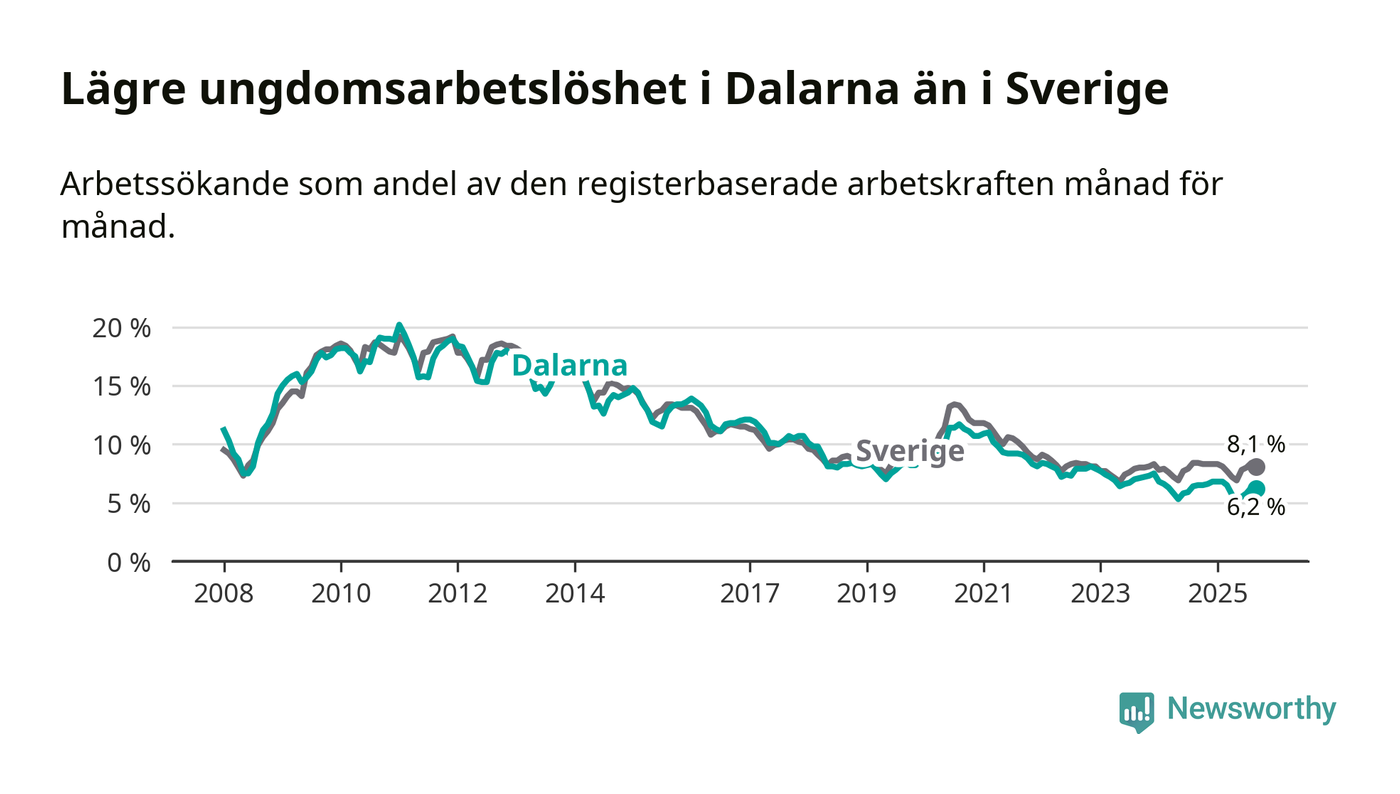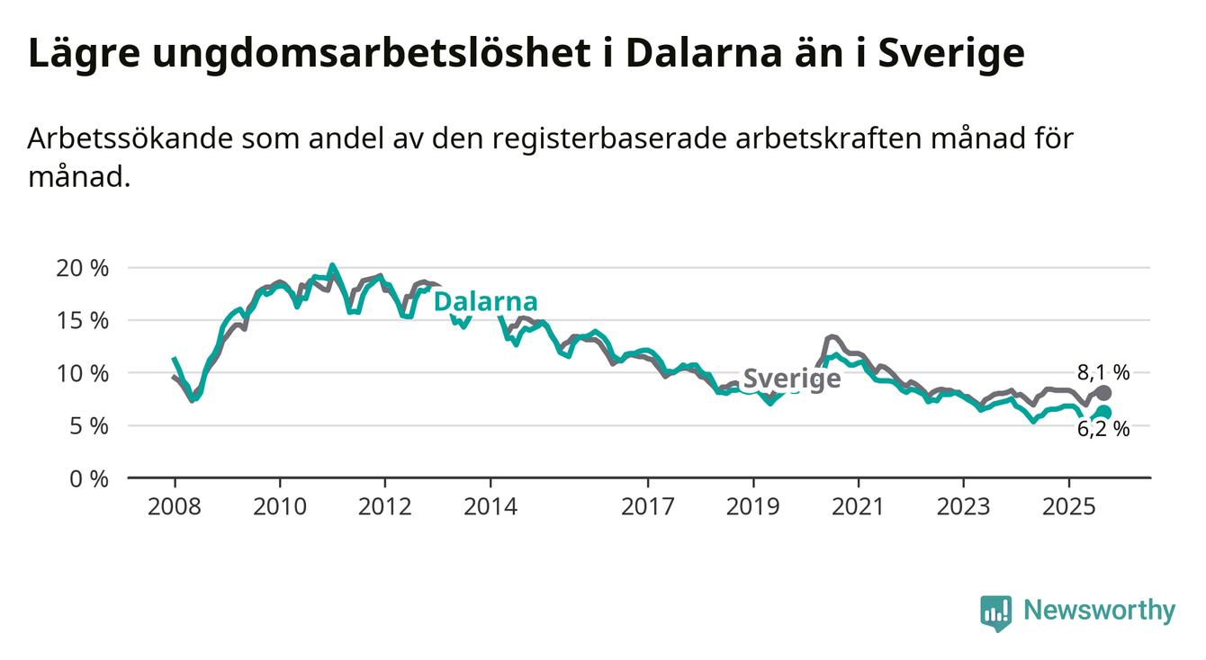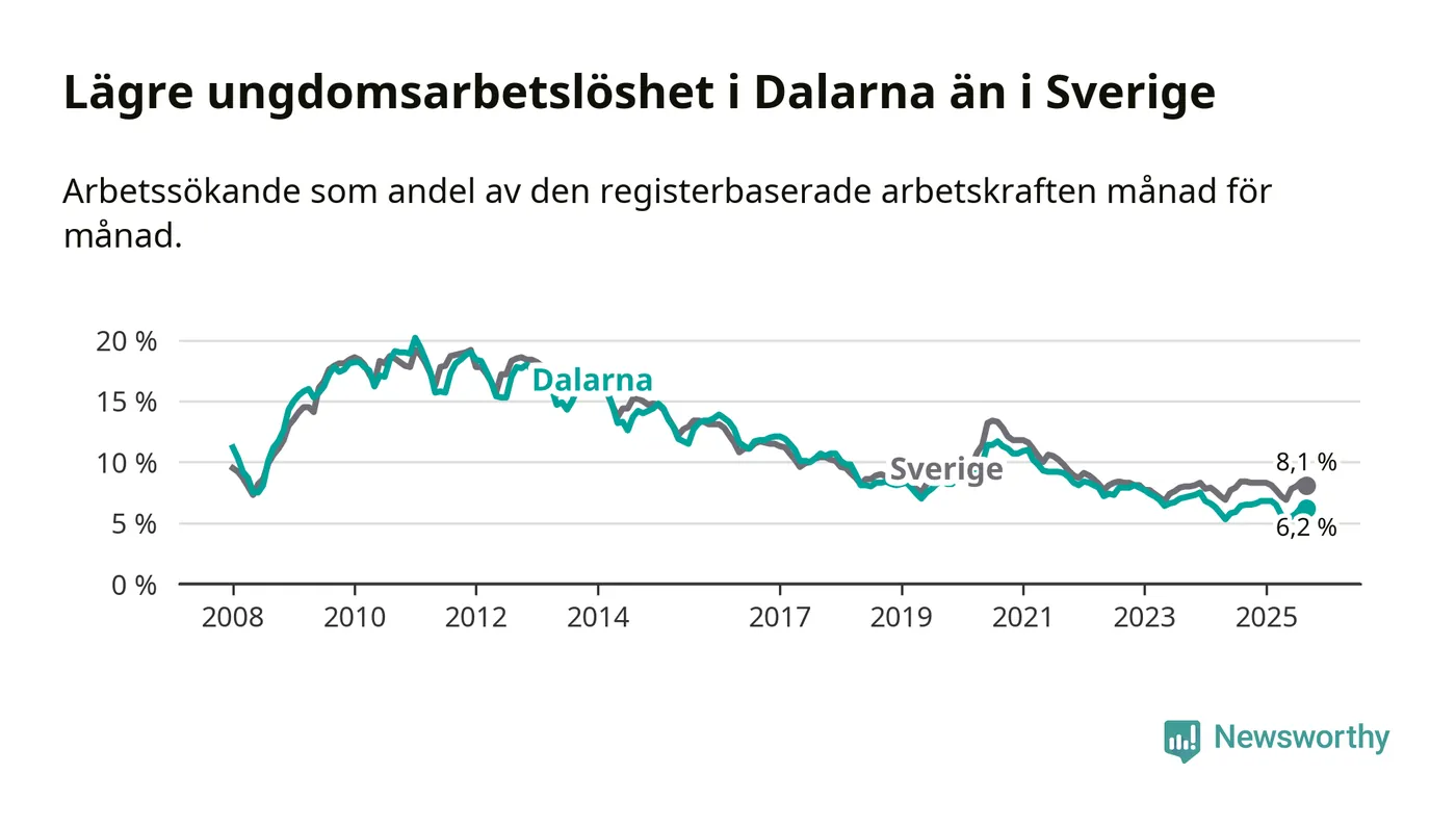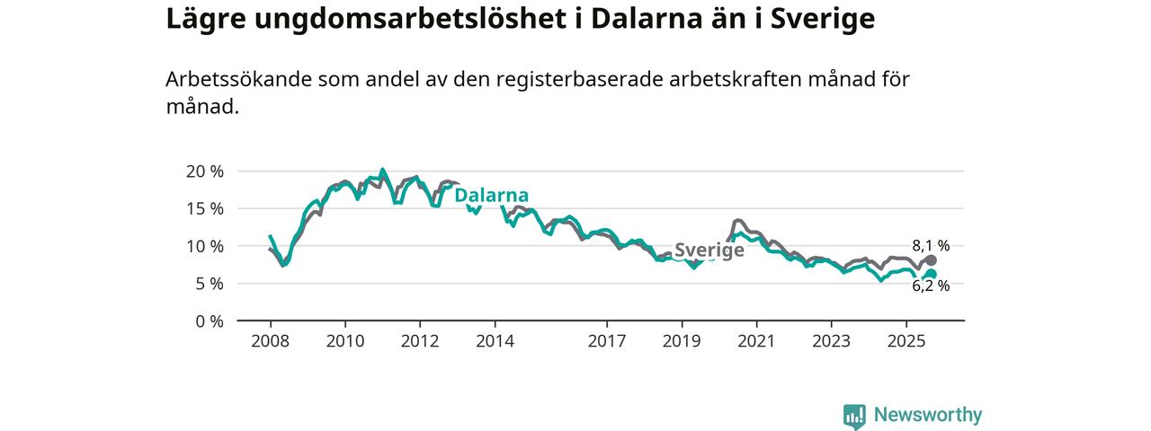 Precis som den totala arbetslösheten ligger ungdomsarbetslösheten i Dalarna lägre än i Sverige som helhet. Skillnaden mellan länet och riket är 1,9 procentenheter.