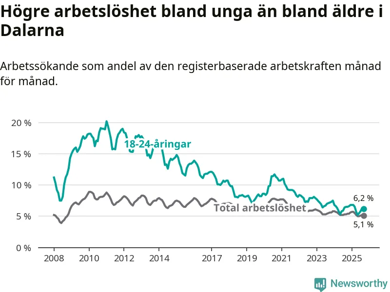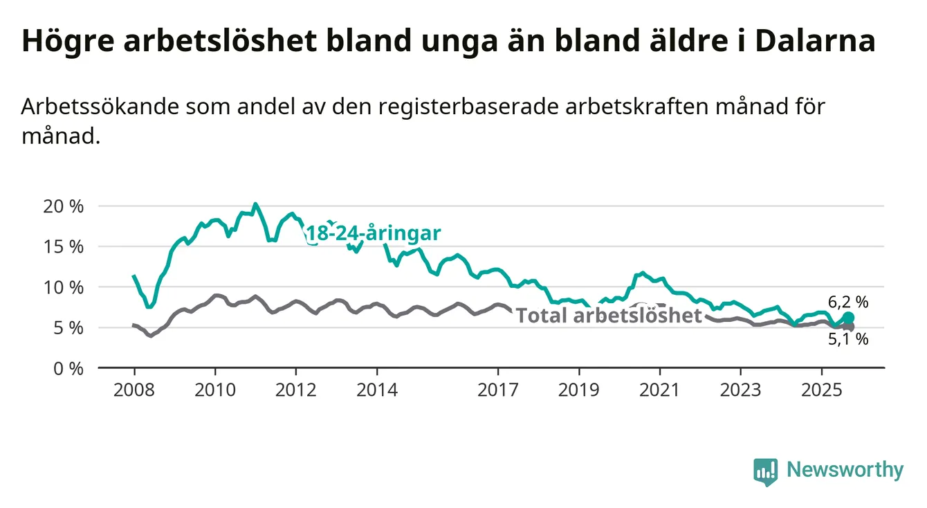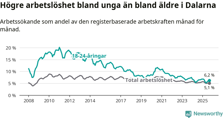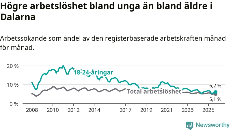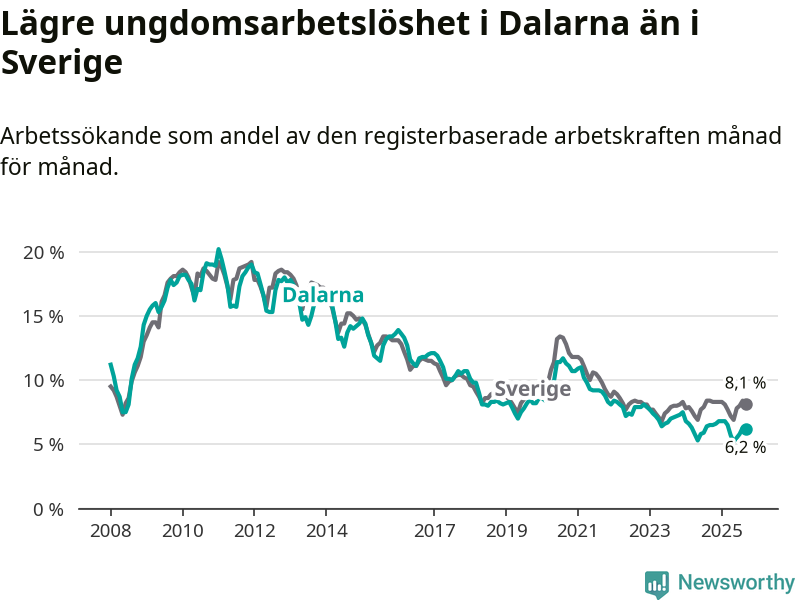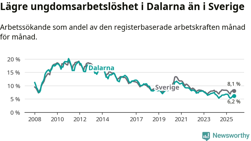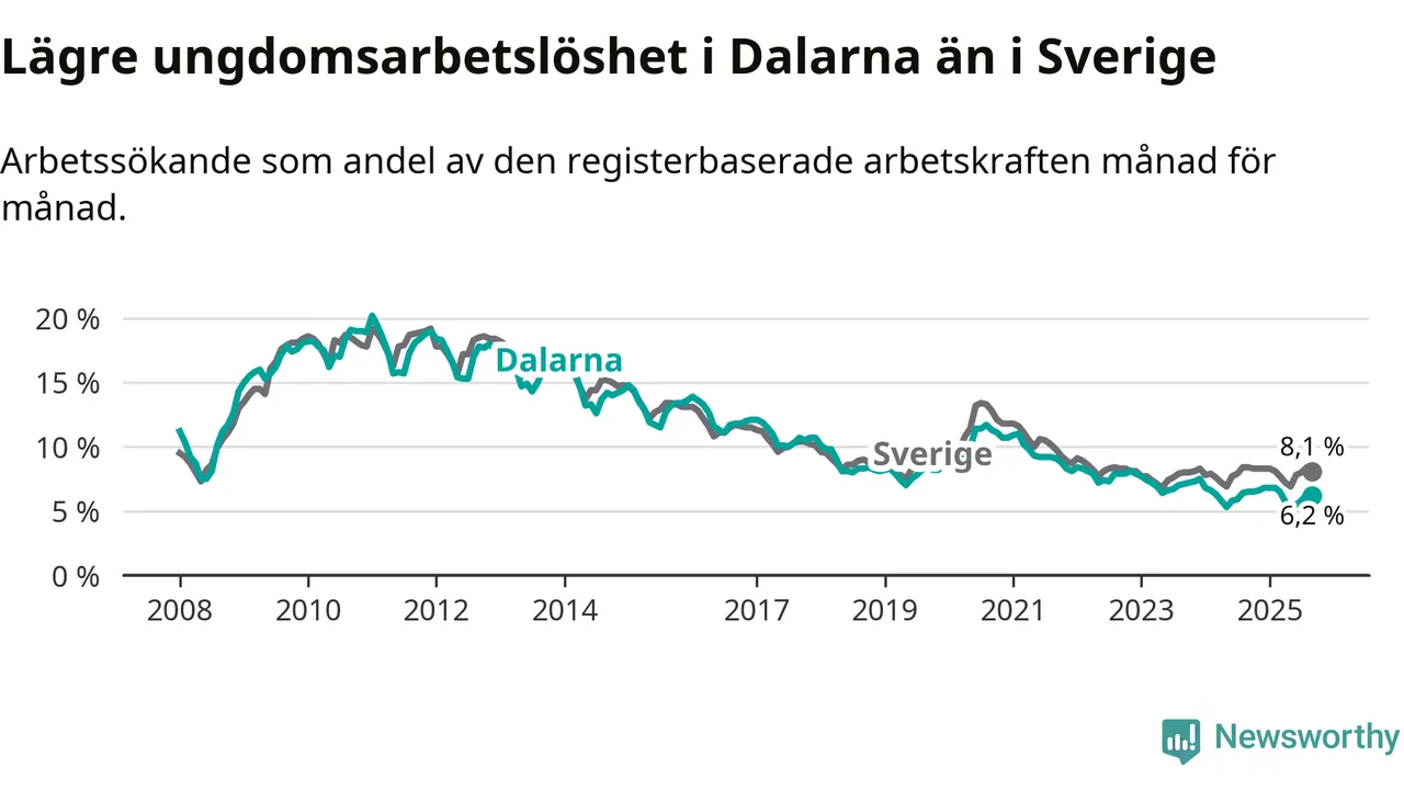 Precis som den totala arbetslösheten ligger ungdomsarbetslösheten i Dalarna lägre än i Sverige som helhet. Skillnaden mellan länet och riket är 1,9 procentenheter.