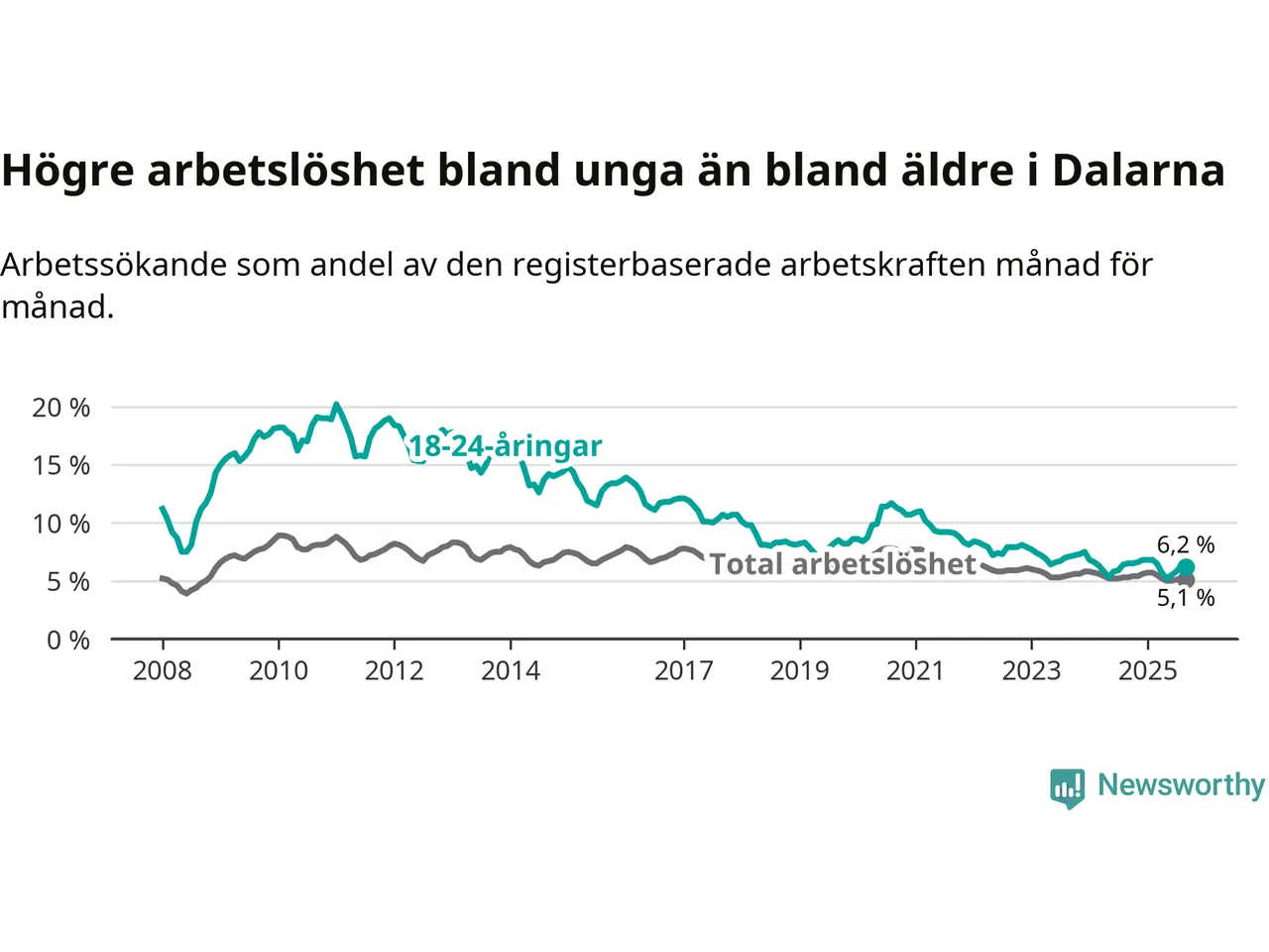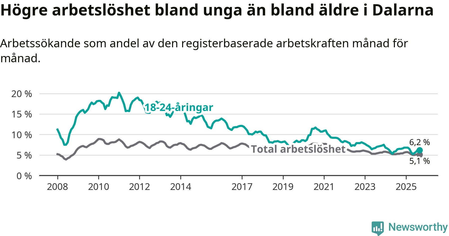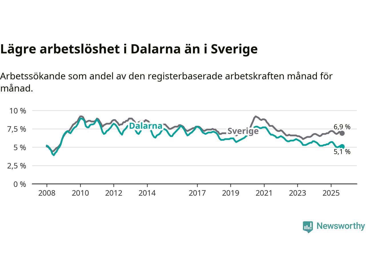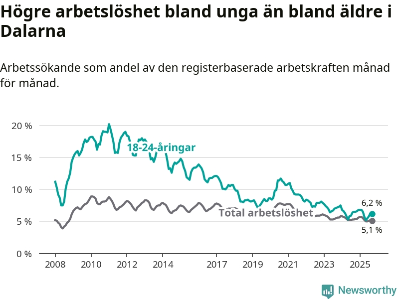 | Hela arbetskraften | 5,1 % | −0,2 % ▼ | 6,9 % | +0,1 % ▲ |