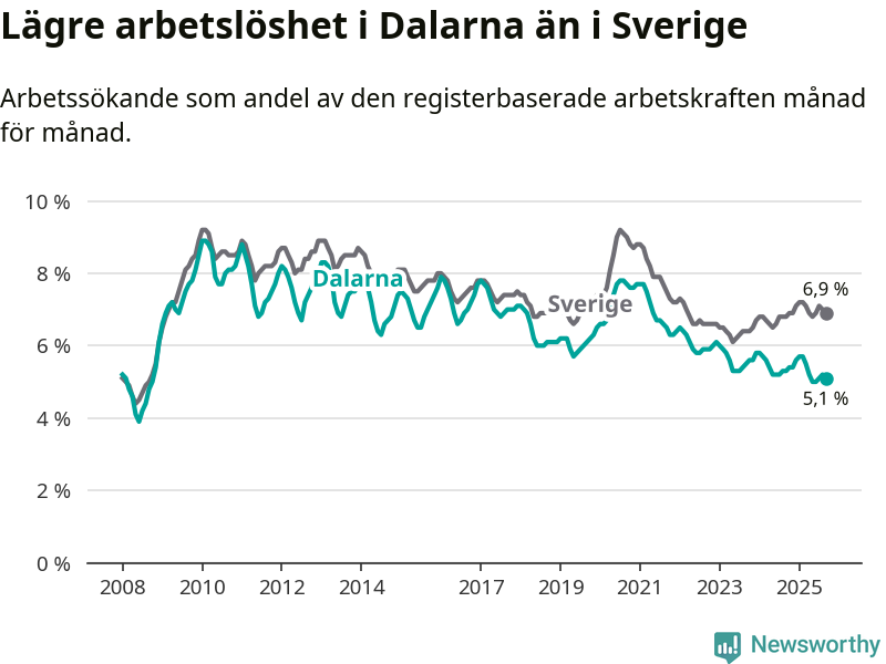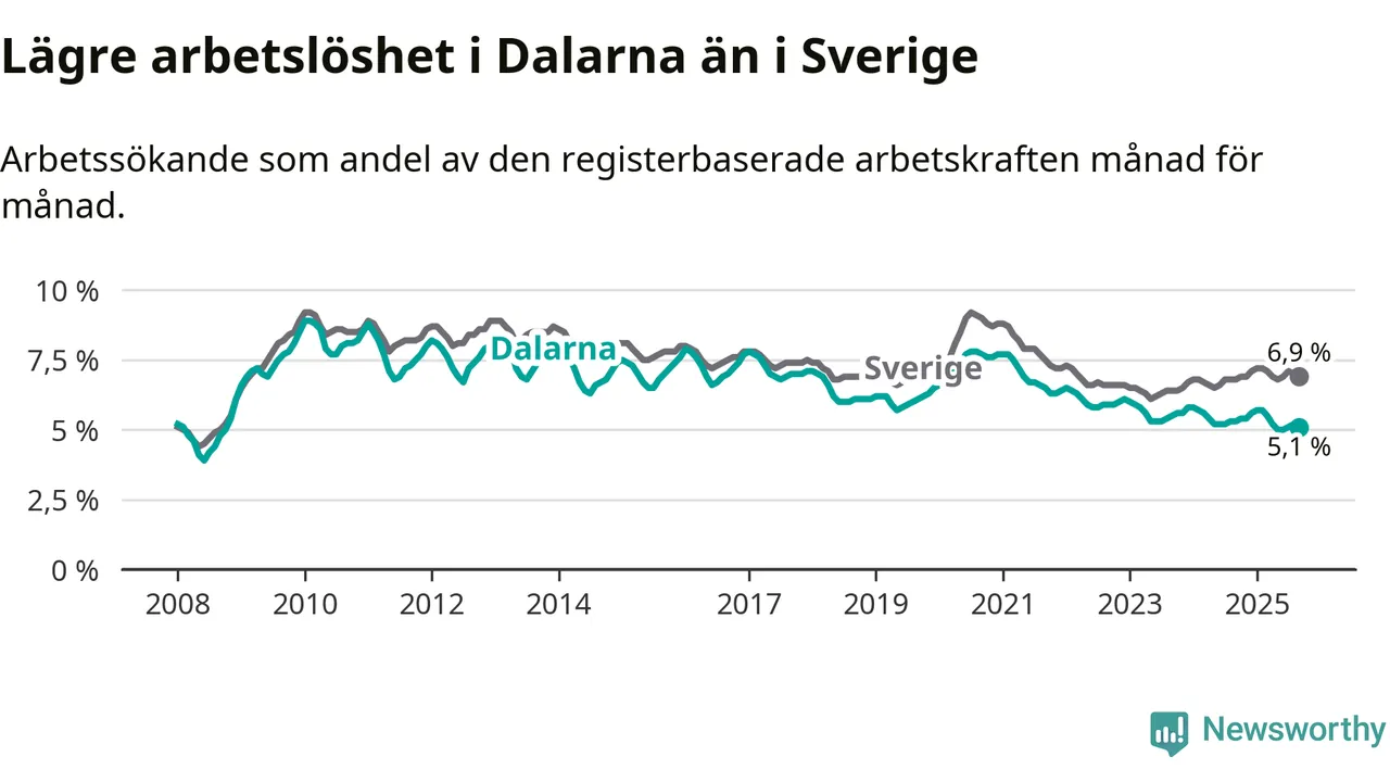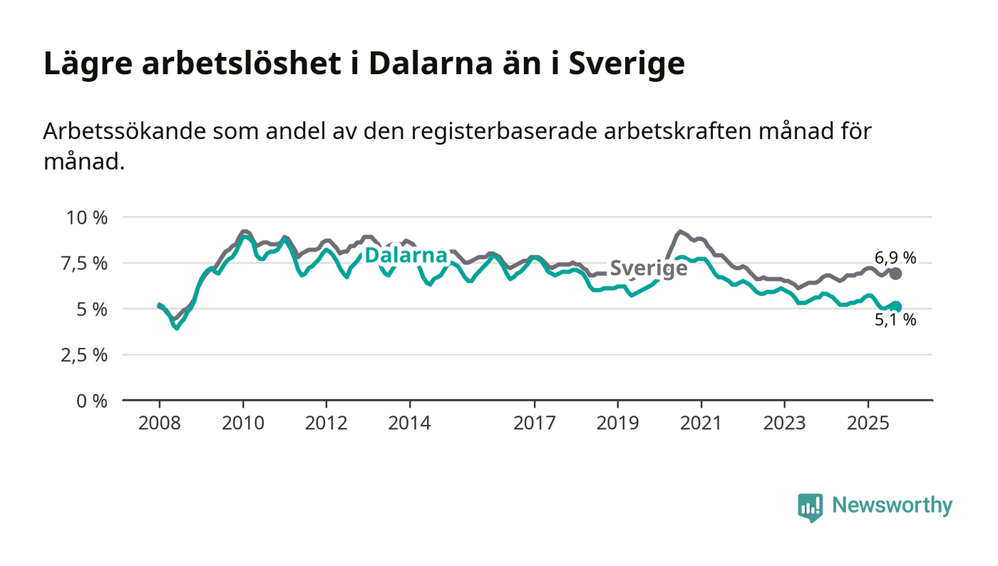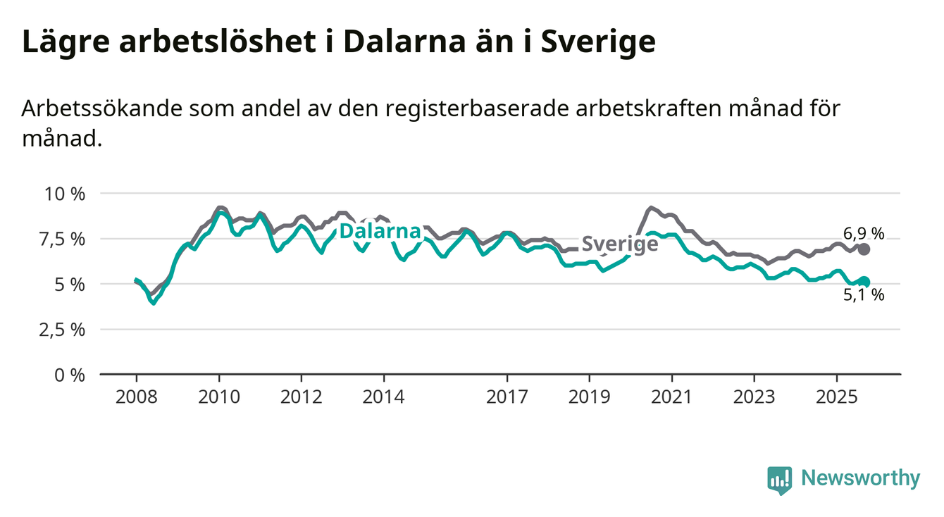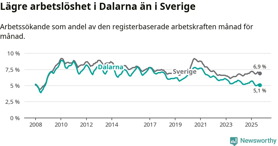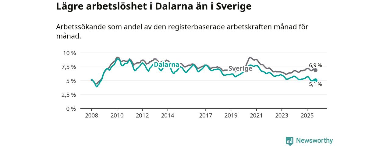 Under september månad rapporterade Dalarnas län en total arbetslöshet på 5,1 procent. Det är en minskning jämfört med samma tidpunkt i fjol (−0,2 procentenheter). I Sverige däremot stiger arbetslösheten något.