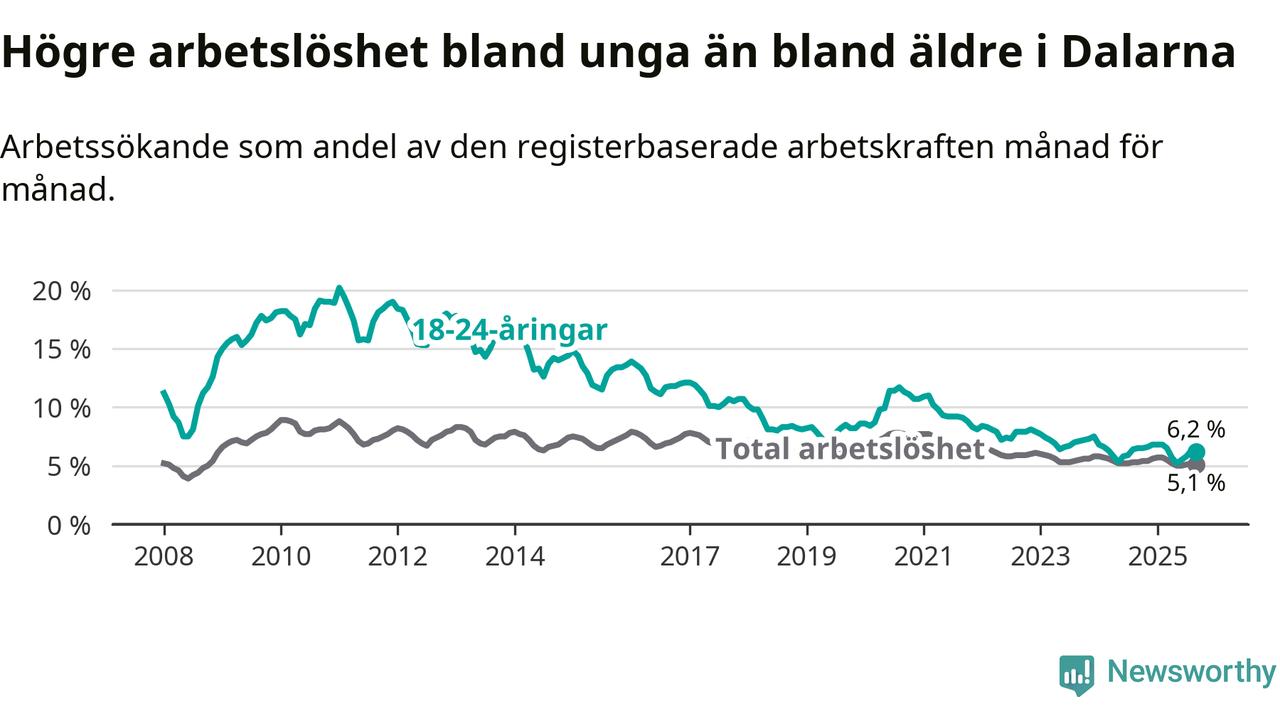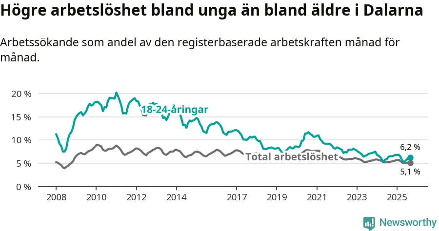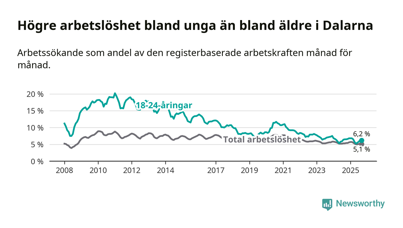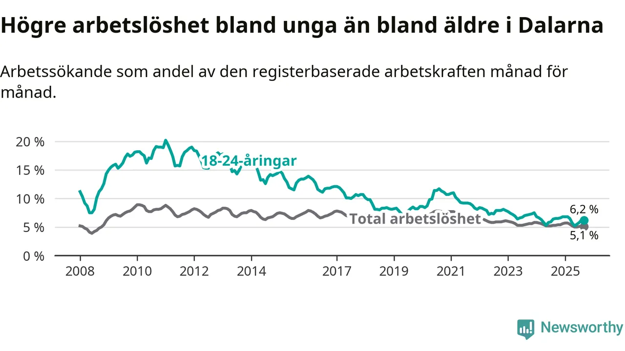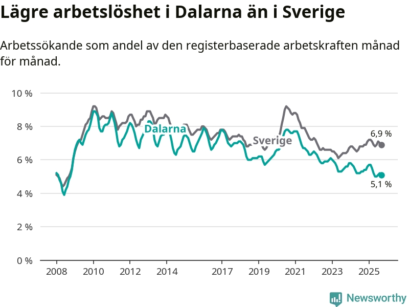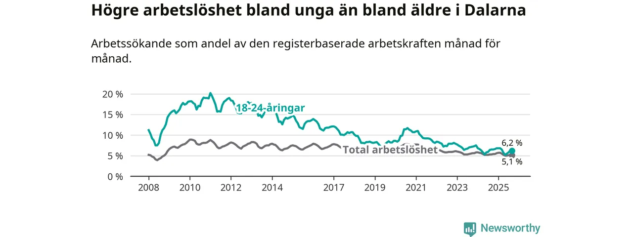 Under september månad rapporterade Dalarnas län en total arbetslöshet på 5,1 procent. Det är en minskning jämfört med samma tidpunkt i fjol (−0,2 procentenheter). I Sverige däremot stiger arbetslösheten något.