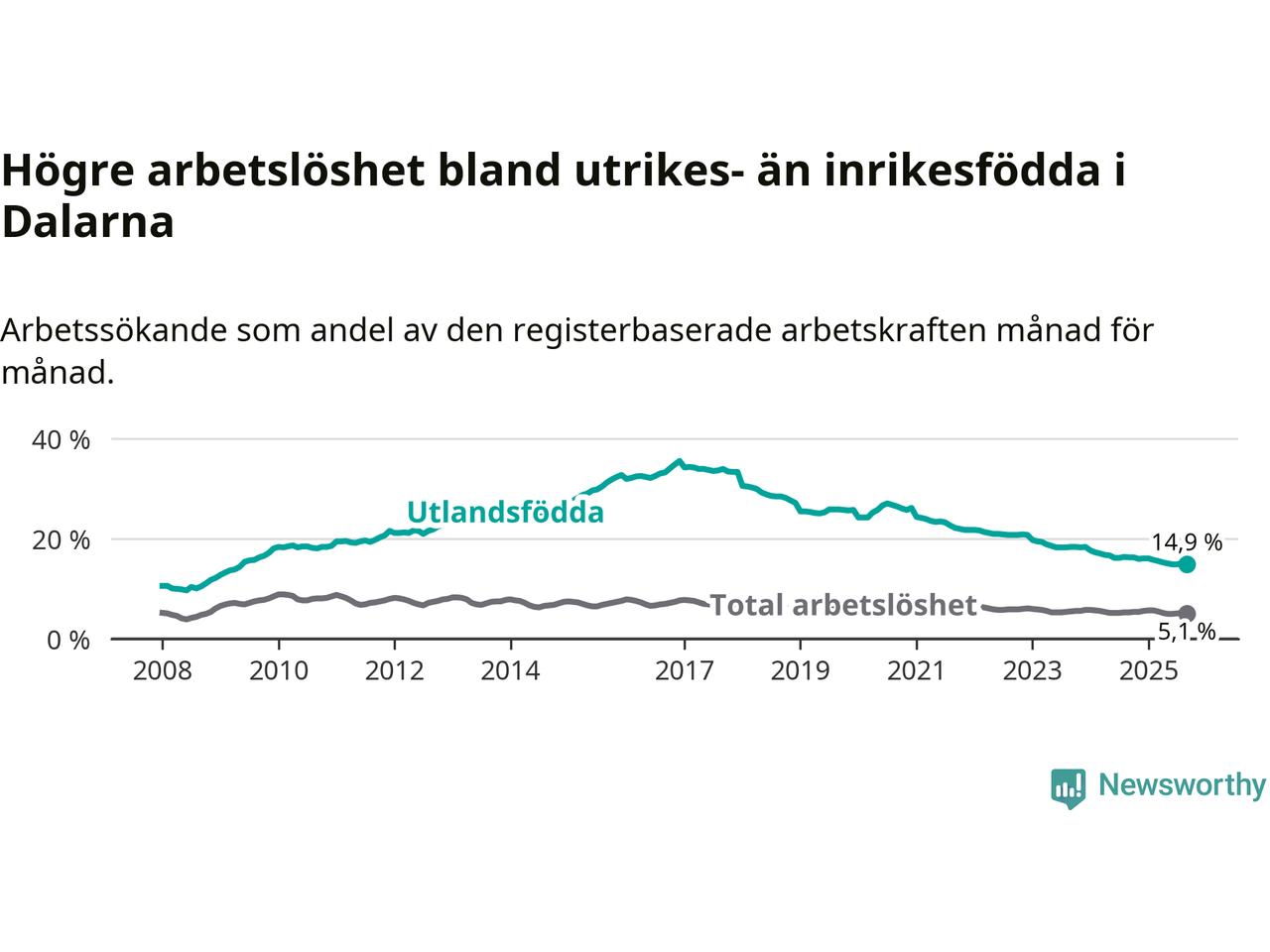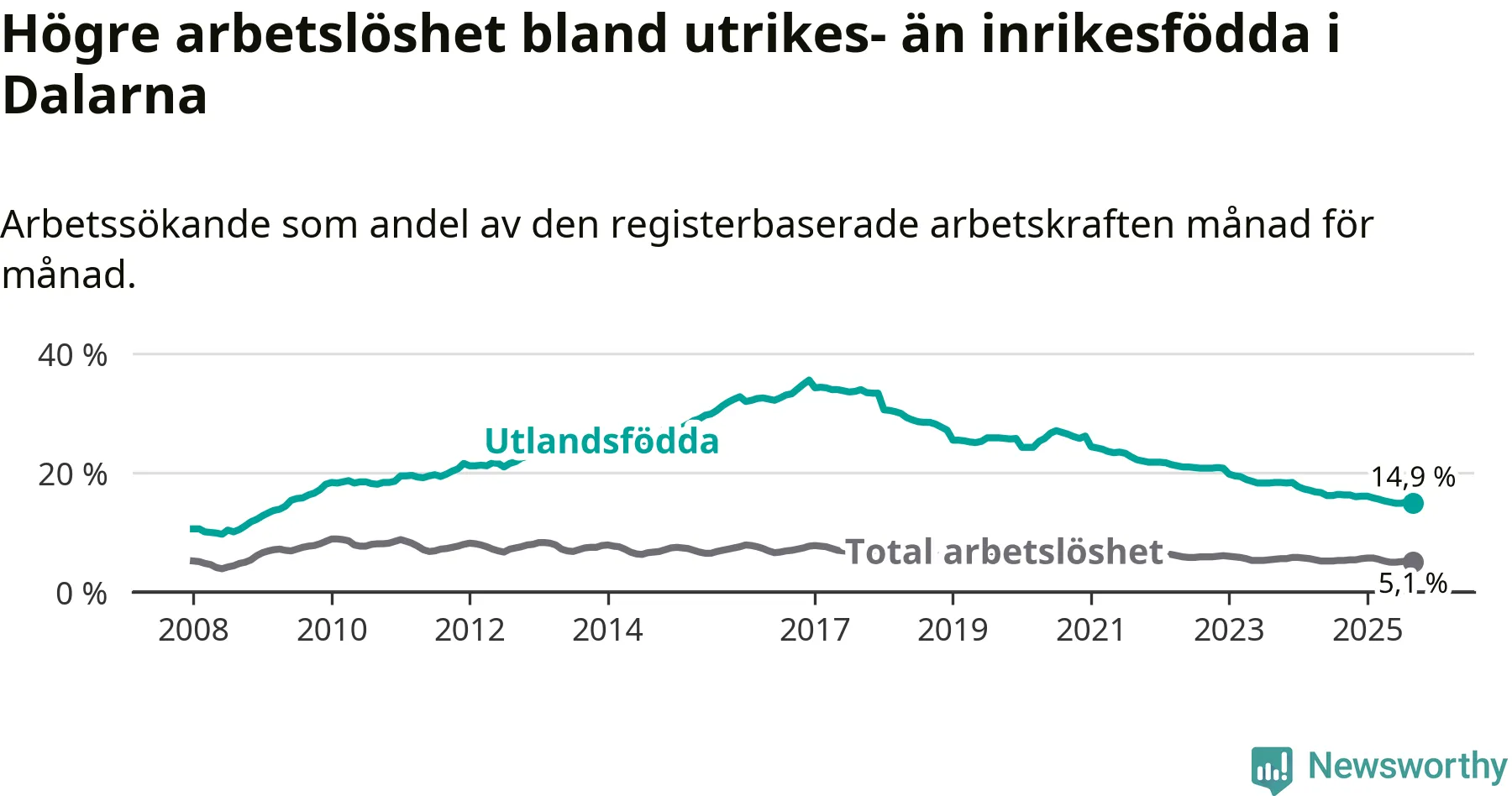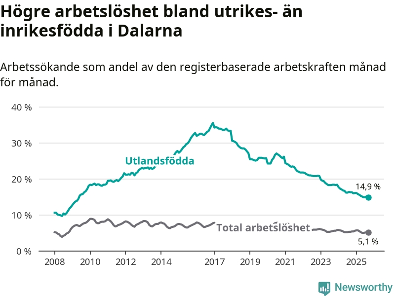 | Bland utlandsfödda | 14,9 % | −1,4 % ▼ | 14,8 % | −0,4 % ▼ |