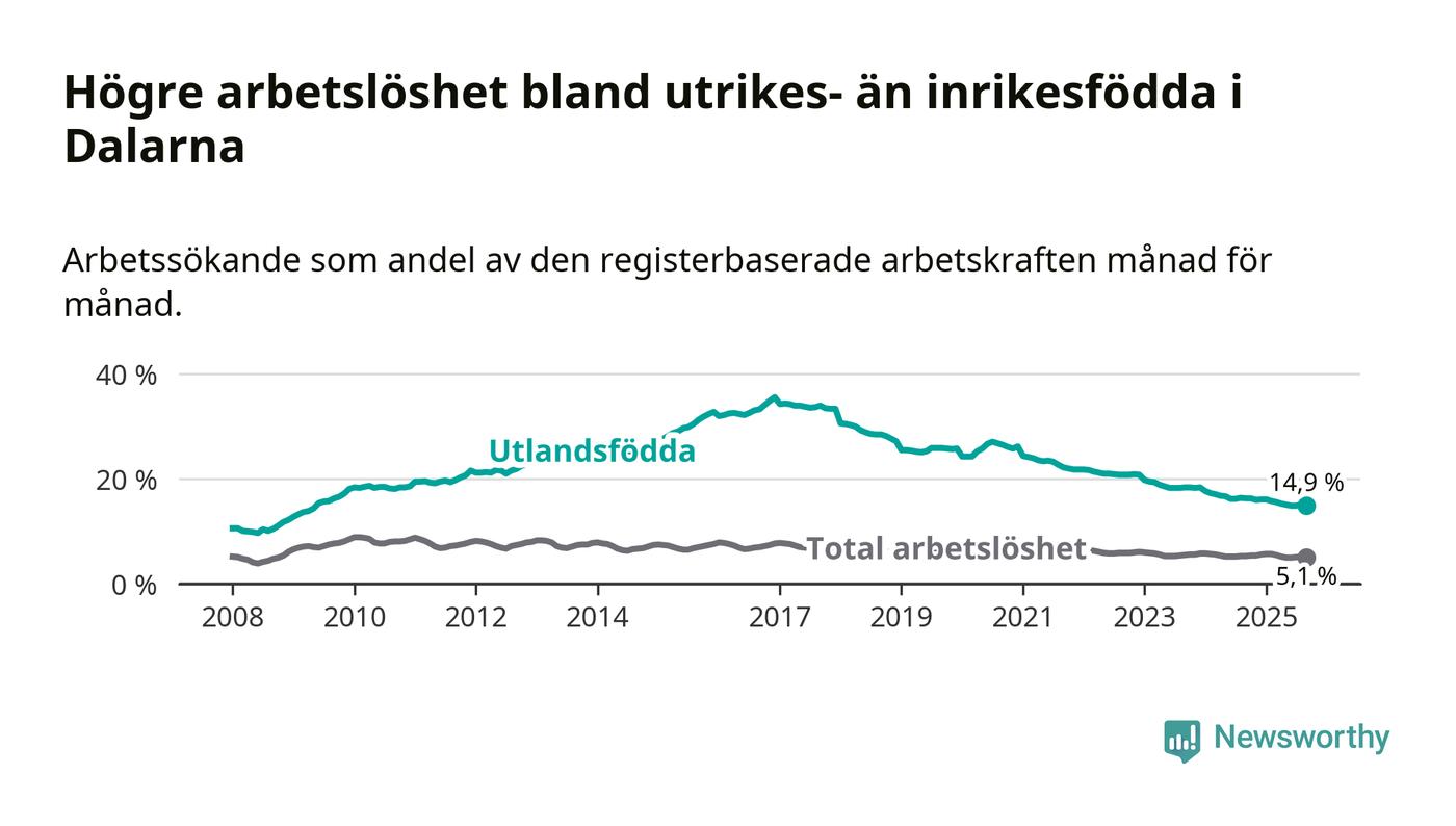 Arbetslösheten bland utlandsfödda var 14,9 procent i Dalarna under september månad, motsvarande 3 146 av 21 114 personer. Det är 1,4 procentenheter färre än vid samma tidpunkt i fjol (−270 om man räknar personer). Därmed har de utlandsföddas arbetslöshet varit lägre än vid samma tidpunkt i fjol i över fyra år i sträck. Sedan januari 2021 har arbetslösheten bland utlandsfödda minskat från 24,4 till 14,9 procent.