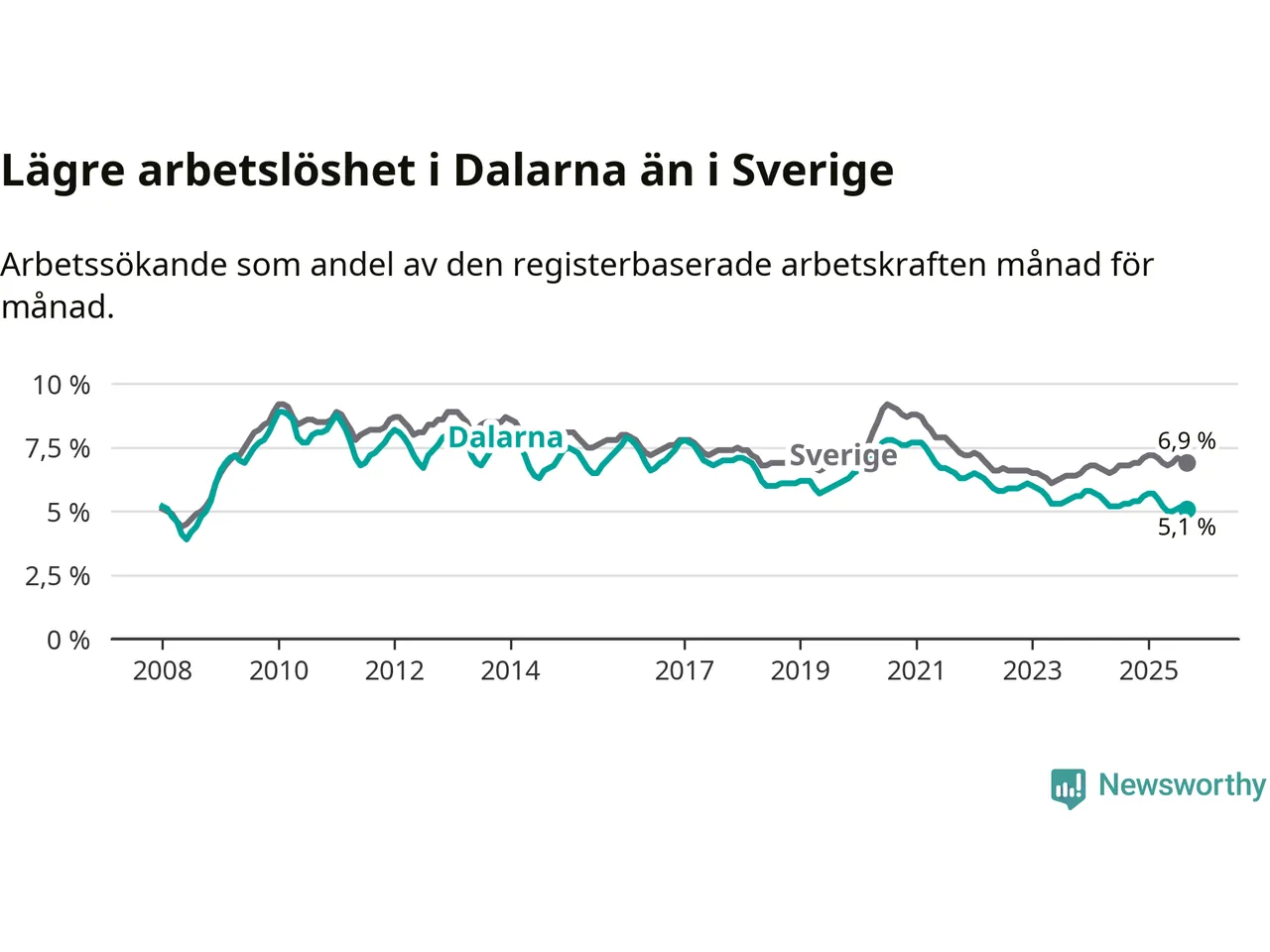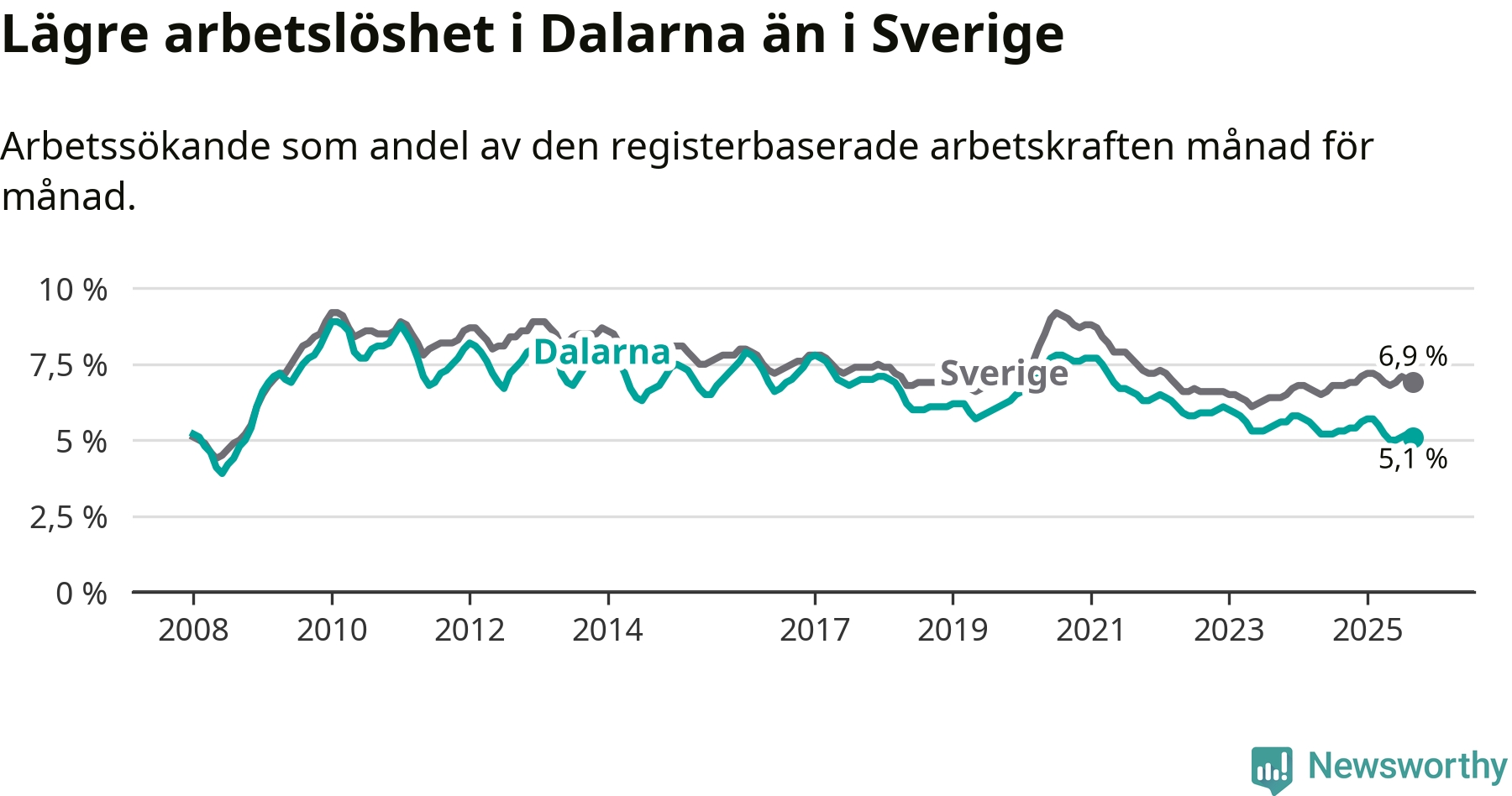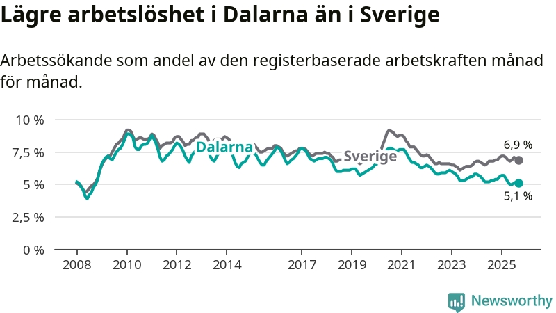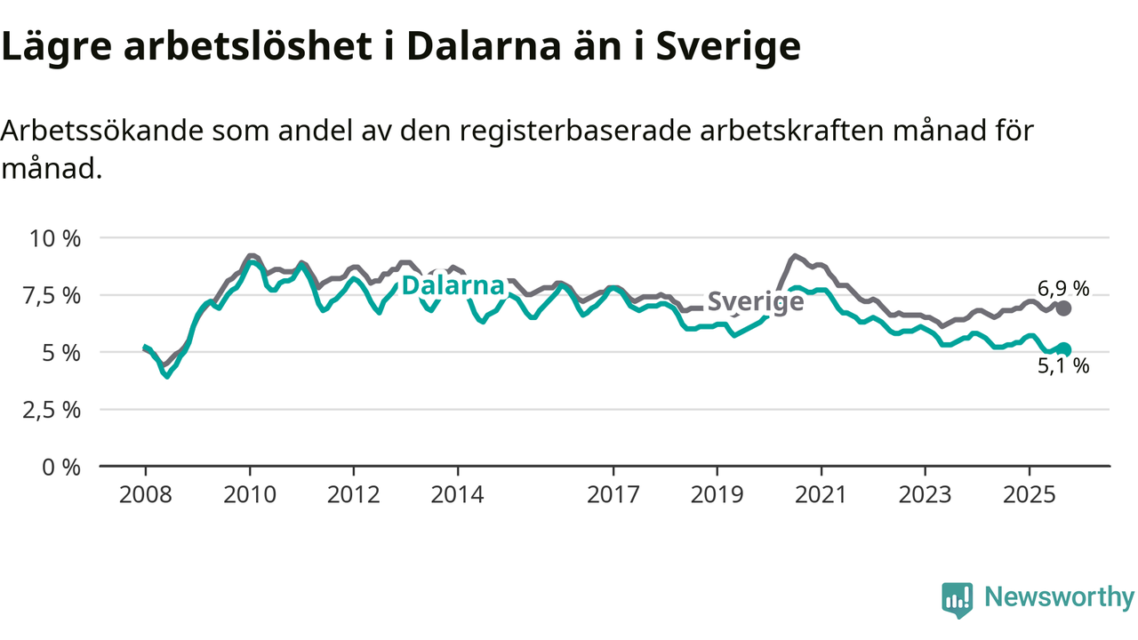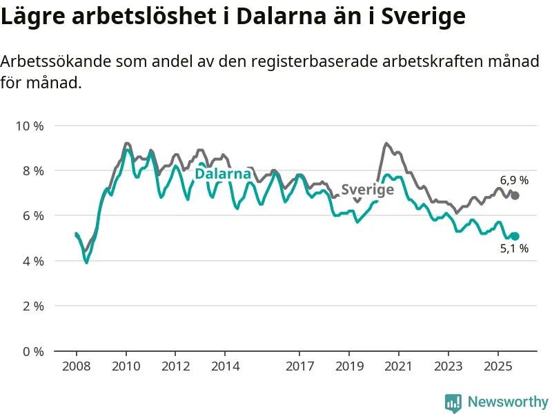 Dalarna hade redan tidigare lägre arbetslöshet än snittet i hela Sverige och nu växer klyftan (5,1 procent i länet, jämfört med 6,9 procent i hela riket). Norrbotten har den lägsta arbetslösheten i riket (3,8 procent), medan Skåne har den högsta (8,9 procent). För att Dalarna skulle komma ner i samma arbetslöshetsnivå som Norrbotten skulle 1 766 personer behöva sysselsättas.