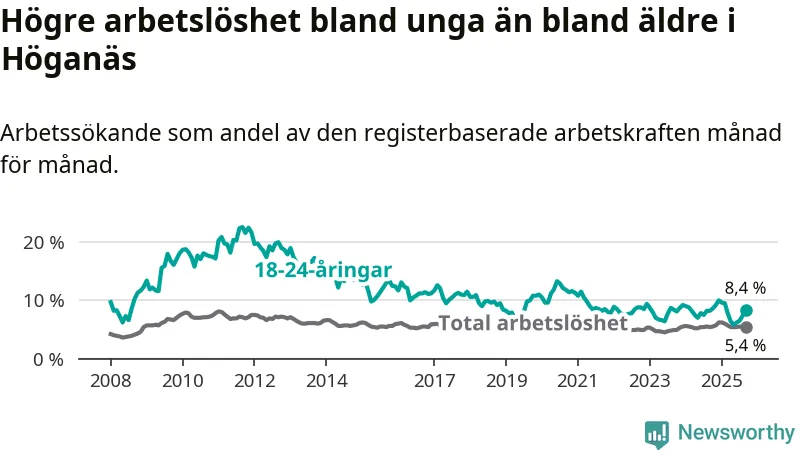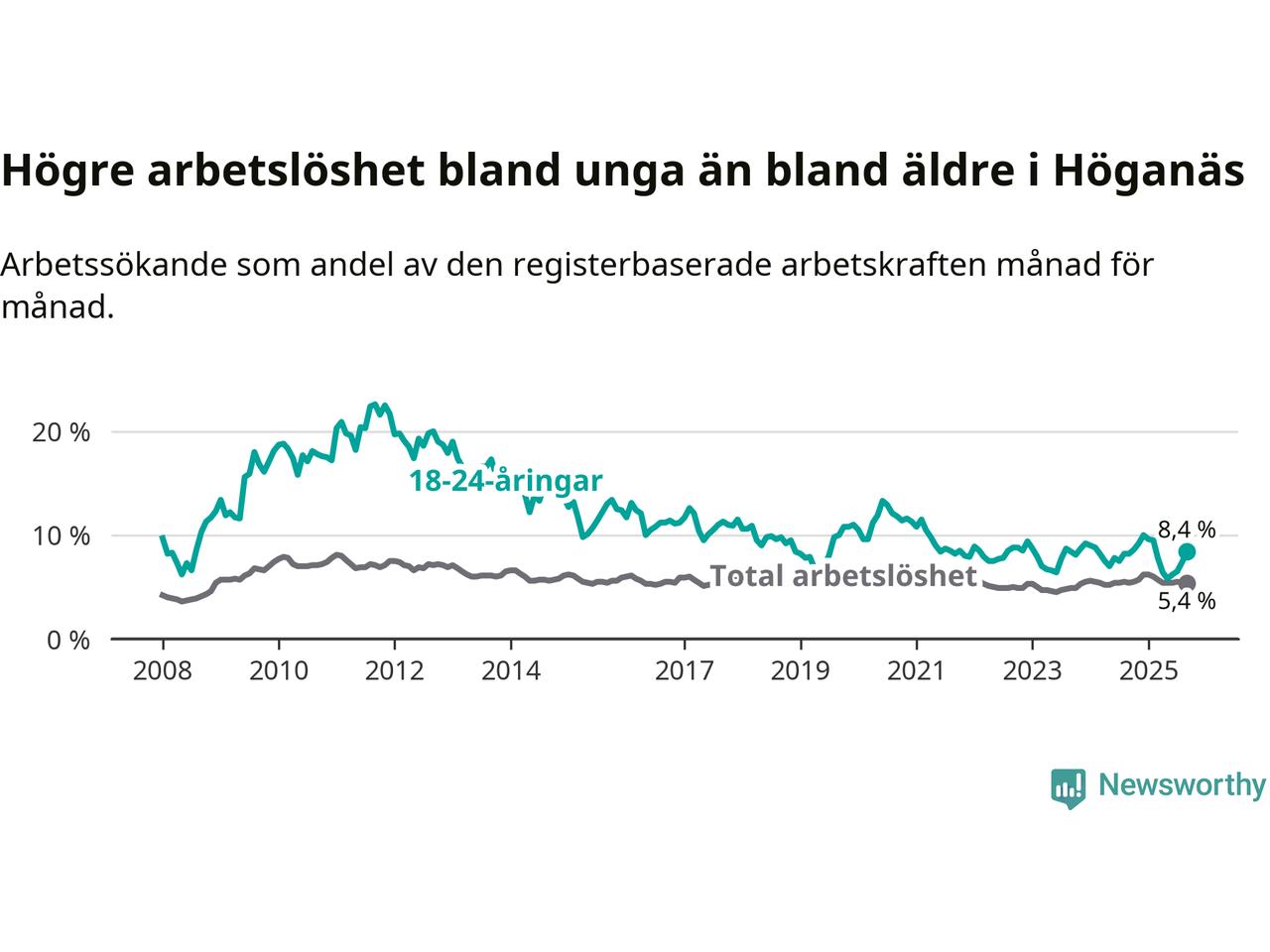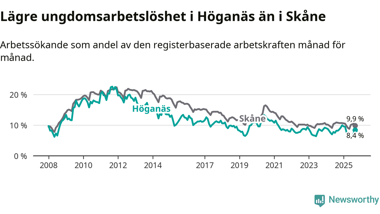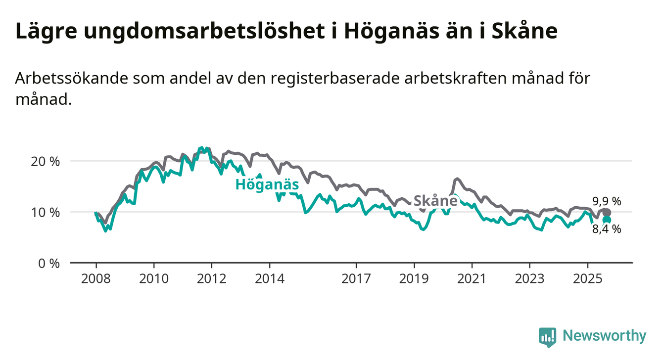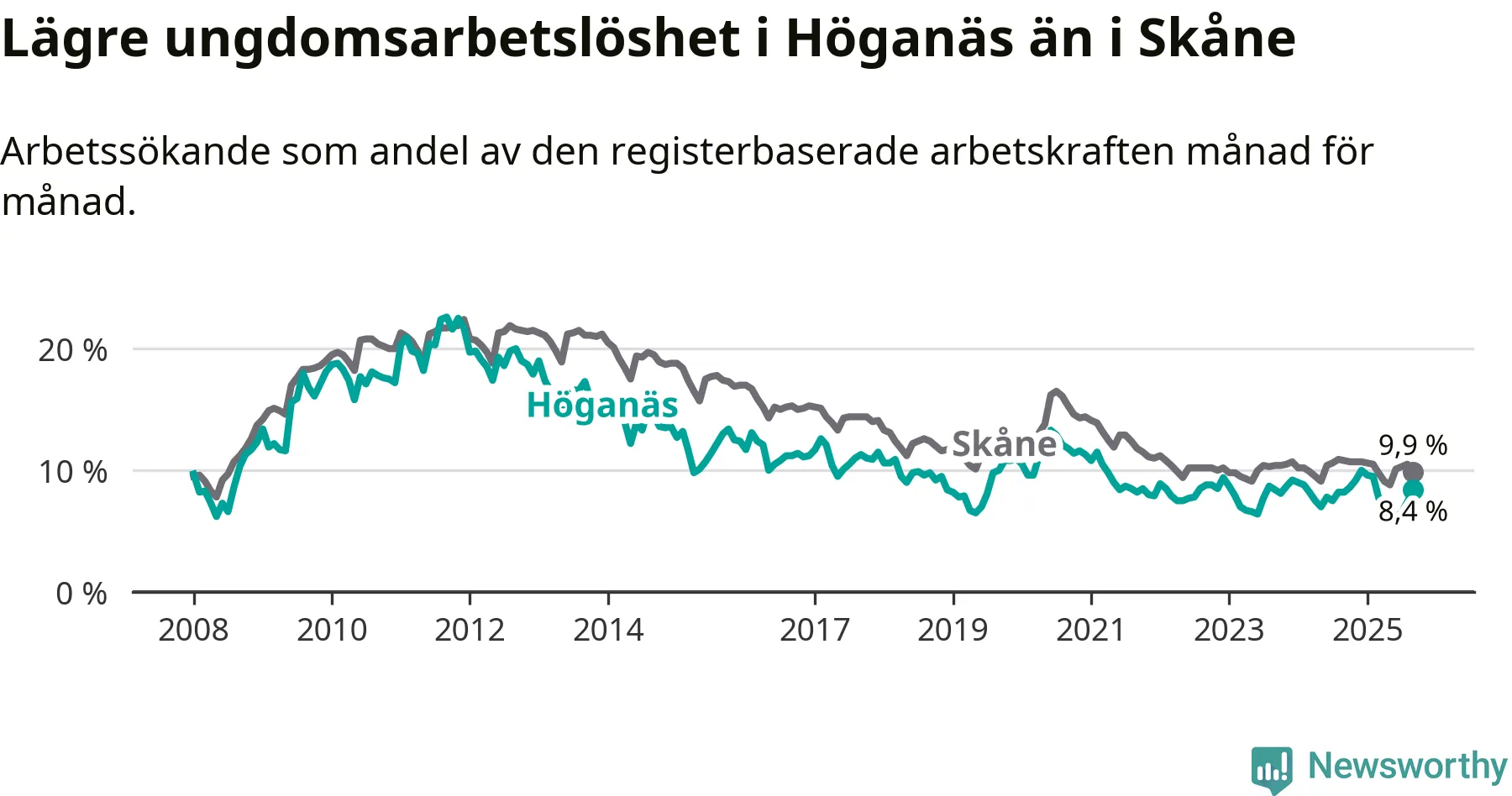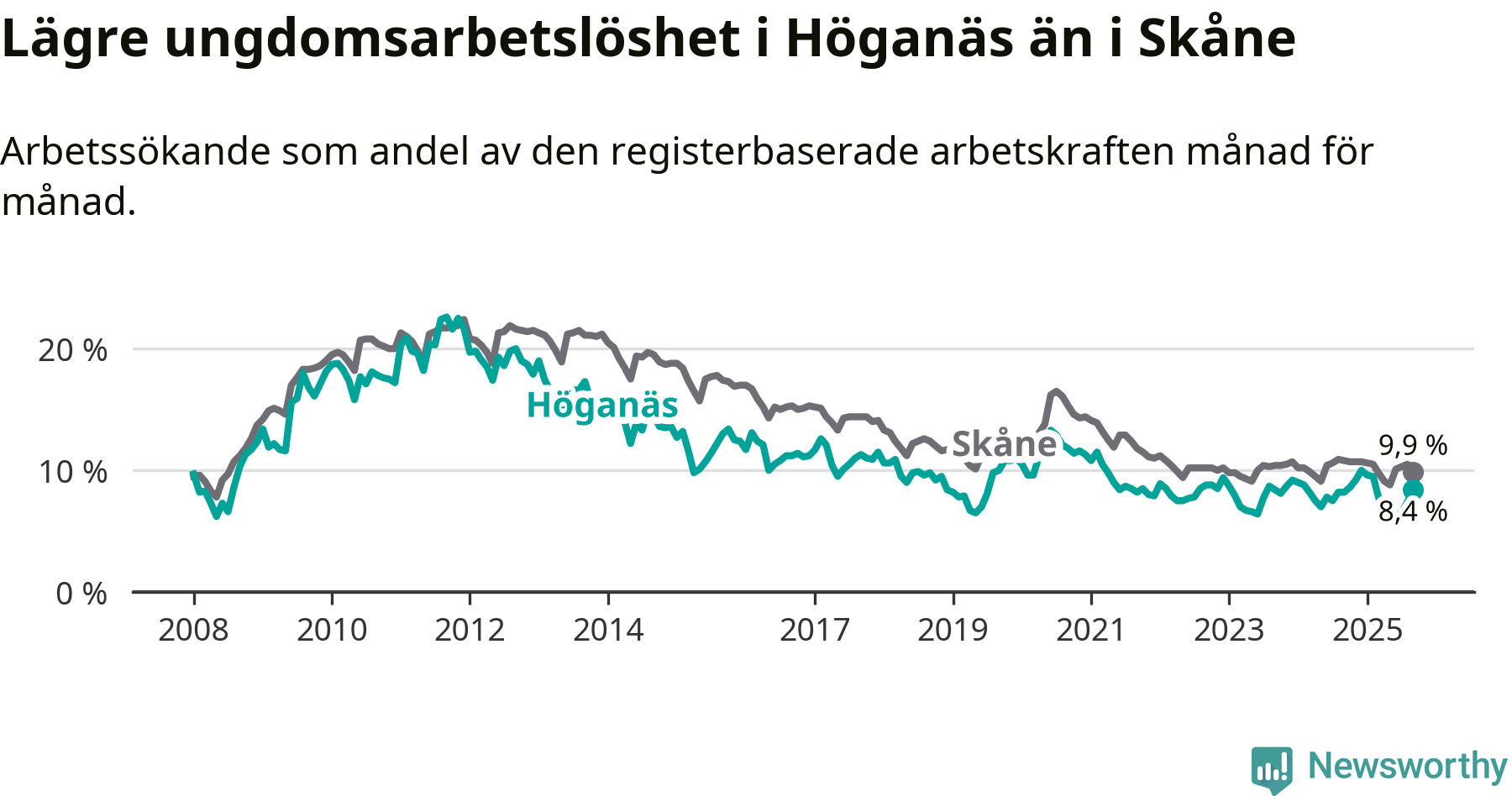 Precis som den totala arbetslösheten ligger ungdomsarbetslösheten i Höganäs lägre än i Skåne som helhet. Skillnaden mellan kommunen och länet är 1,5 procentenheter.