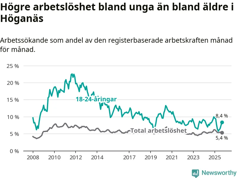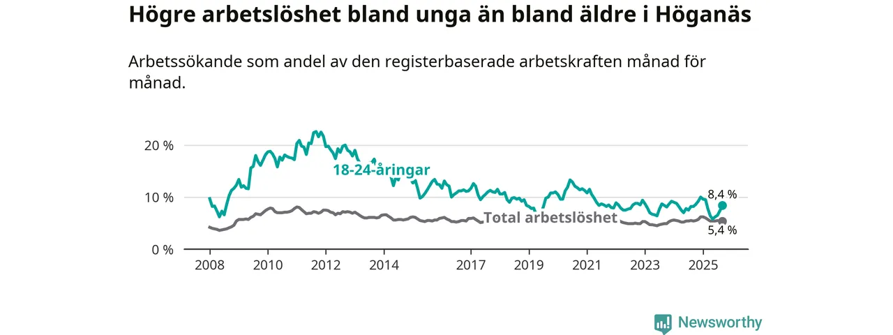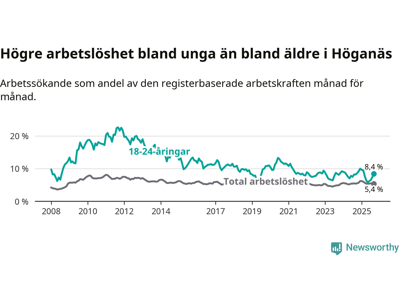 Till skillnad från den totala arbetslösheten stiger arbetslösheten bland unga (+0,2 procentenheter). I september var 8,4 procent av 18–24-åringarna inskrivna som arbetssökande (motsvarande 95 personer). Mäter vi antalet inskrivna ser vi en ökning med sju personer på ett års sikt.