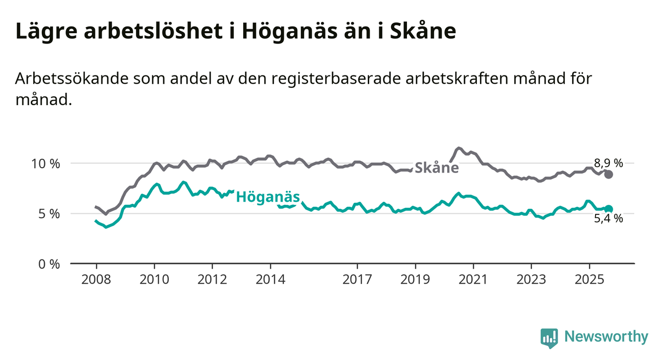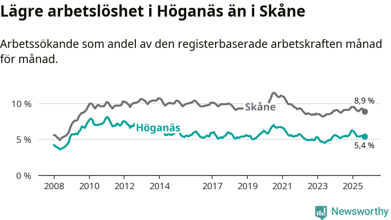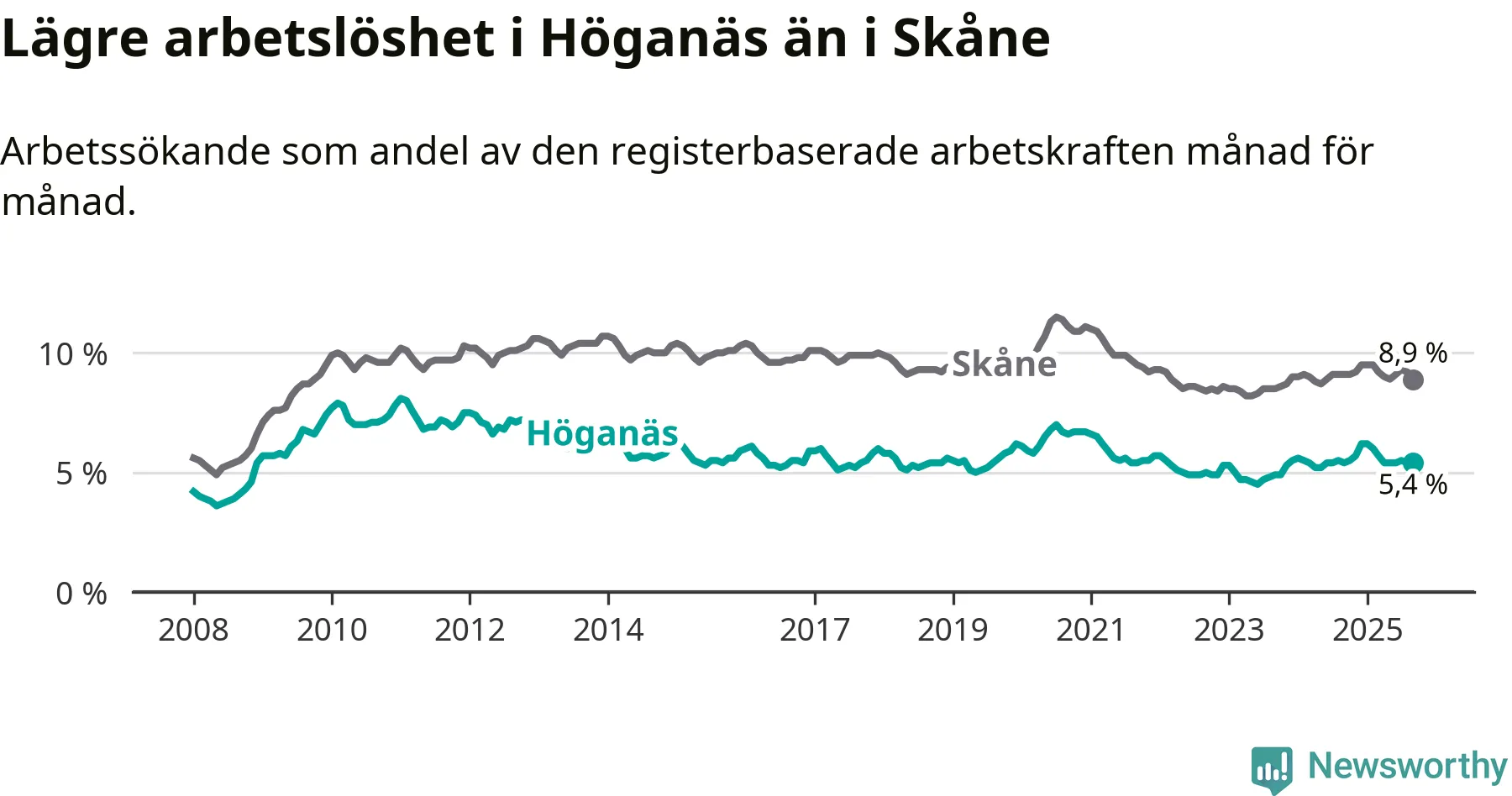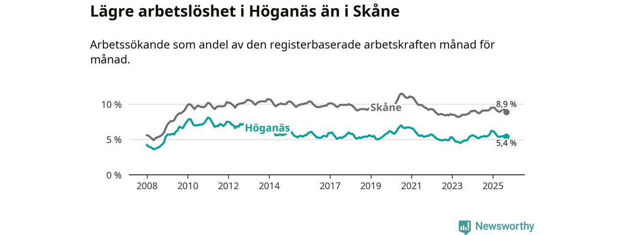 Ny statistik från Arbetsförmedlingen visar på en oförändrad i arbetslöshet i Höganäs kommun. I Skåne däremot minskar arbetslösheten.