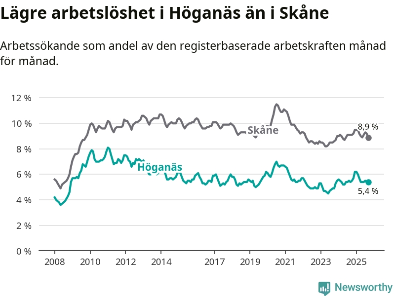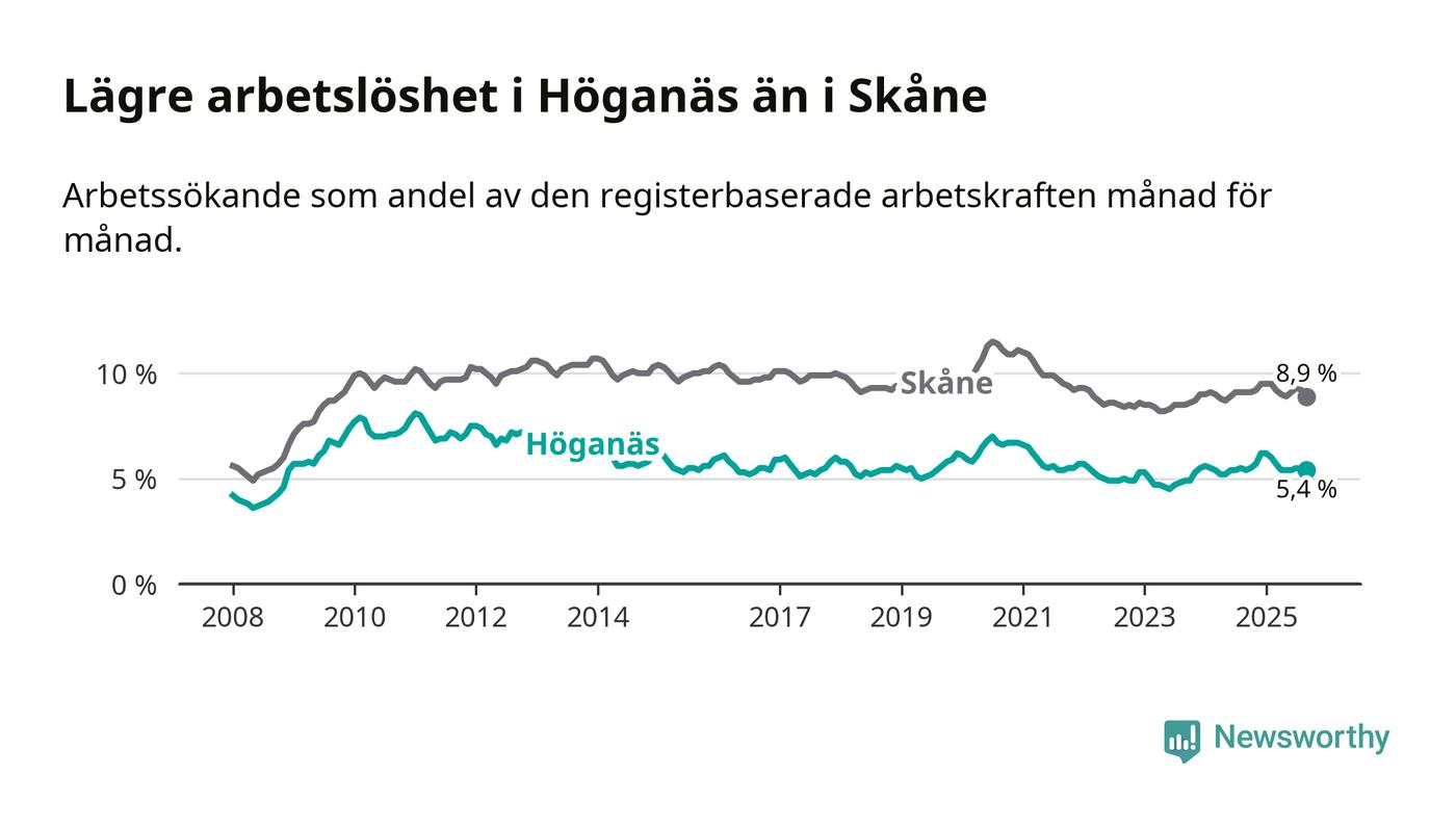 Arbetslösheten i Höganäs ligger under nivån i hela Skåne län (5,4 procent i kommunen, jämfört med 8,9 procent i hela länet). Lomma har den lägsta arbetslösheten i länet (4,1 procent), medan Perstorp har den högsta (13,6 procent). För att Höganäs skulle komma ner i samma arbetslöshetsnivå som Lomma skulle 167 personer behöva sysselsättas.