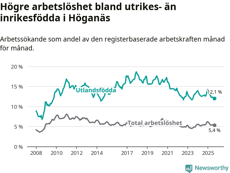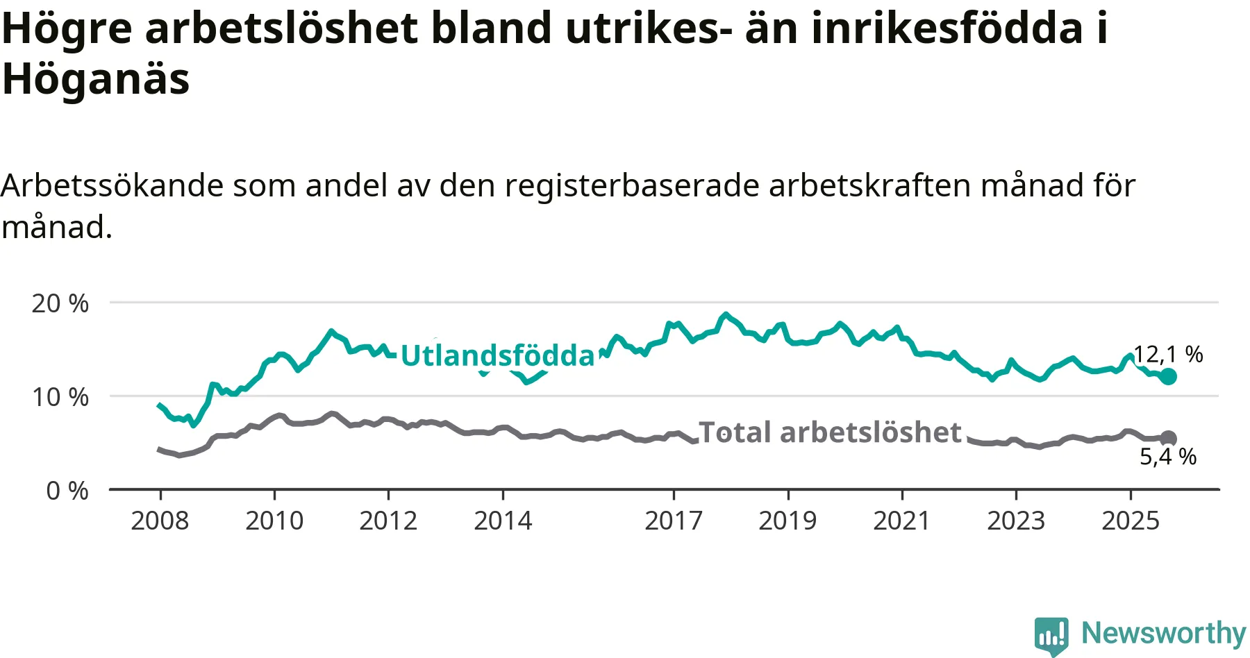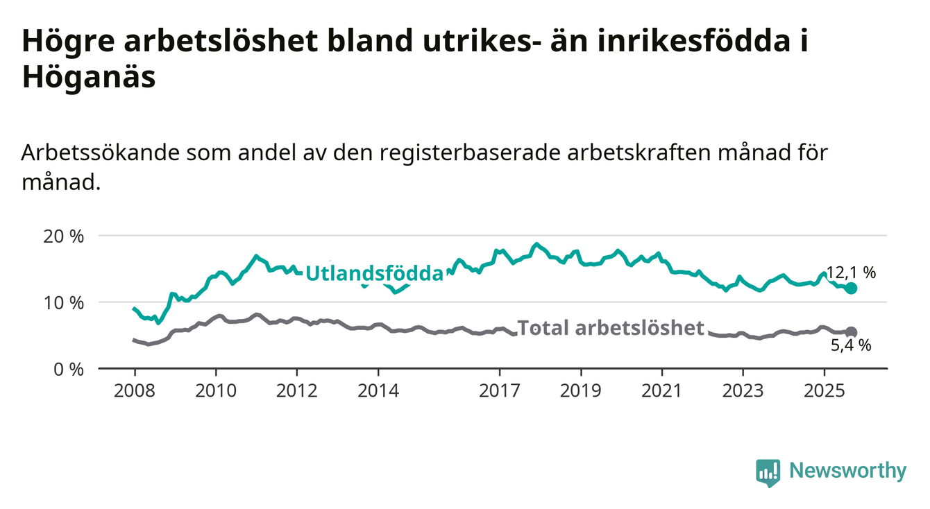 Arbetslösheten bland utlandsfödda var 12,1 procent i Höganäs under september månad, motsvarande 264 av 2 182 personer. Det är 0,8 procentenheter färre än vid samma tidpunkt i fjol (−14 om man räknar personer).