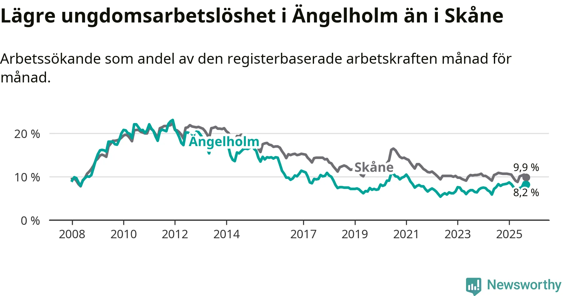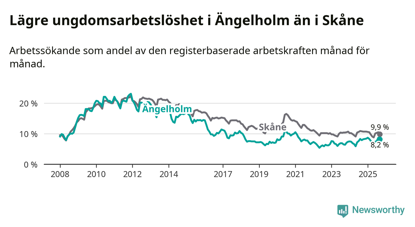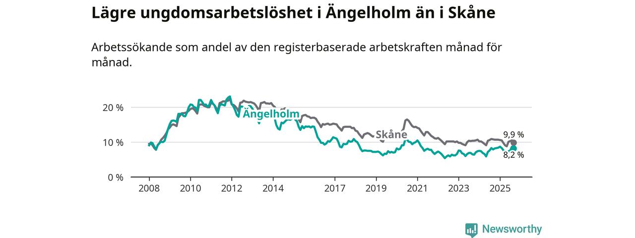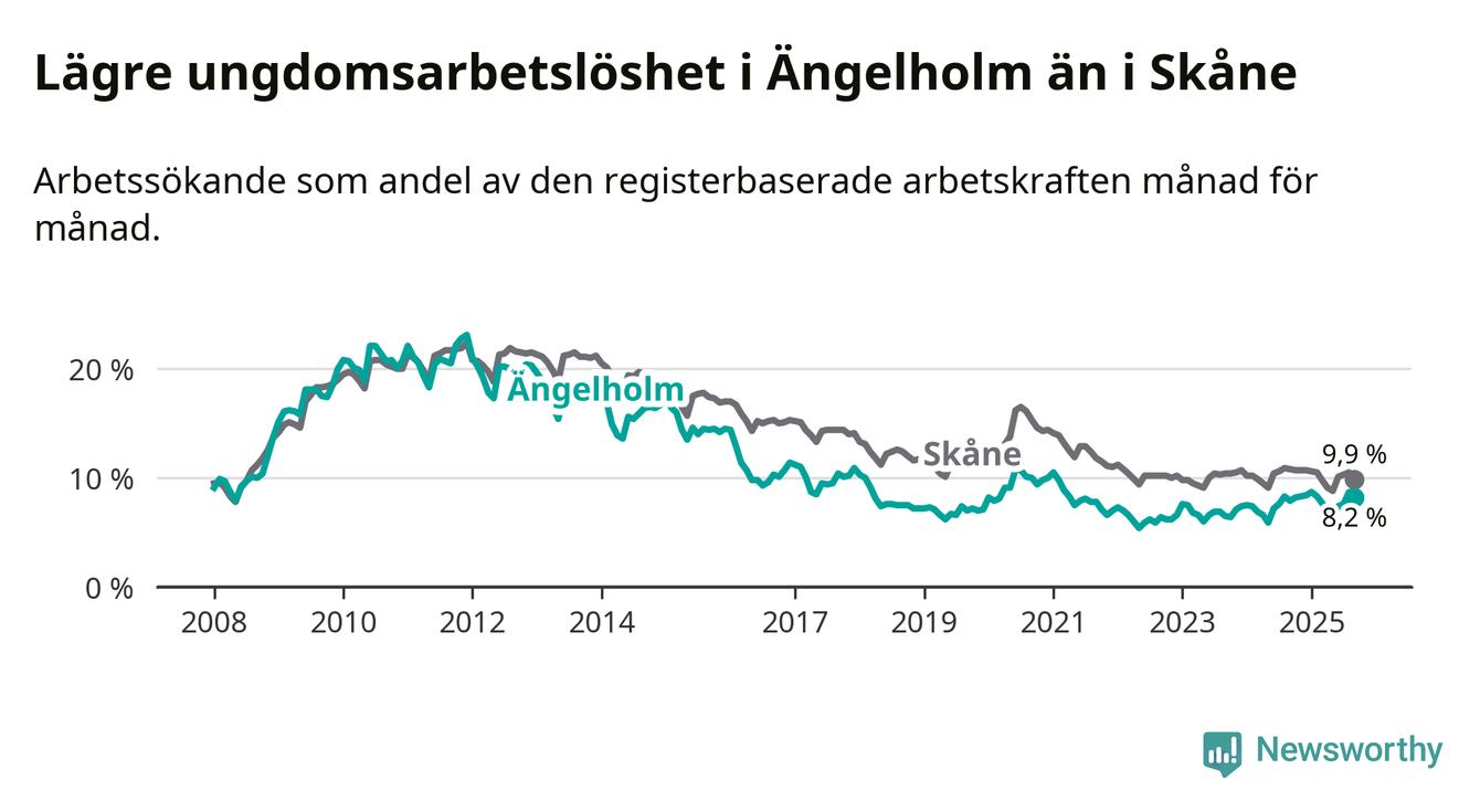 Precis som den totala arbetslösheten ligger ungdomsarbetslösheten i Ängelholm lägre än i Skåne som helhet. Skillnaden mellan kommunen och länet är 1,7 procentenheter.