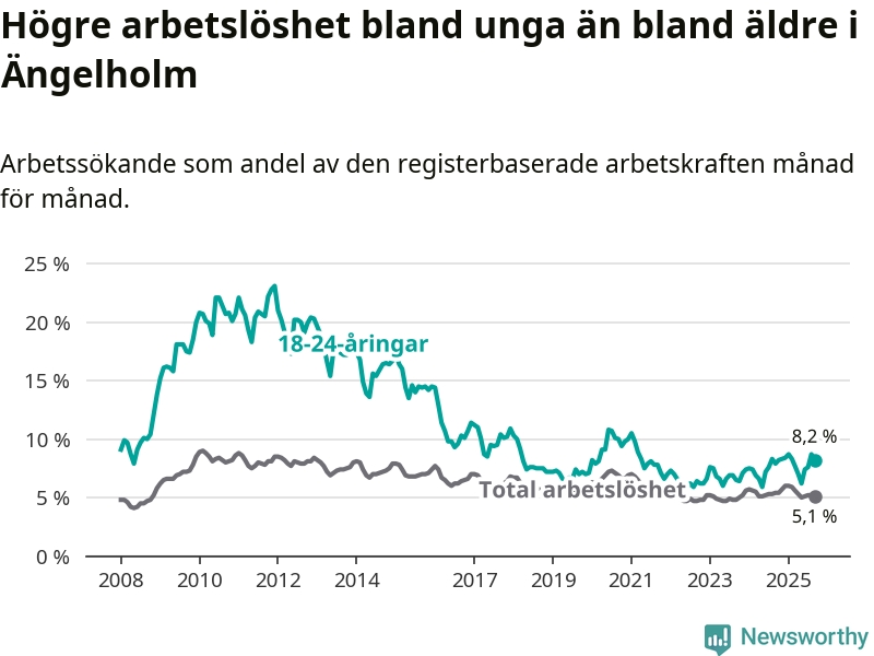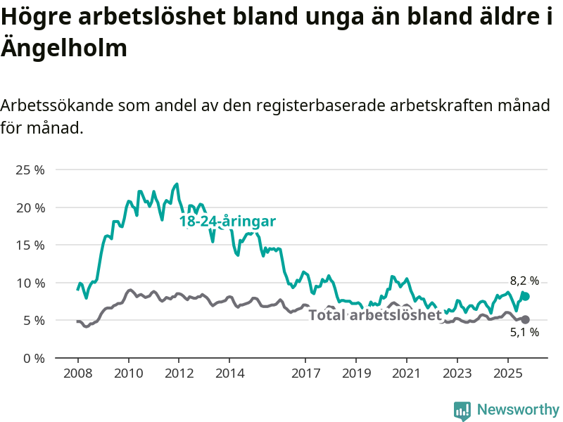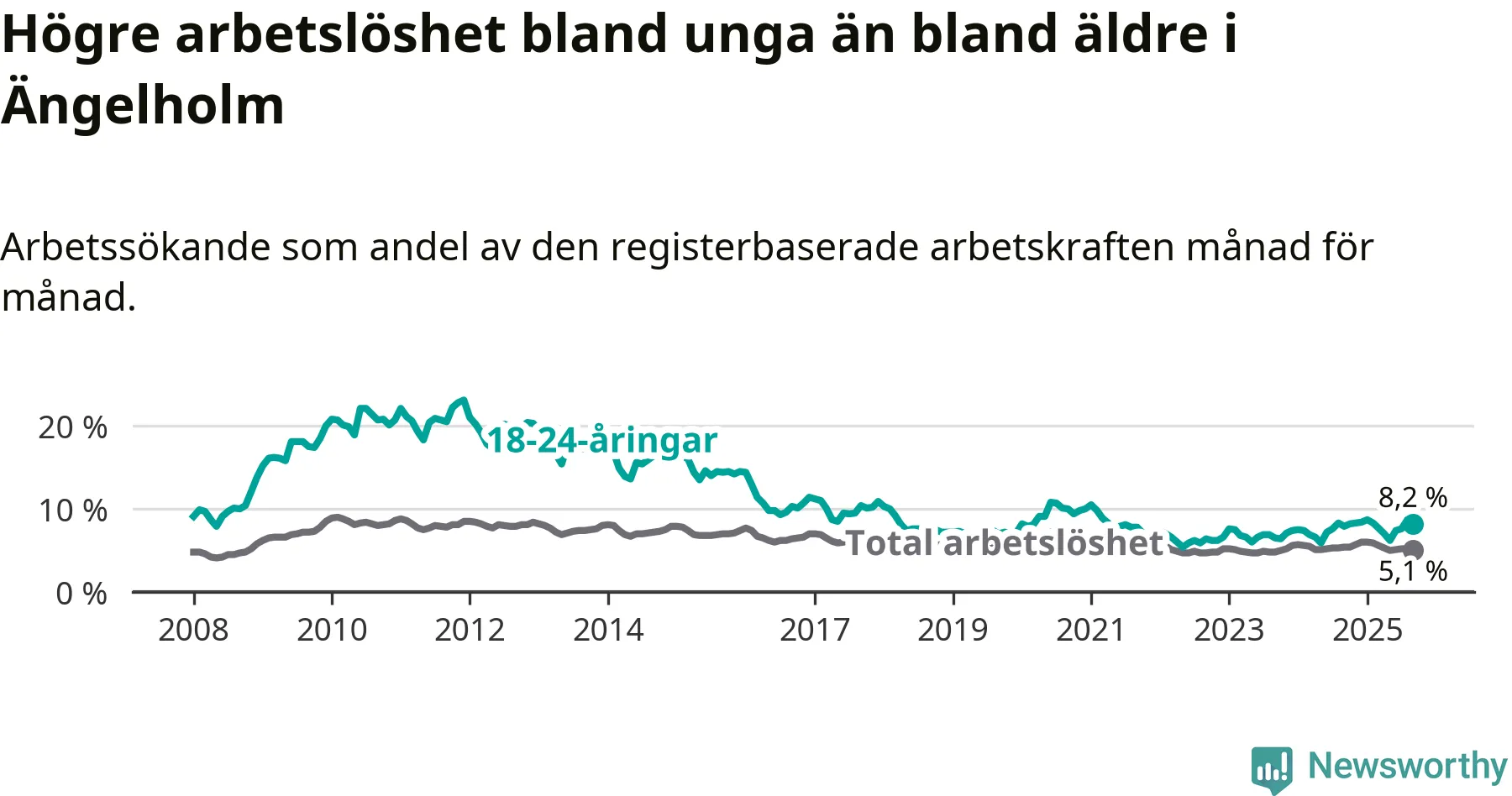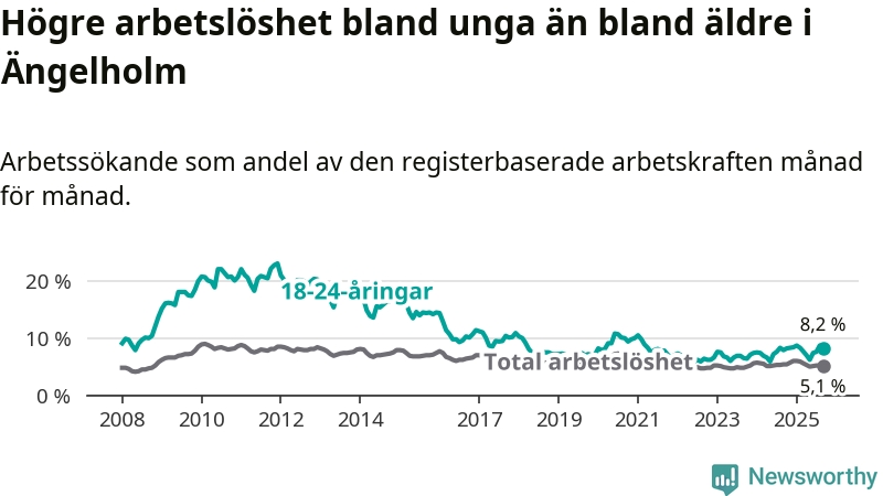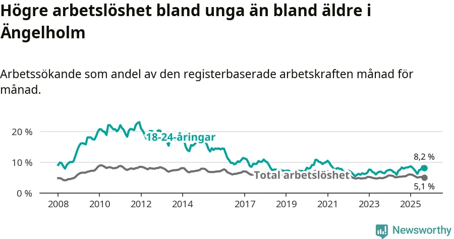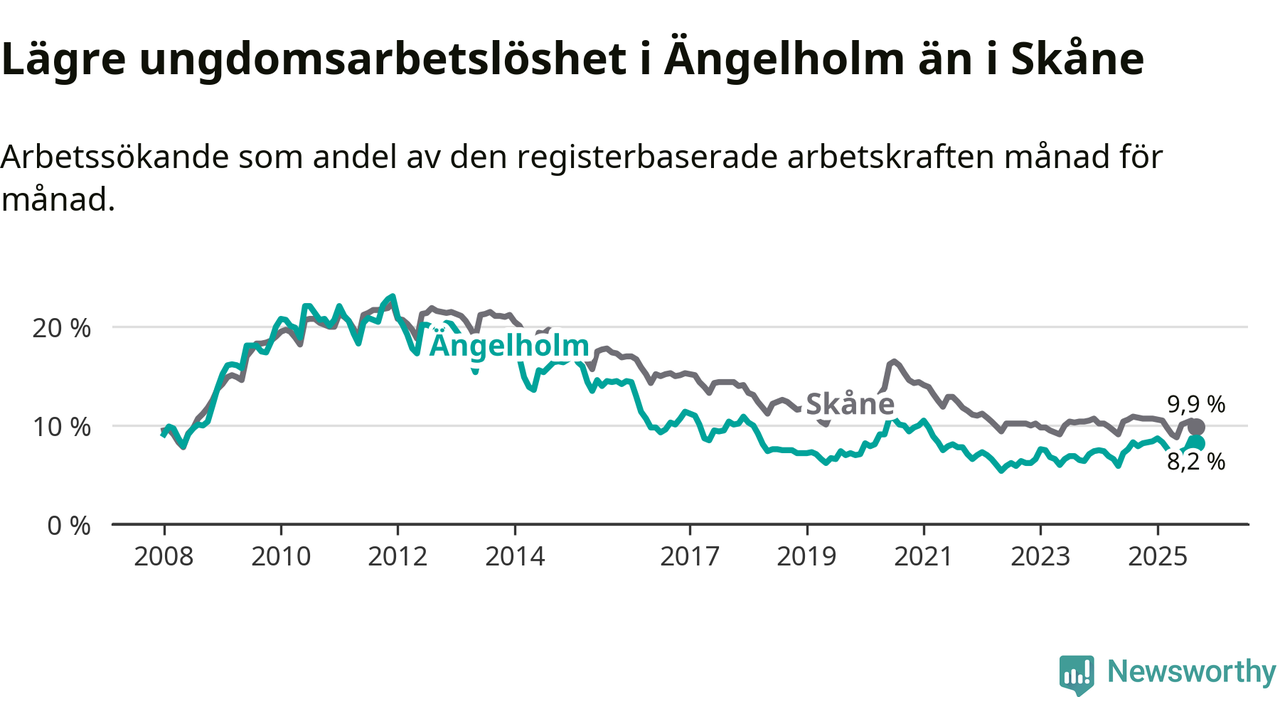Precis som den totala arbetslösheten ligger ungdomsarbetslösheten i Ängelholm lägre än i Skåne som helhet. Skillnaden mellan kommunen och länet är 1,7 procentenheter.