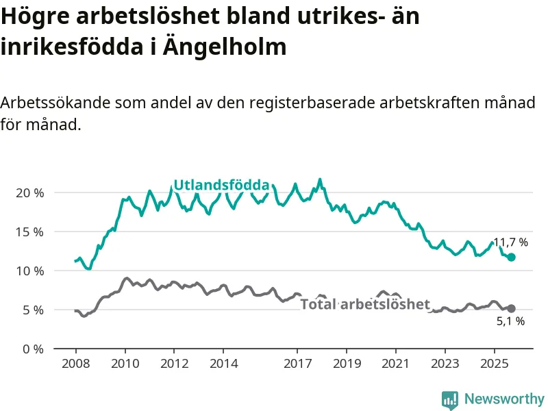 Skillnaden i arbetslöshet mellan utrikesfödda och hela befolkningen är 6,6 procentenheter i Ängelholm. Det är en mindre skillnad än för ett år sedan (−0,6 procentenheter).