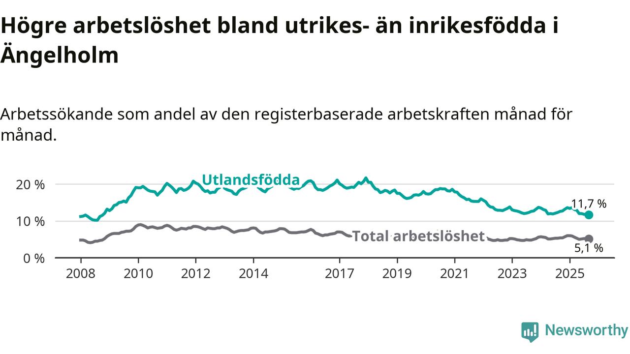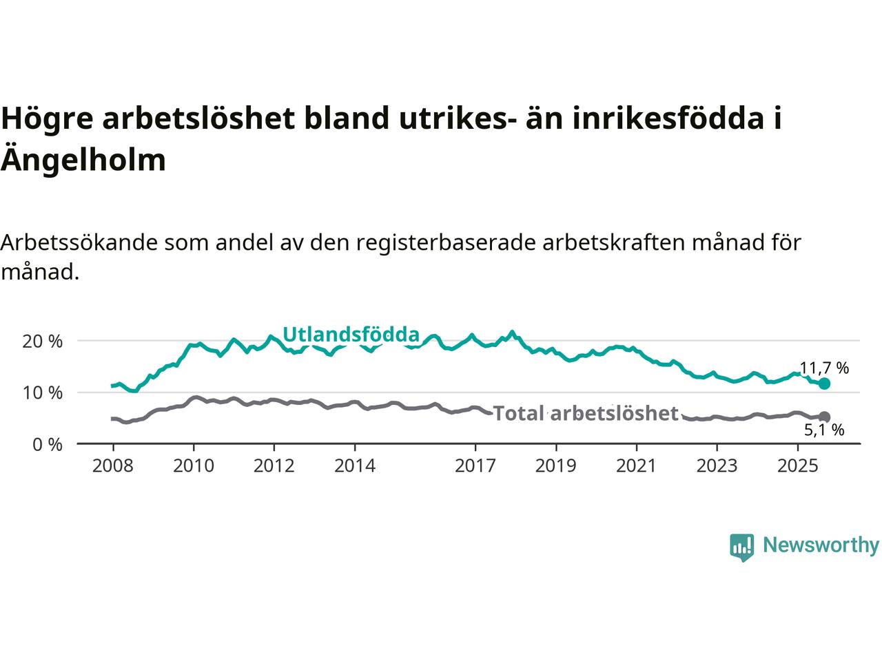 Arbetslösheten bland utlandsfödda var 11,7 procent i Ängelholm under september månad, motsvarande 428 av 3 658 personer. Det är 0,9 procentenheter färre än vid samma tidpunkt i fjol (−19 om man räknar personer). Den nuvarande arbetslöshetsnivån är den lägsta sedan oktober 2008.