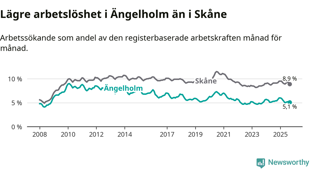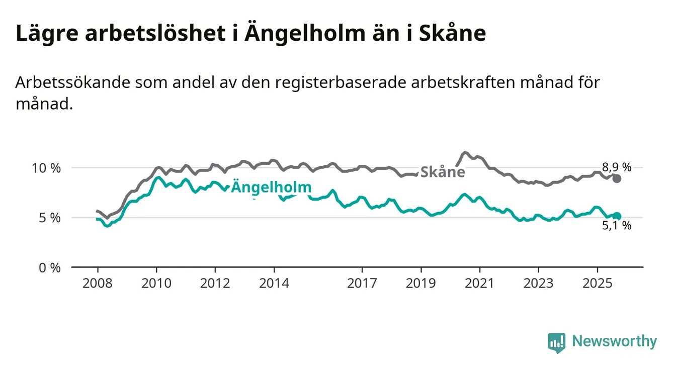 Under september månad rapporterade Ängelholms kommun en total arbetslöshet på 5,1 procent. Det är en minskning jämfört med samma tidpunkt i fjol (−0,3 procentenheter). Även i Skåne län sjunker arbetslösheten .