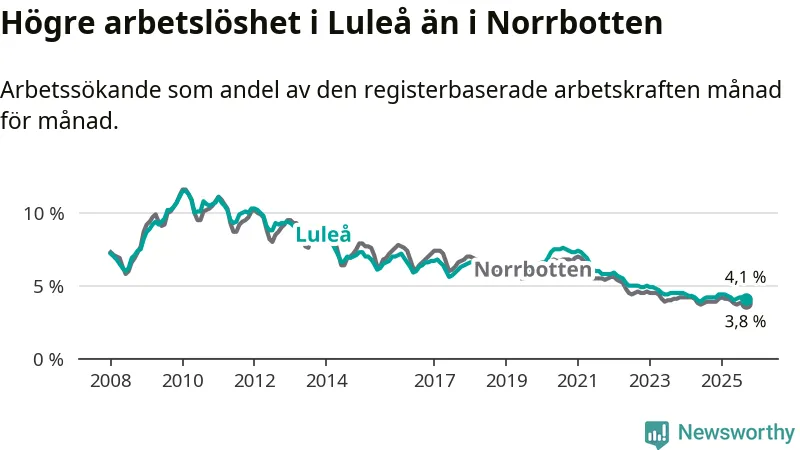 Även om arbetslösheten i Luleå alltså minskar, så ligger den fortfarande över snittet i hela Norrbottens län (4,1 procent i kommunen, jämfört med 3,8 procent i hela länet). Gällivare och Kiruna har den lägsta arbetslösheten i länet (2,6 procent), medan Haparanda och Överkalix har den högsta (6,4 procent). För att Luleå skulle komma ner i samma arbetslöshetsnivå som Gällivare och Kiruna skulle 618 personer behöva sysselsättas.