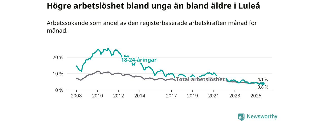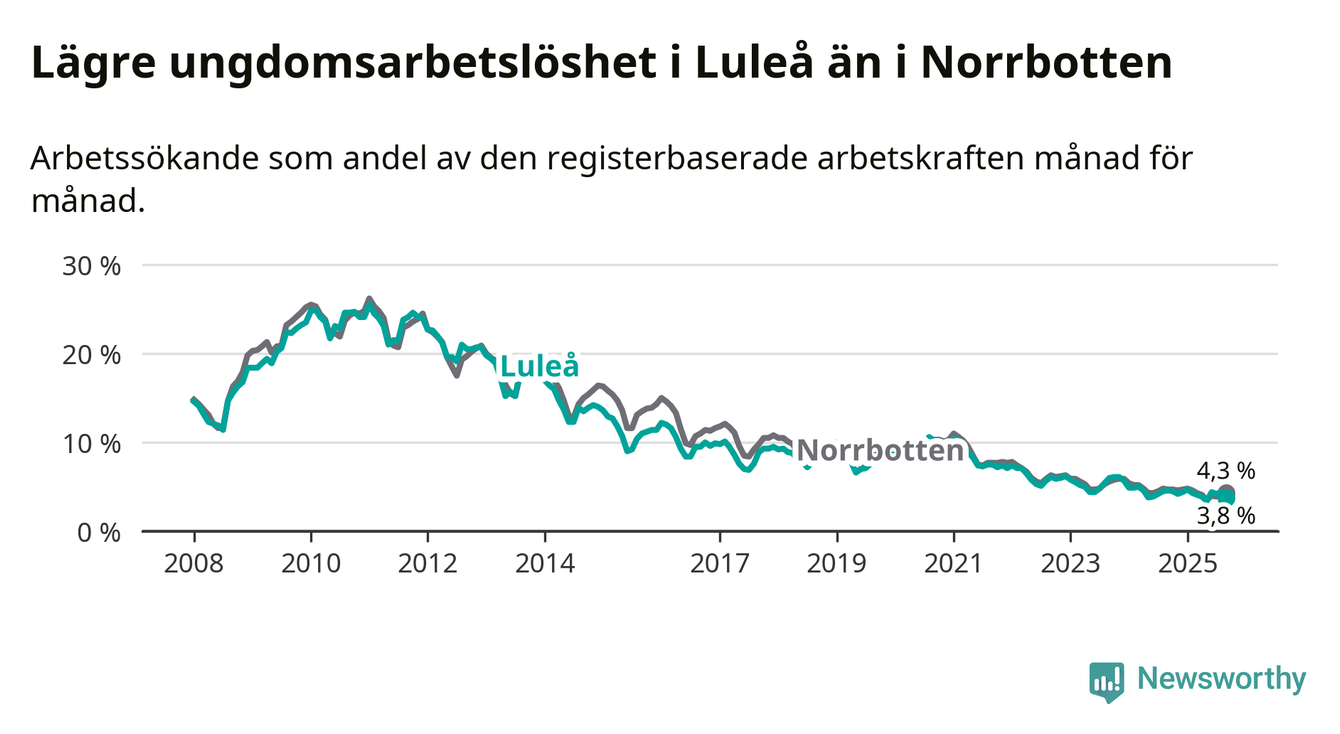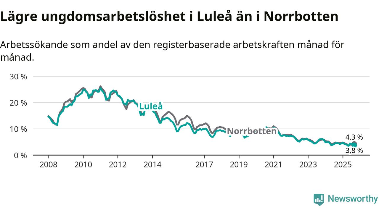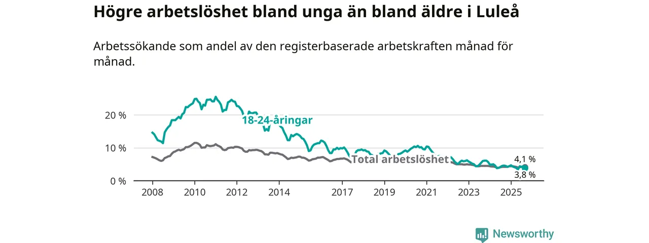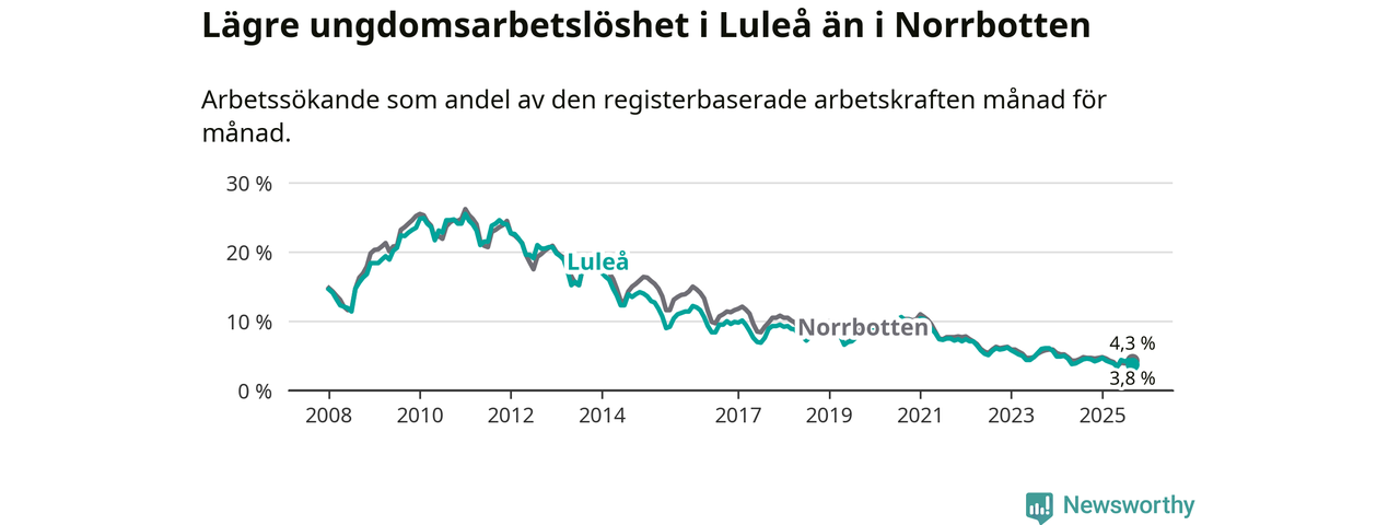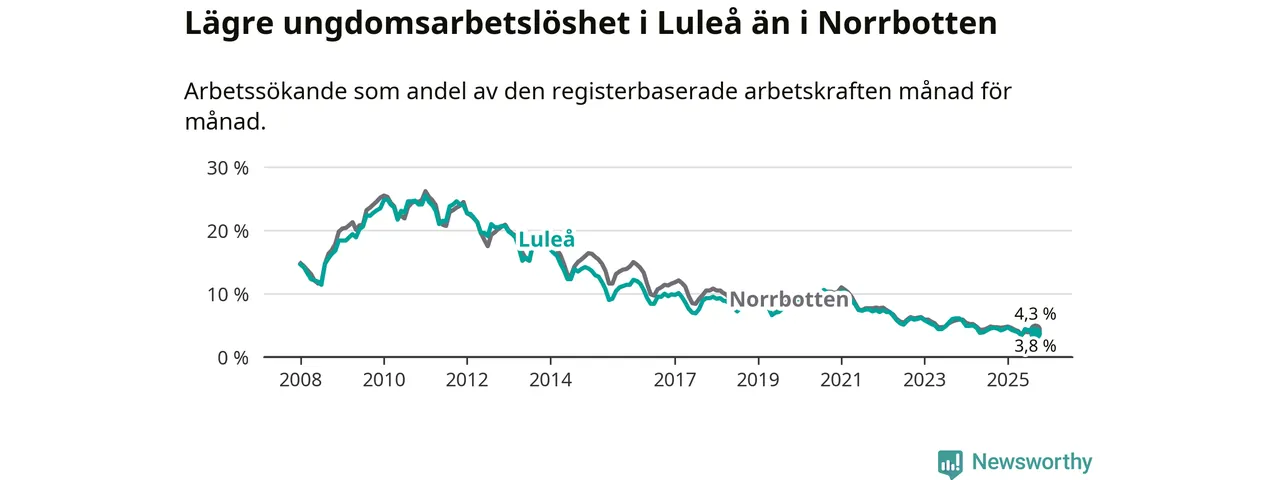 Medan Luleå har högre total arbetslöshet än Norrbotten, ligger ungdomsarbetslösheten 0,5 procentenheter lägre i Luleå.