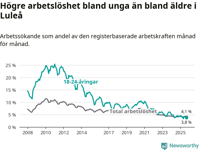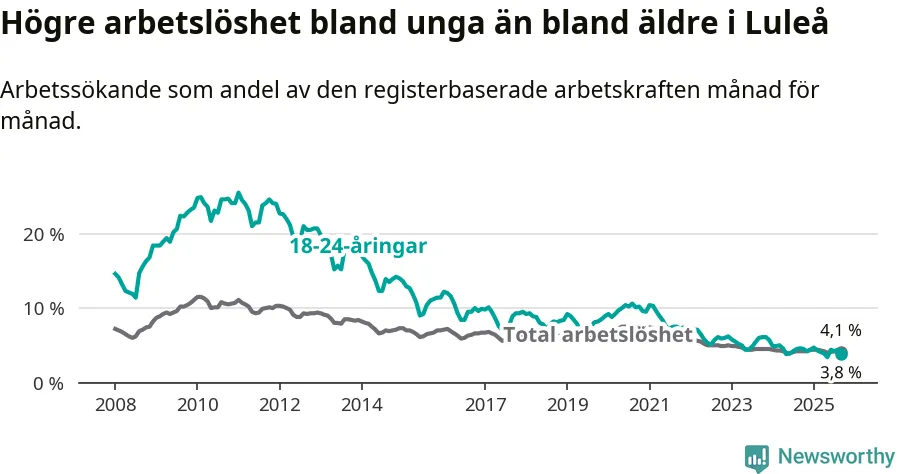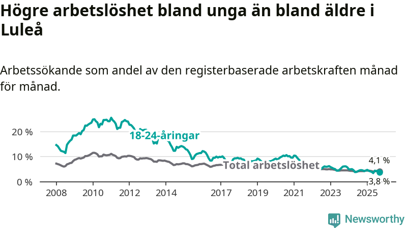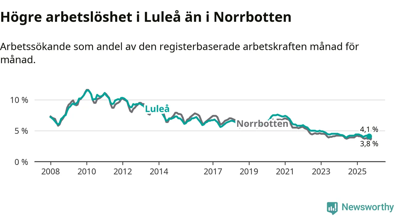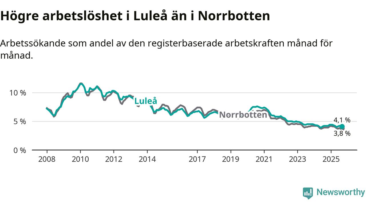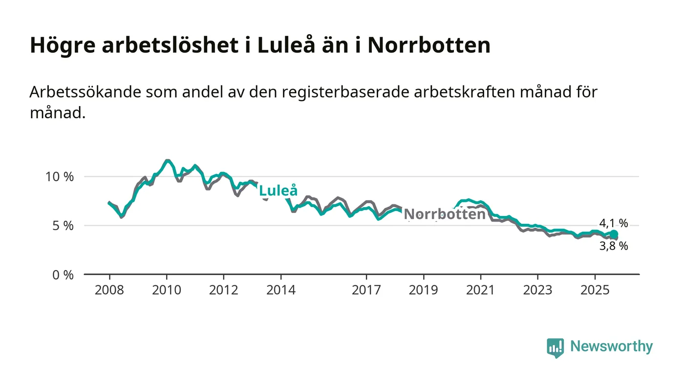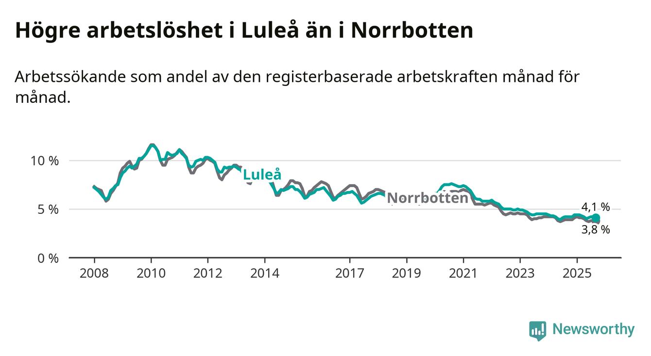 Medan Luleå har högre total arbetslöshet än Norrbotten, ligger ungdomsarbetslösheten 0,5 procentenheter lägre i Luleå.