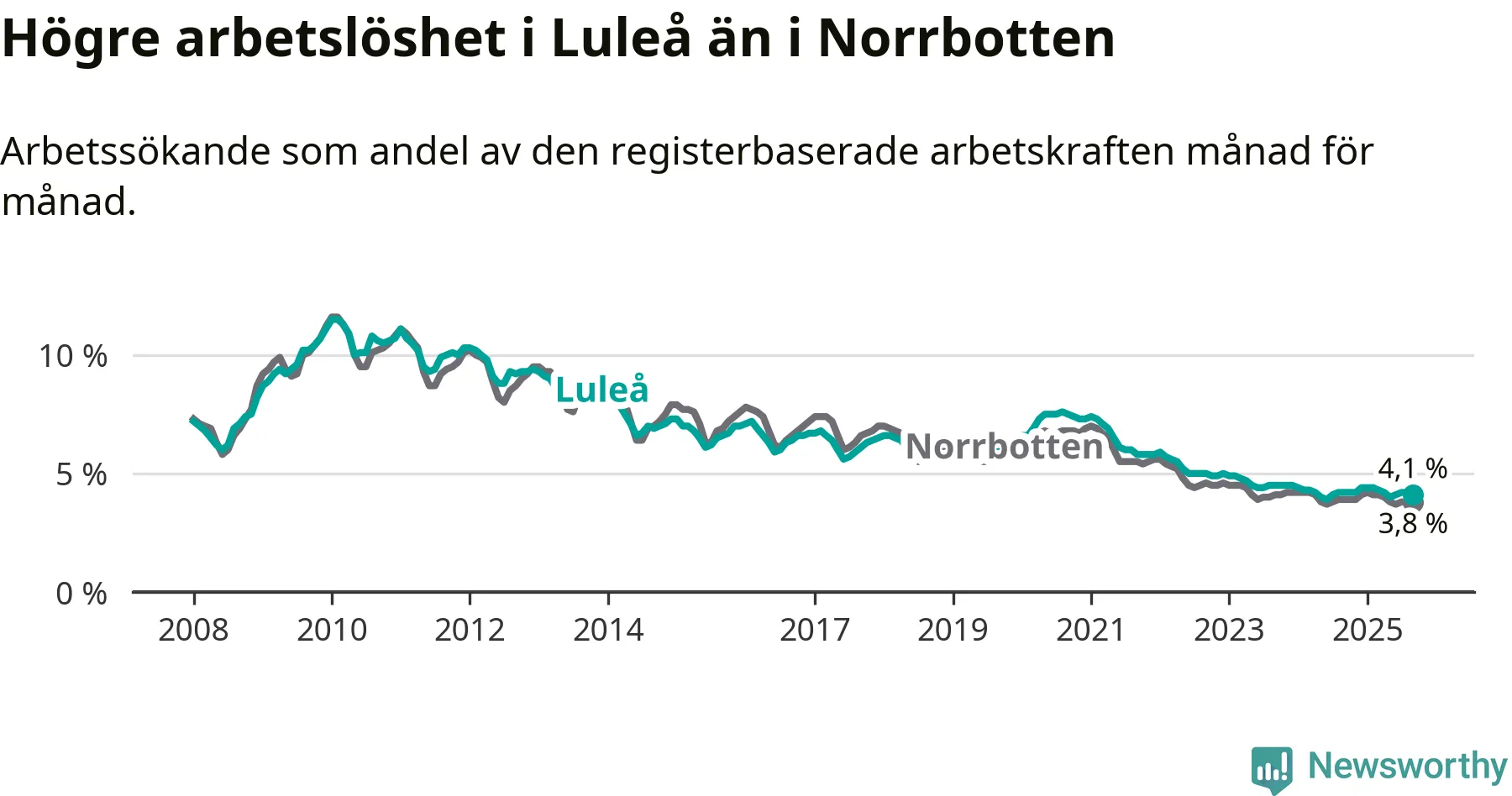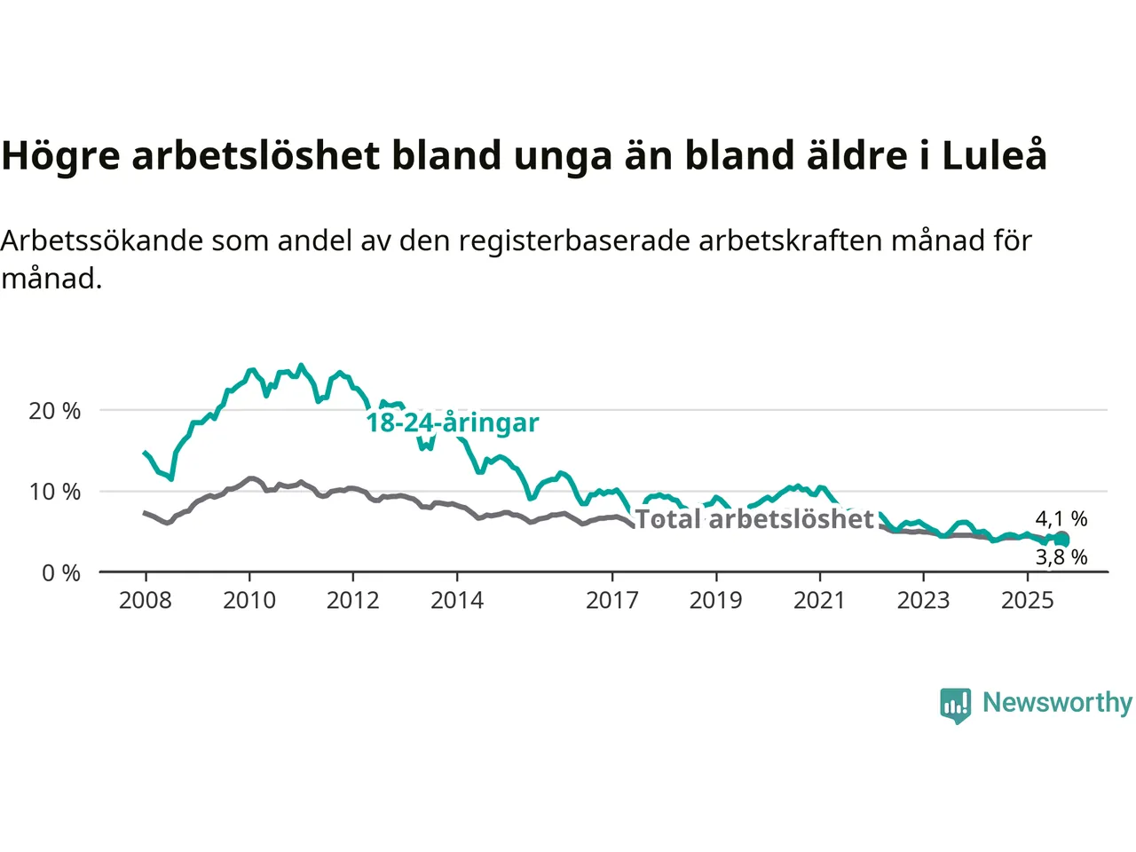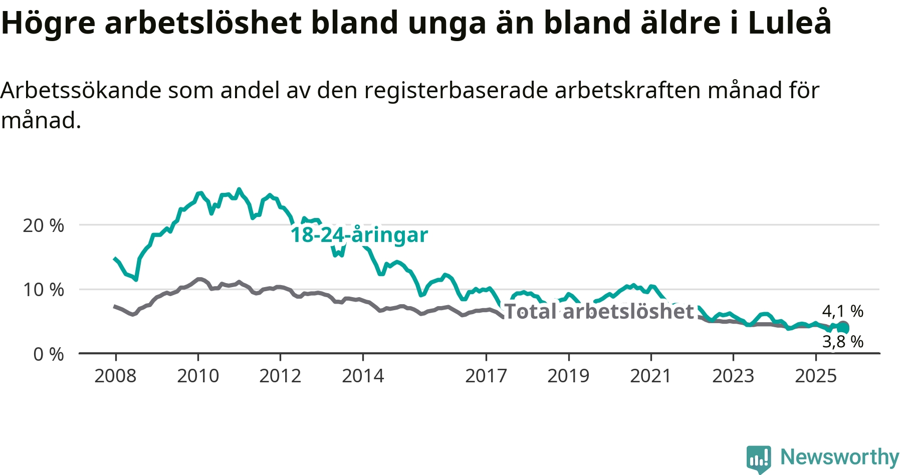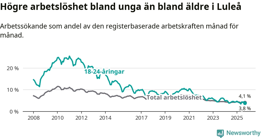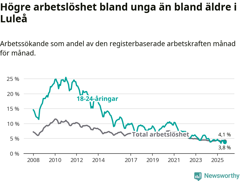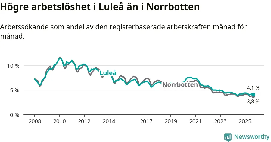 Medan Luleå har högre total arbetslöshet än Norrbotten, ligger ungdomsarbetslösheten 0,5 procentenheter lägre i Luleå.