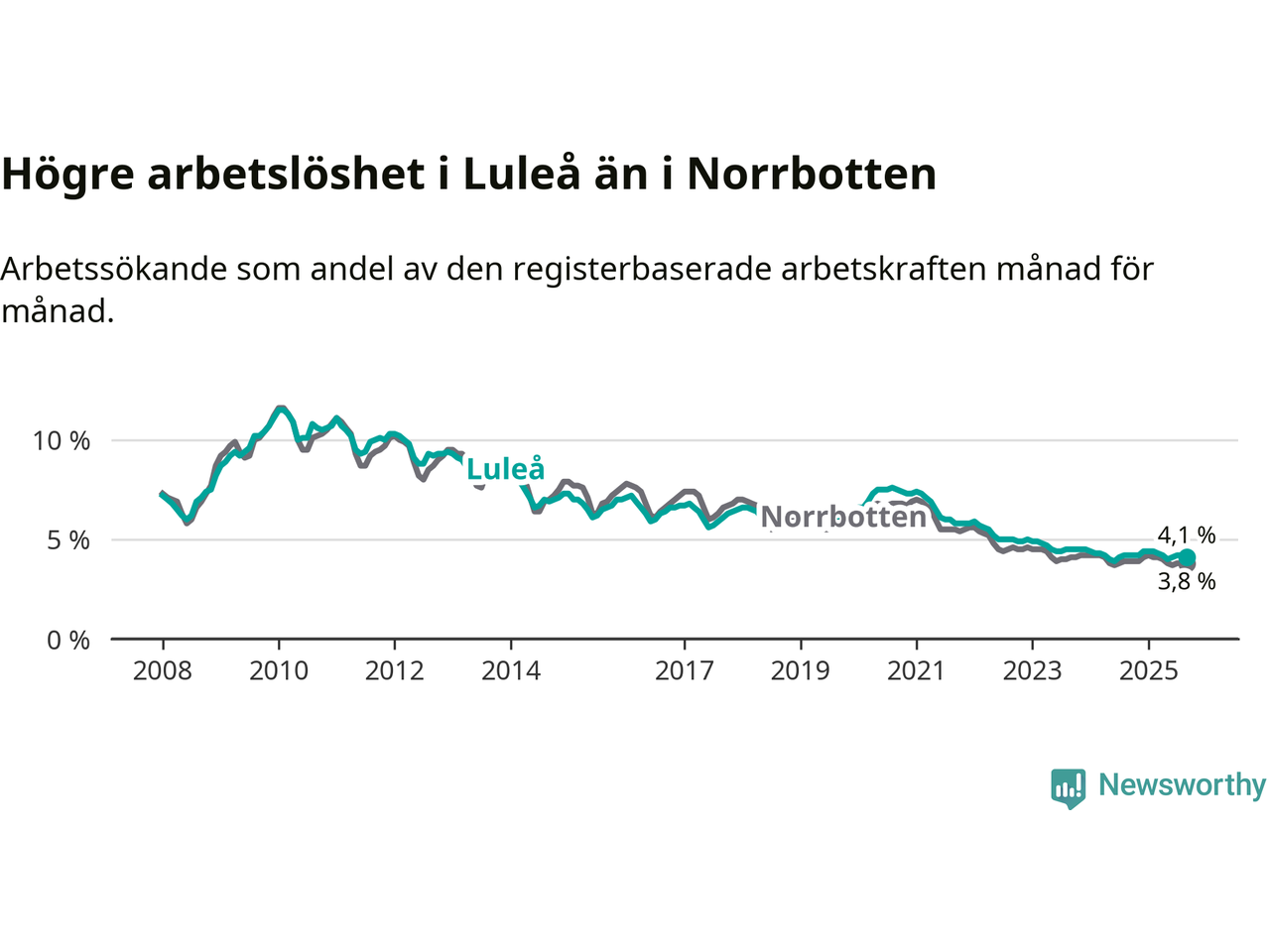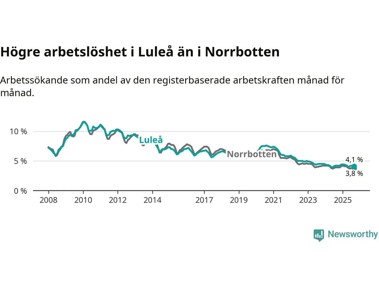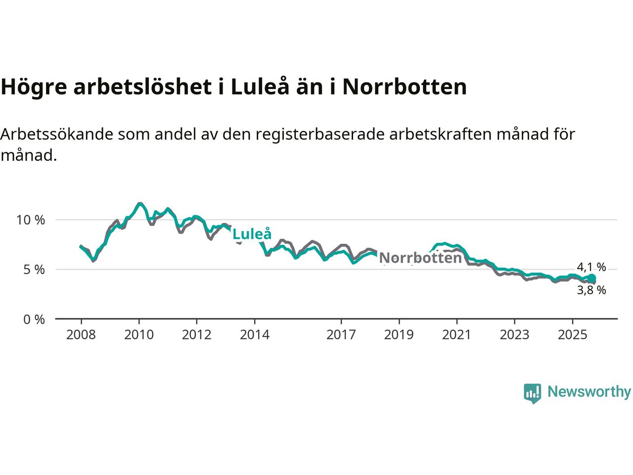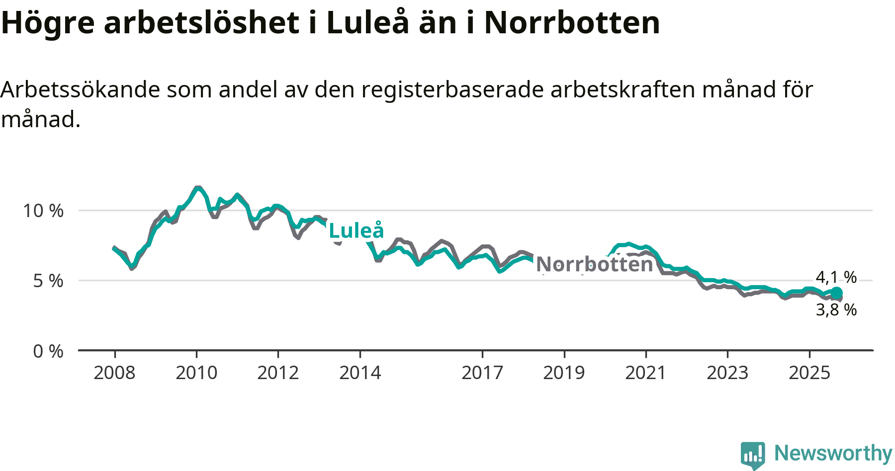 Medan Luleå har högre total arbetslöshet än Norrbotten, ligger ungdomsarbetslösheten 0,5 procentenheter lägre i Luleå.