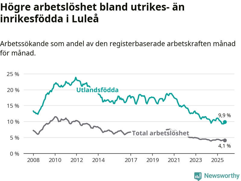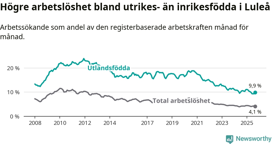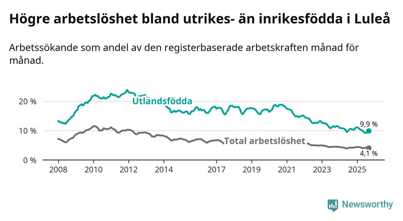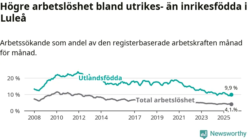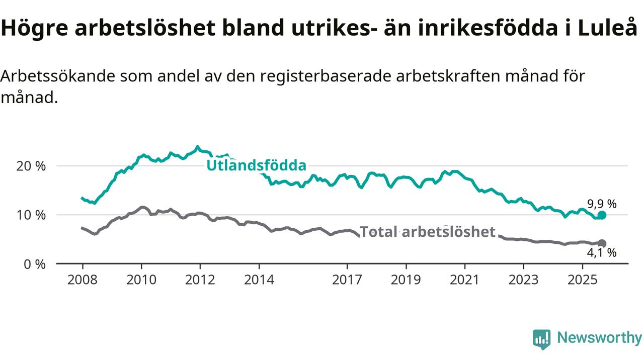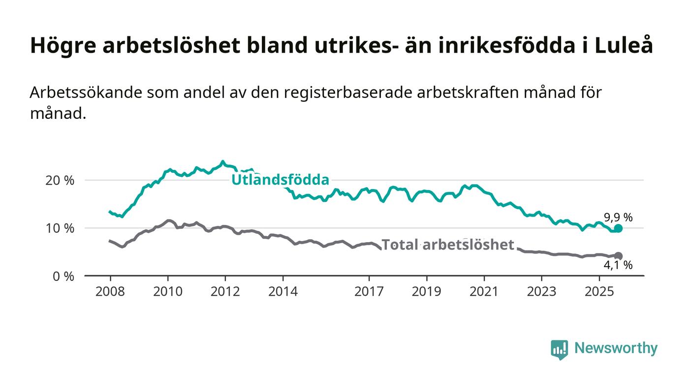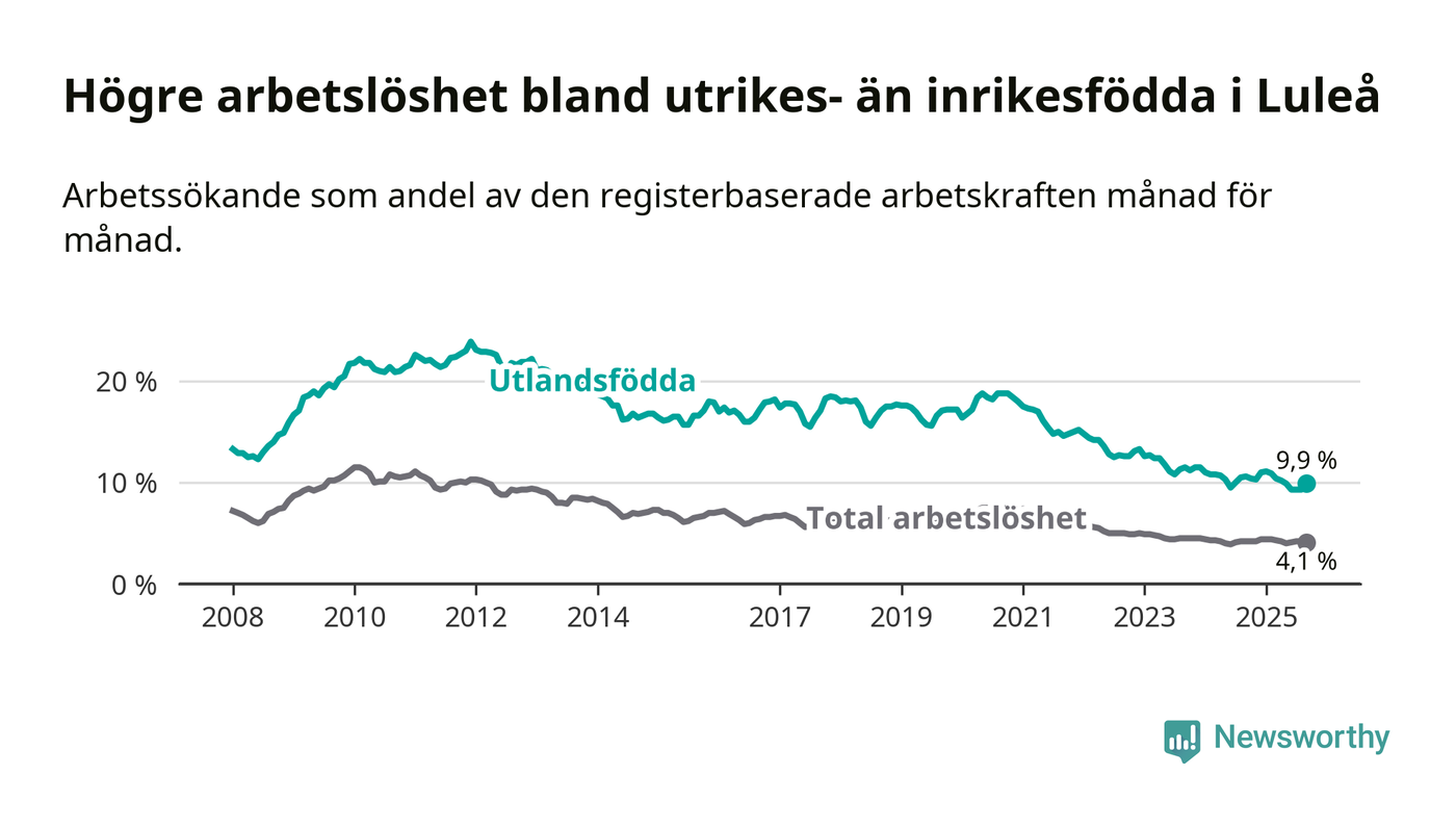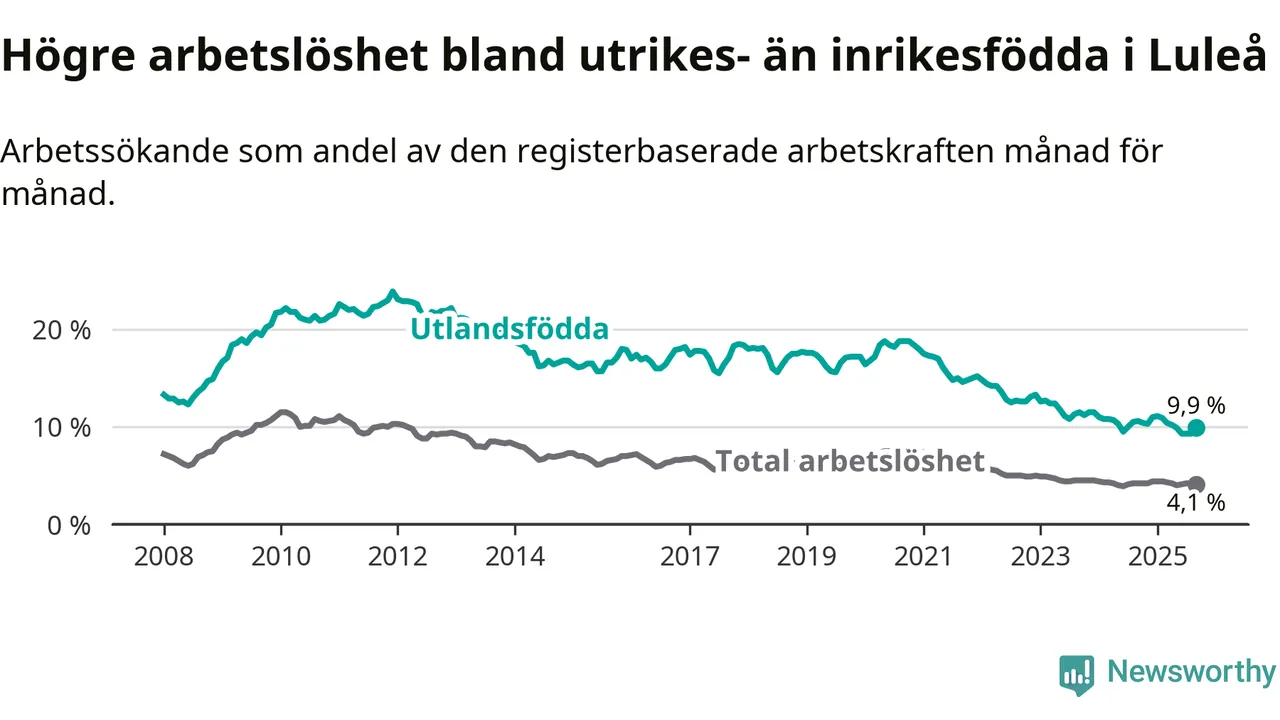 Skillnaden i arbetslöshet mellan utrikesfödda och hela befolkningen är 5,8 procentenheter i Luleå. Det är en mindre skillnad än för ett år sedan (−0,6 procentenheter).
