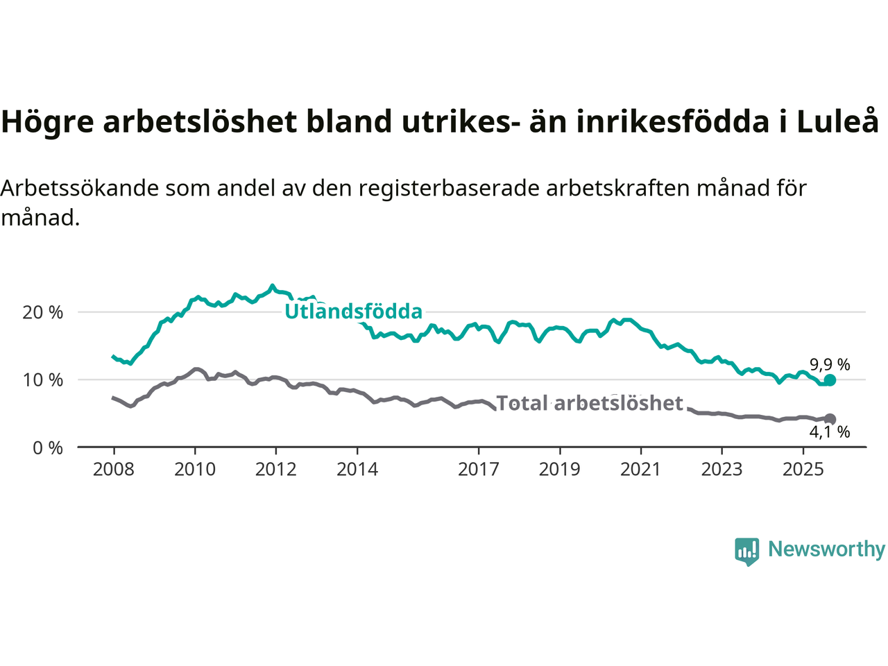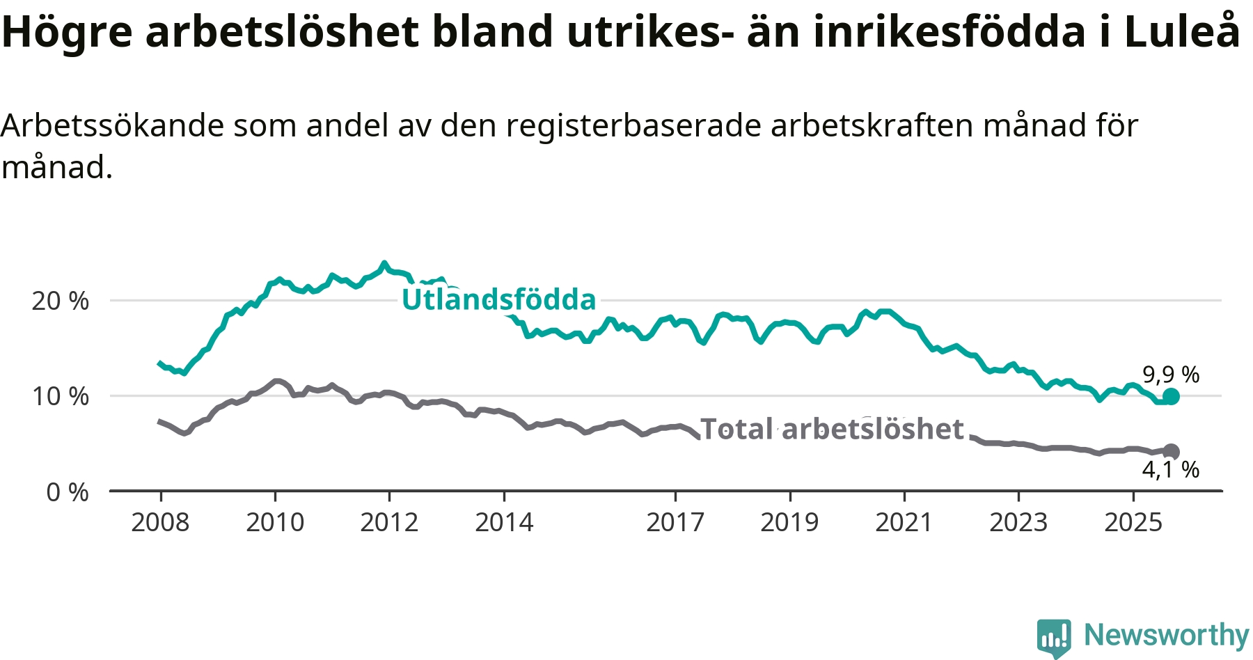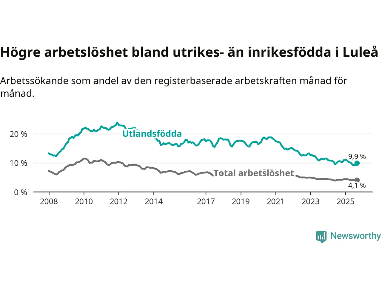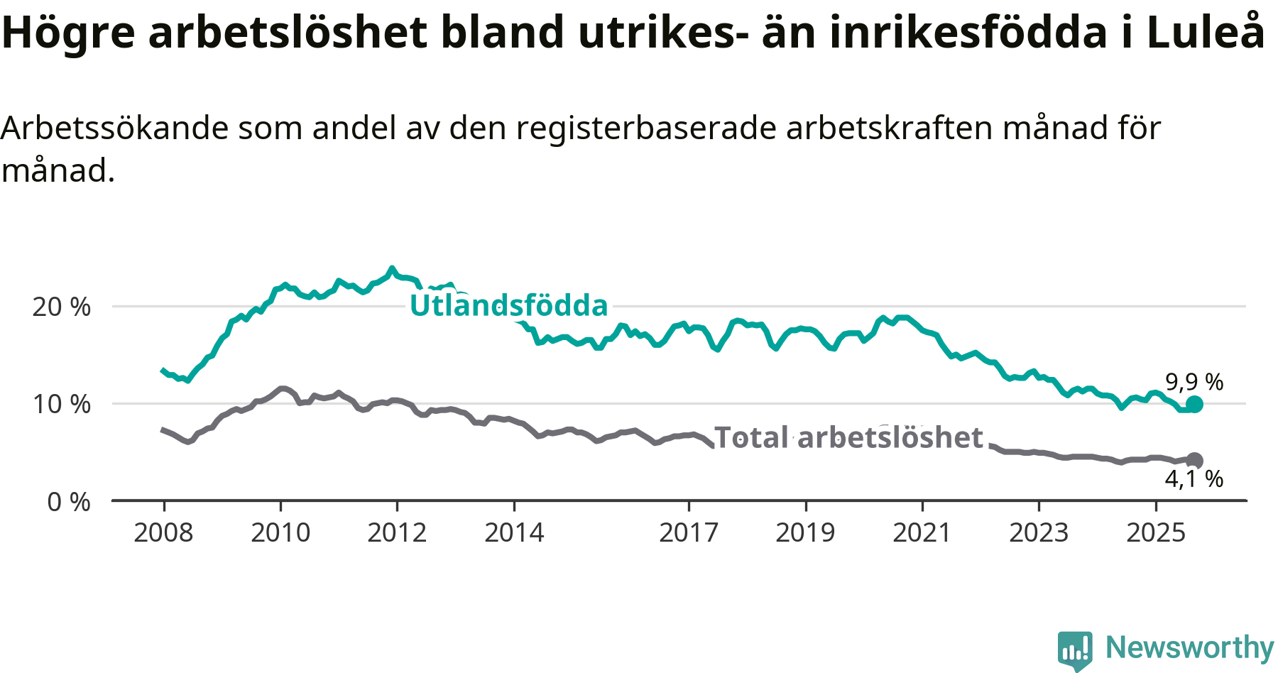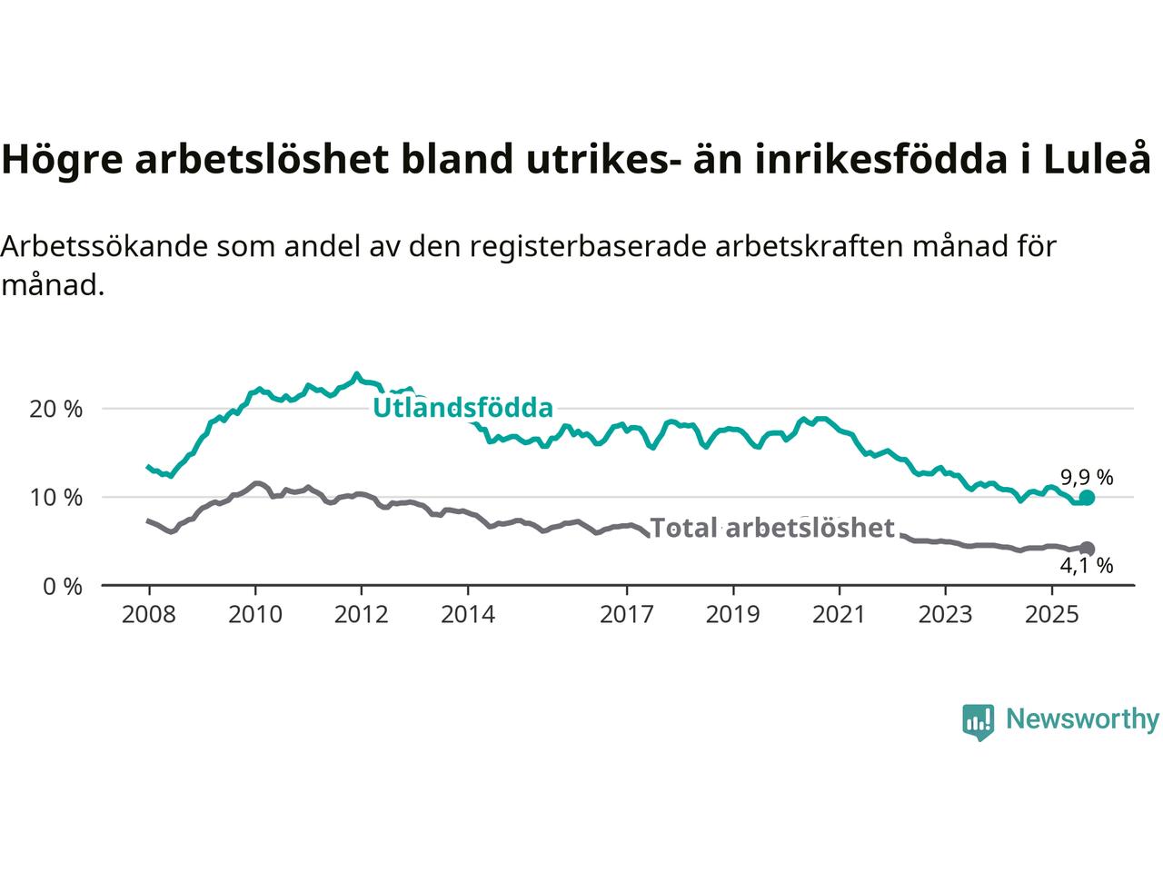 Skillnaden i arbetslöshet mellan utrikesfödda och hela befolkningen är 5,8 procentenheter i Luleå. Det är en mindre skillnad än för ett år sedan (−0,6 procentenheter).