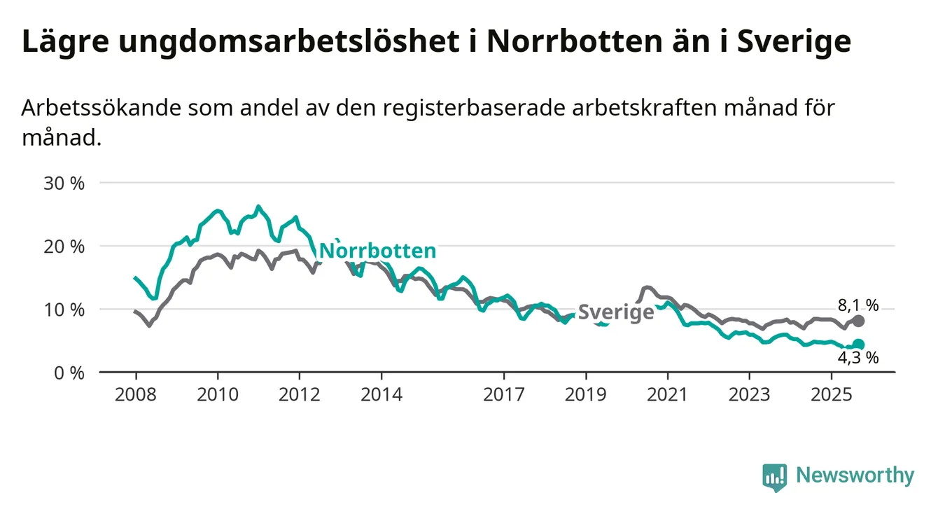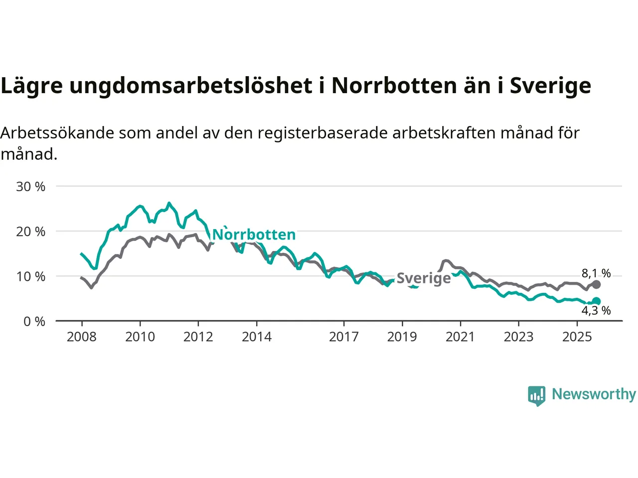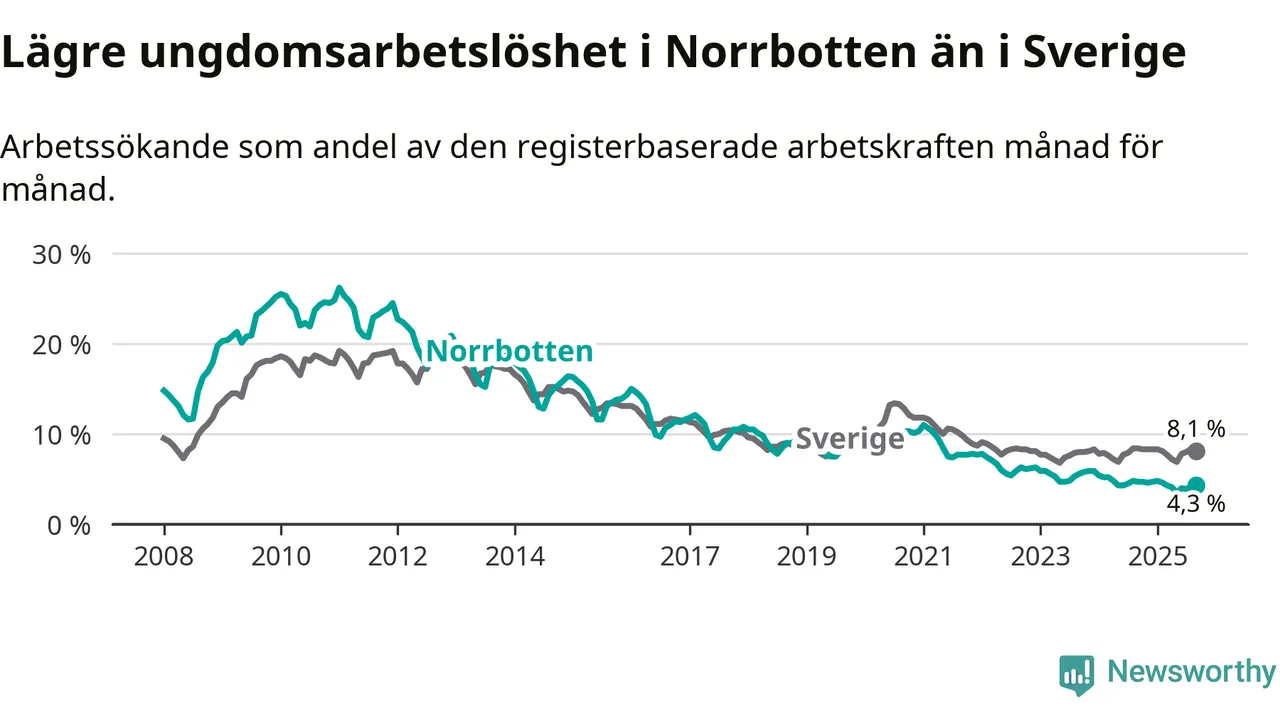 I och med den senaste månadens nedgång har de ungas arbetslöshet i Norrbotten sjunkit över fyra år i sträck (ner från 10,2 procent i mars 2021 till 4,3 procent nu).