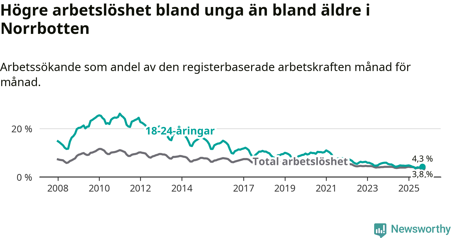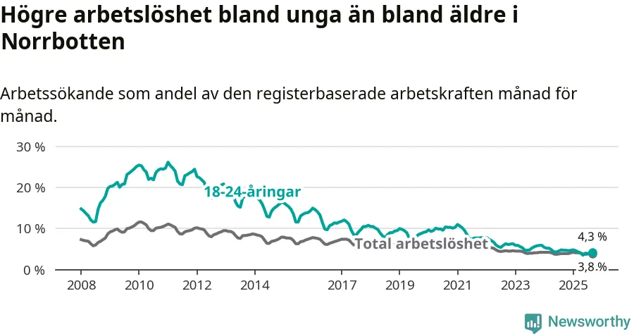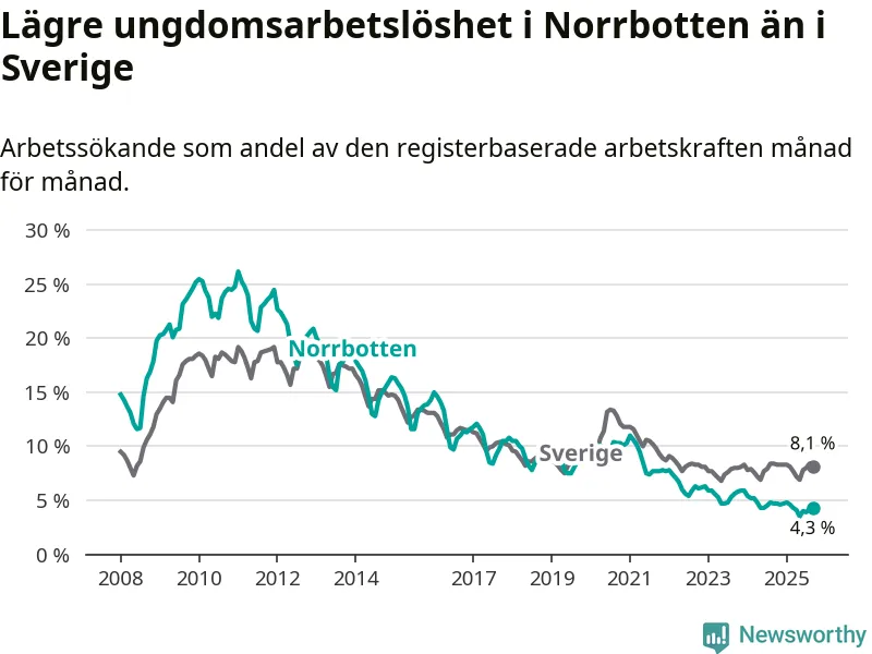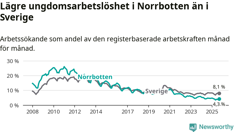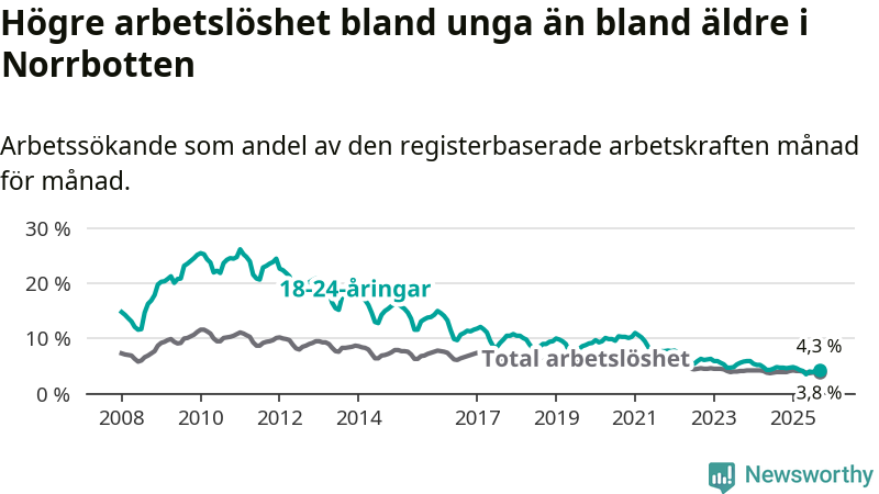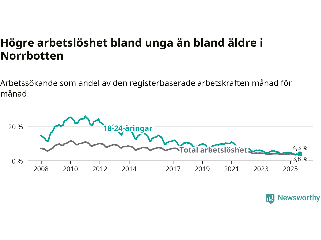 I och med den senaste månadens nedgång har de ungas arbetslöshet i Norrbotten sjunkit över fyra år i sträck (ner från 10,2 procent i mars 2021 till 4,3 procent nu).