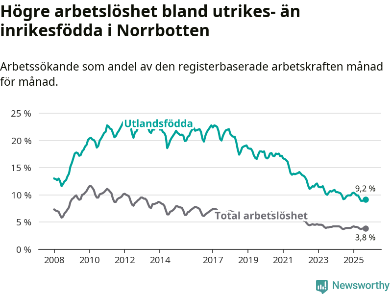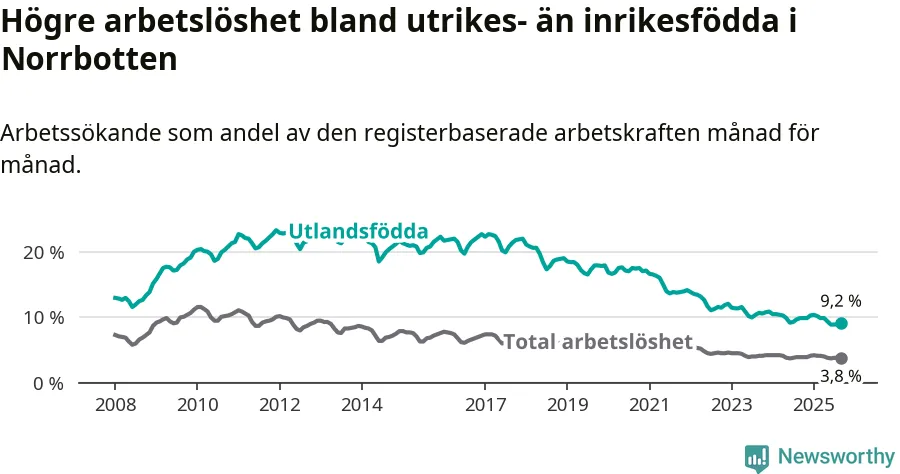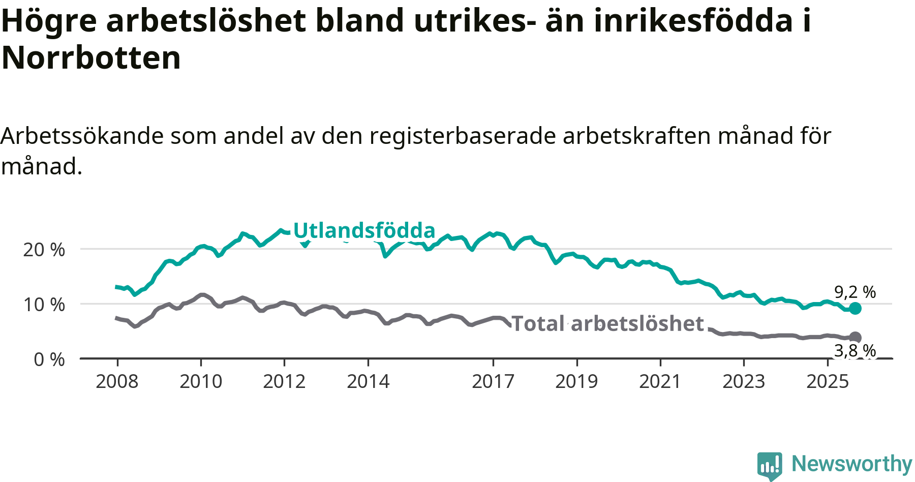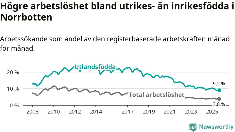 Skillnaden i arbetslöshet mellan utrikesfödda och hela befolkningen är 5,4 procentenheter i Norrbotten. Det är en mindre skillnad än för ett år sedan (−0,6 procentenheter).