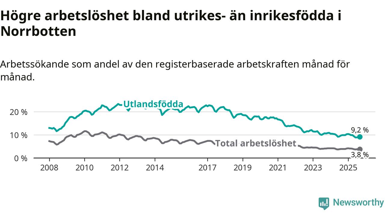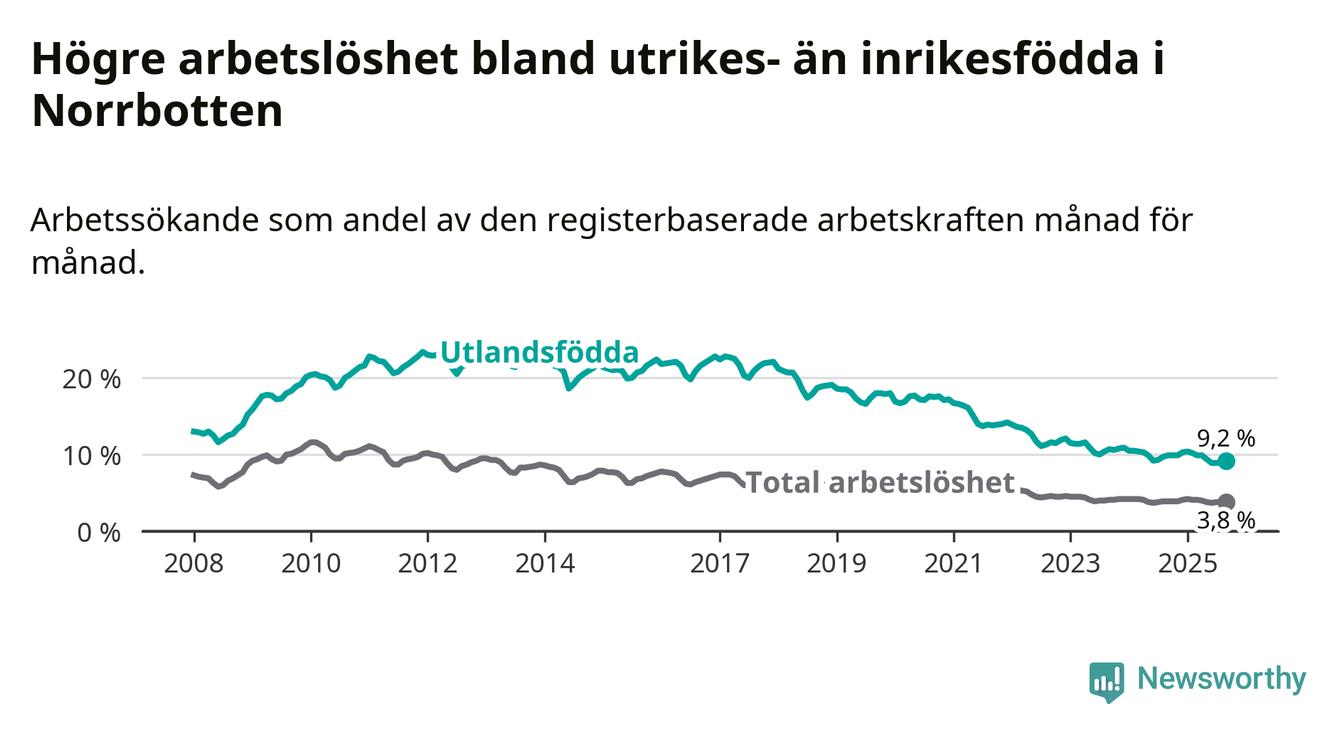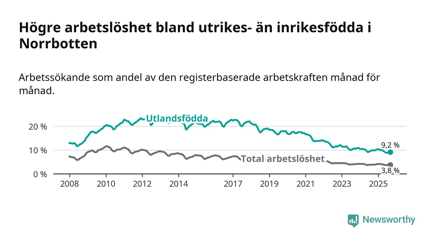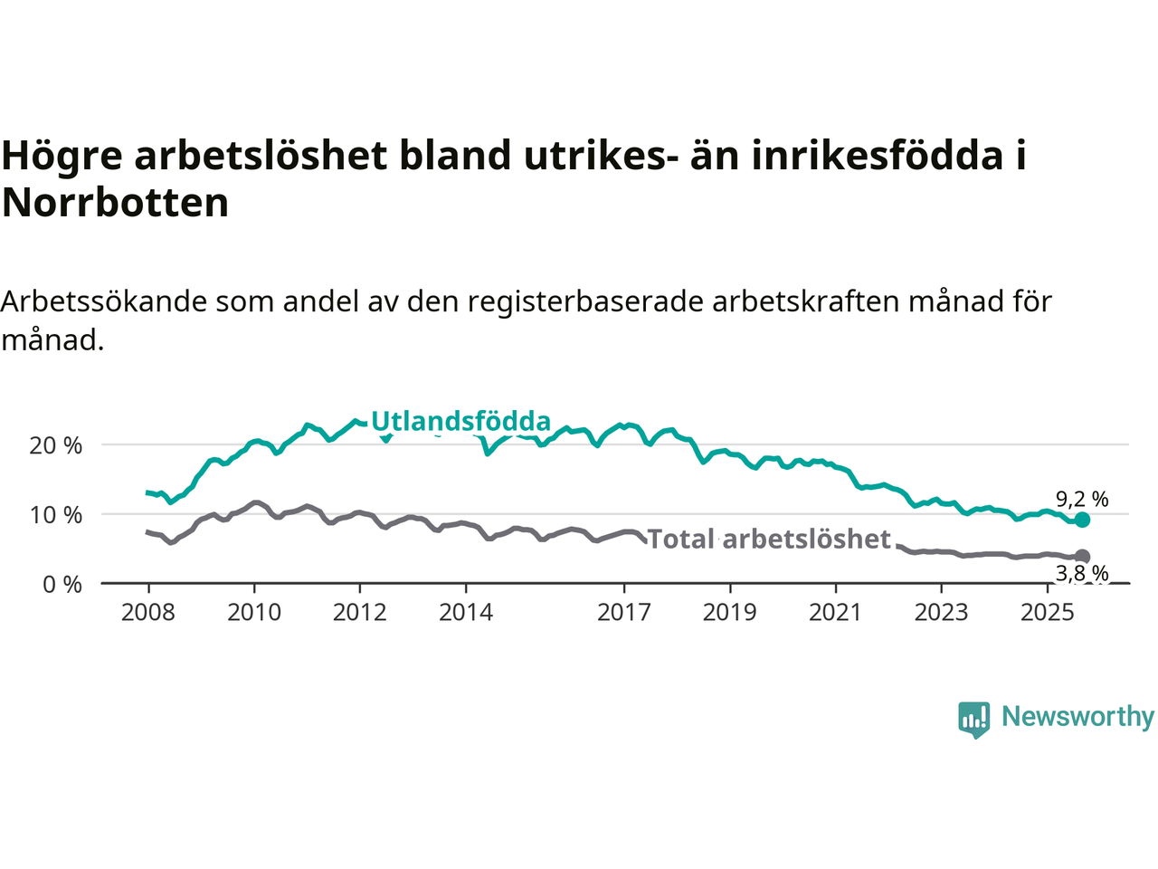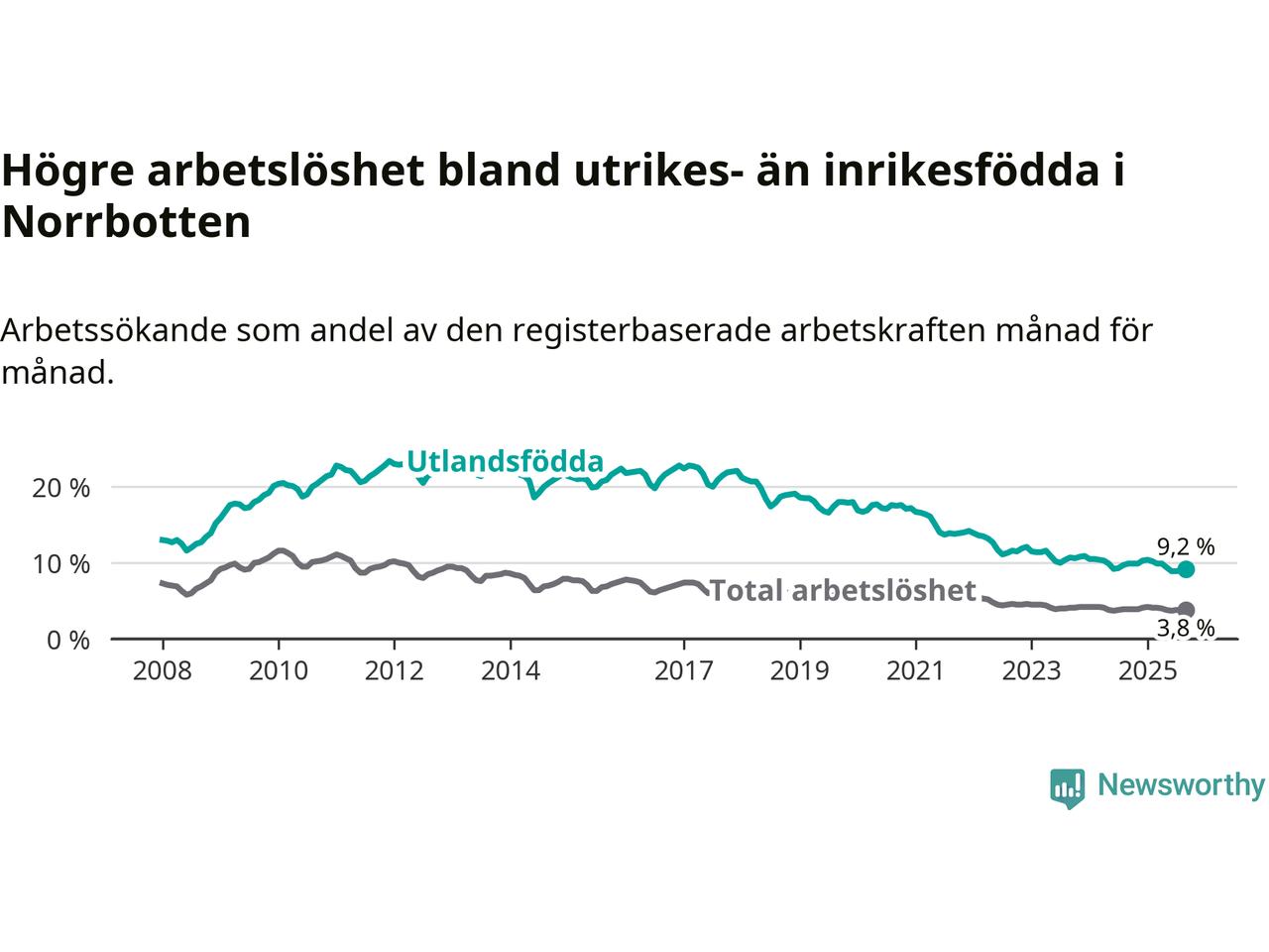 Arbetslösheten bland utlandsfödda var 9,2 procent i Norrbotten under september månad, motsvarande 1 666 av 18 109 personer. Det är 0,7 procentenheter färre än vid samma tidpunkt i fjol (−72 om man räknar personer). Därmed har de utlandsföddas arbetslöshet varit lägre än vid samma tidpunkt i fjol i över fem år i sträck. Sedan augusti 2020 har arbetslösheten bland utlandsfödda minskat från 17,6 till 9,2 procent.