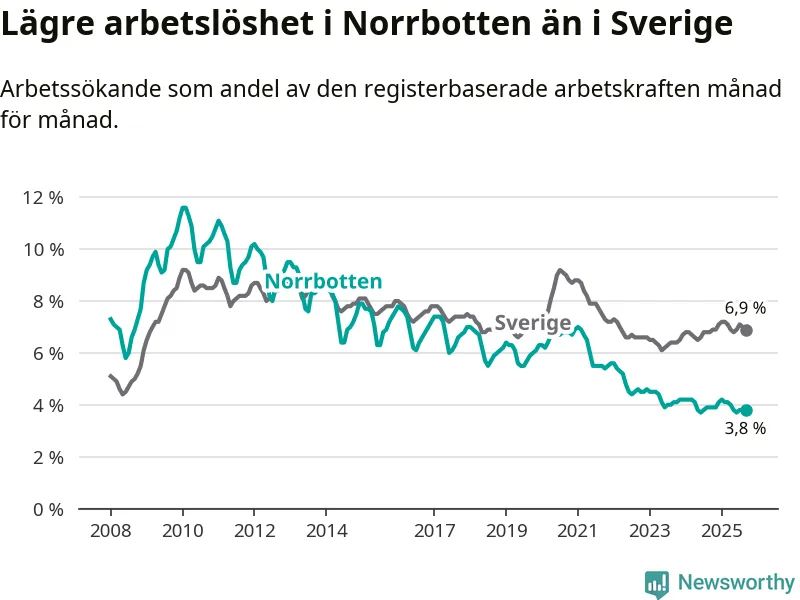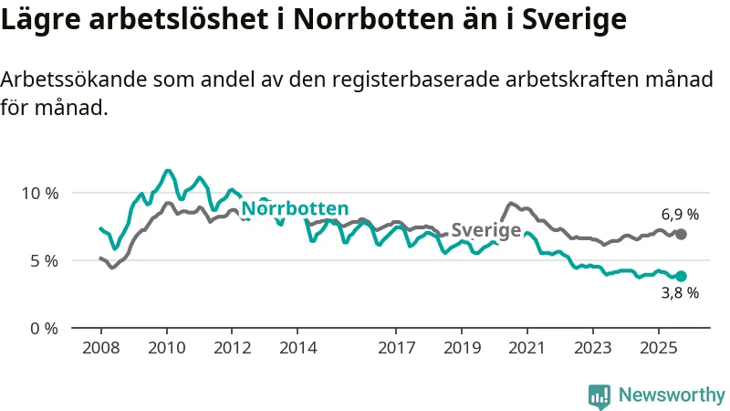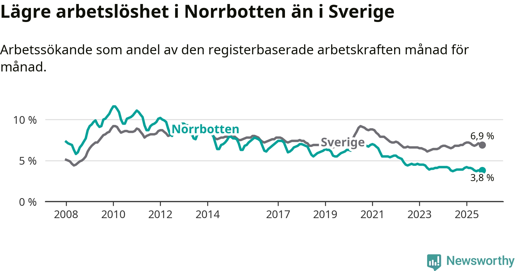 Norrbotten hade redan tidigare lägre arbetslöshet än snittet i hela Sverige och nu växer klyftan (3,8 procent i länet, jämfört med 6,9 procent i hela riket). Norrbotten har därmed även den lägsta arbetslöshetsnivån i riket. Skåne har den högsta (8,9 procent).
