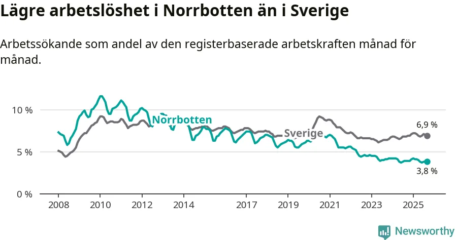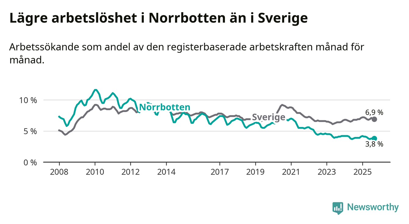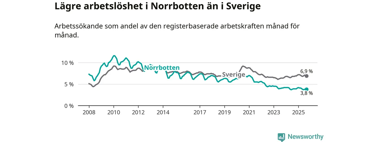 Under september månad rapporterade Norrbottens län en total arbetslöshet på 3,8 procent. Det är en minskning jämfört med samma tidpunkt i fjol (−0,1 procentenheter). I Sverige däremot stiger arbetslösheten något.