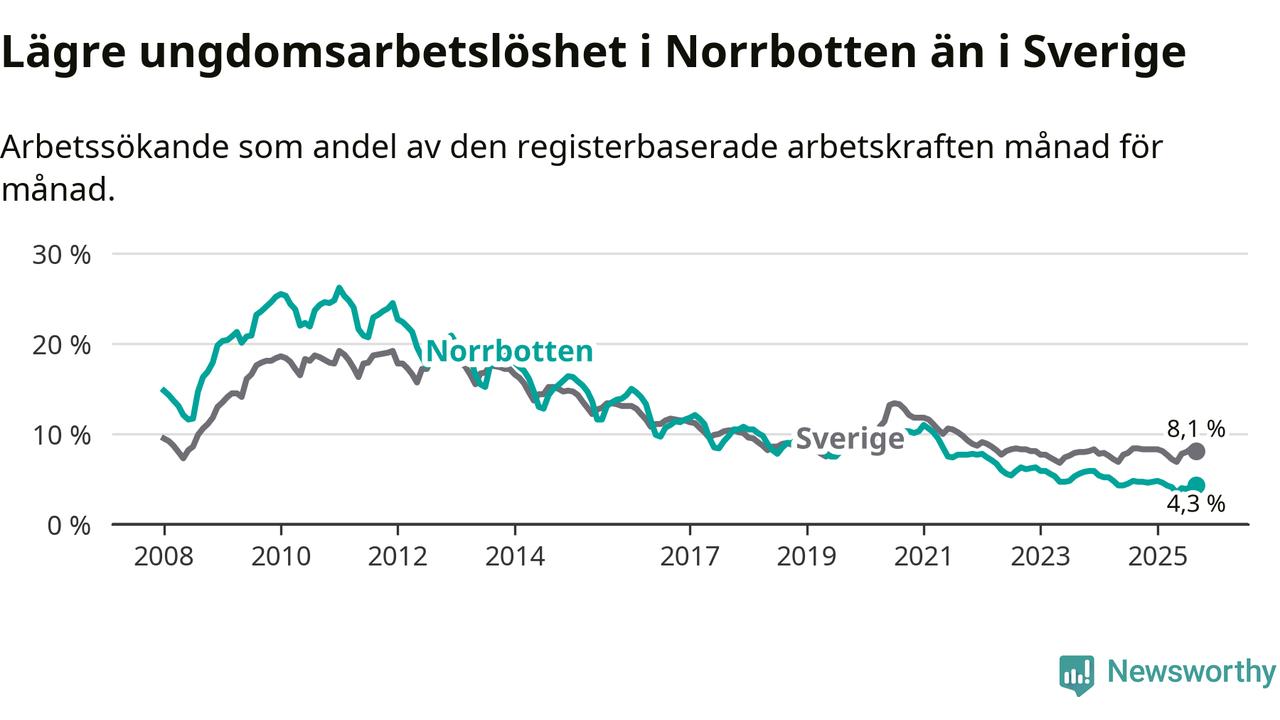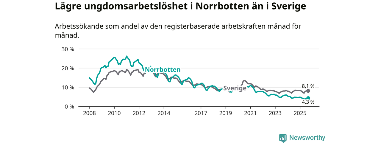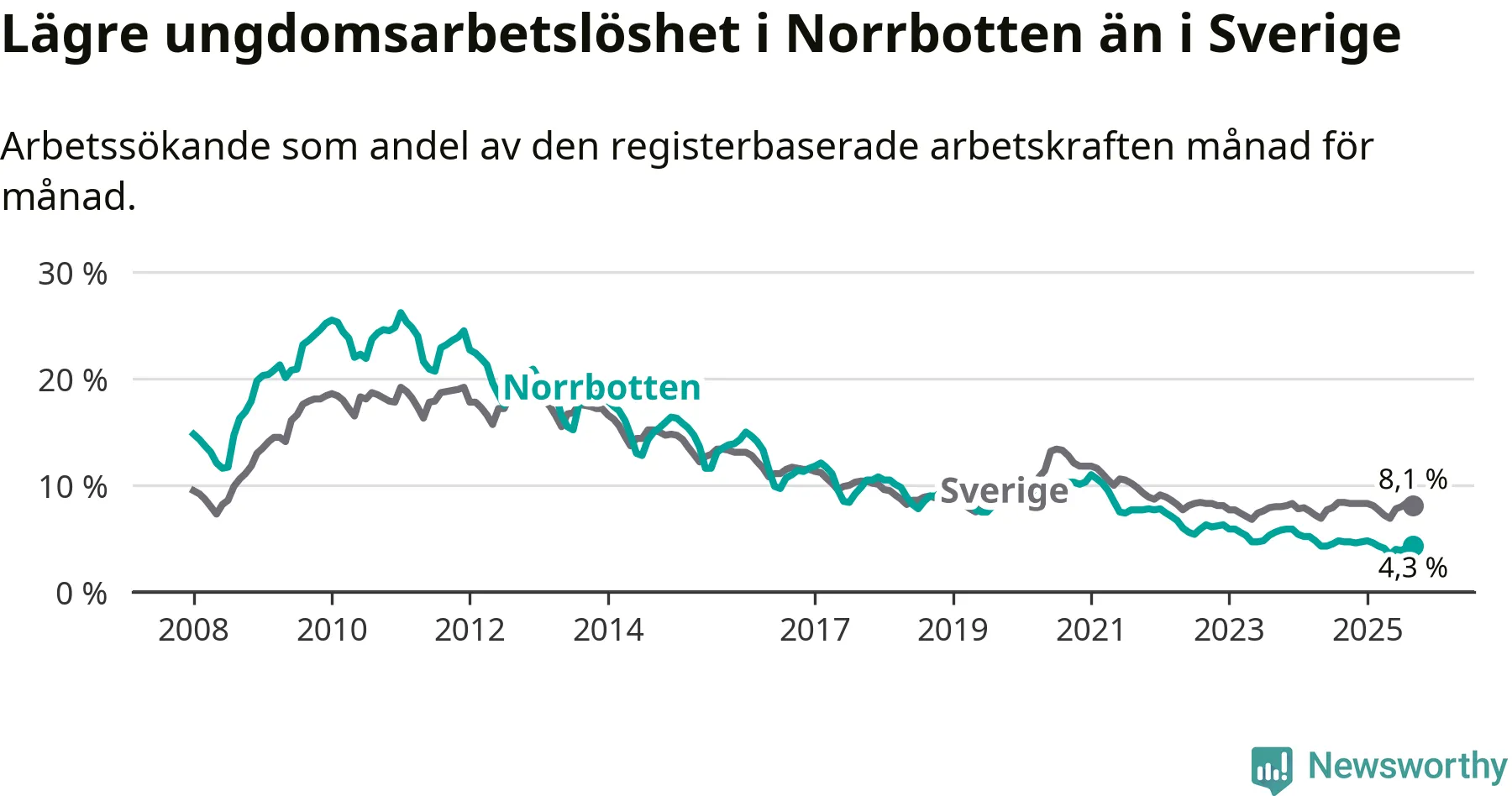 Precis som den totala arbetslösheten ligger ungdomsarbetslösheten i Norrbotten lägre än i Sverige som helhet. Skillnaden mellan länet och riket är 3,8 procentenheter.