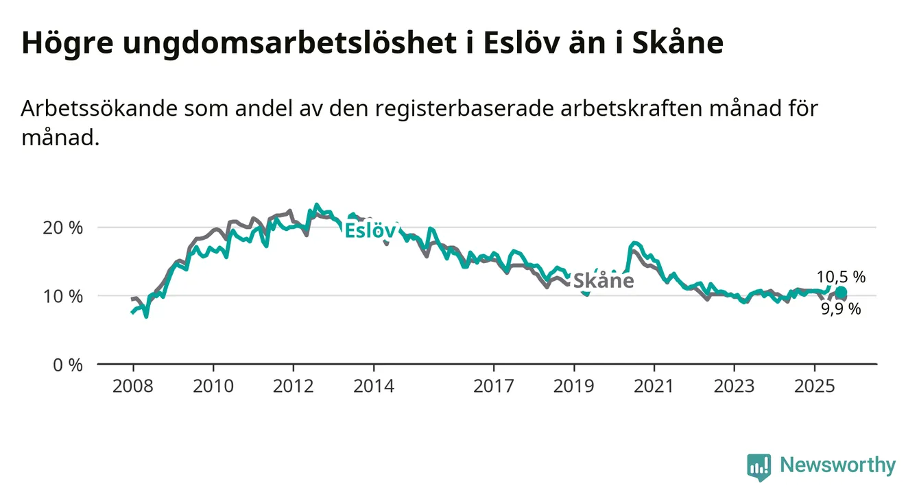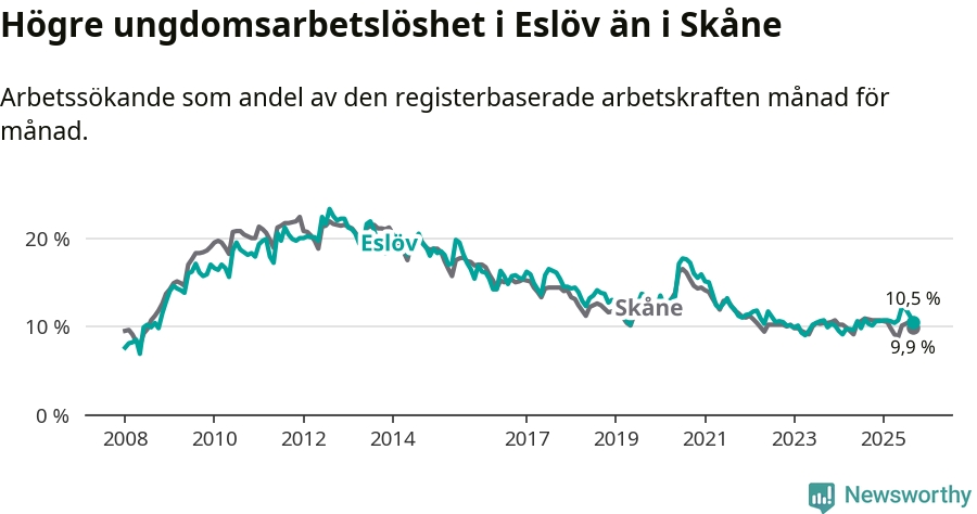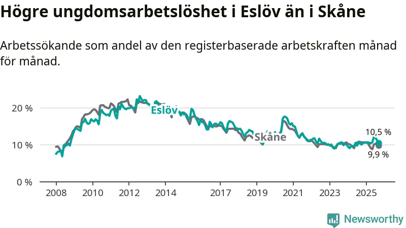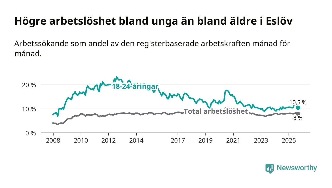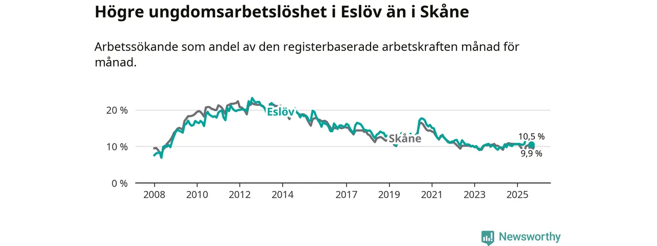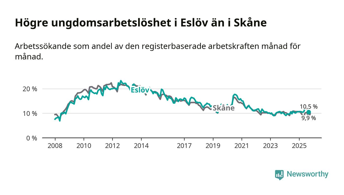 Medan Eslöv har lägre total arbetslöshet än Skåne, ligger ungdomsarbetslösheten 0,6 procentenheter högre i Eslöv.