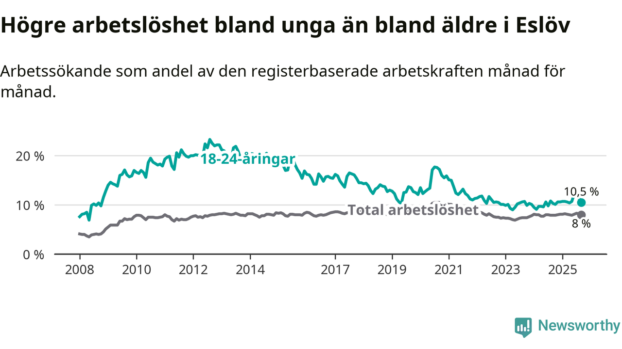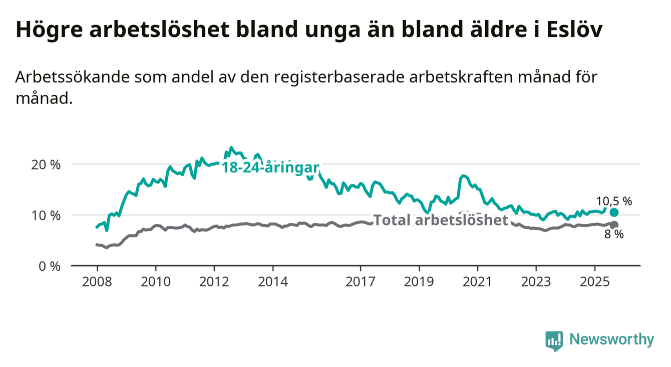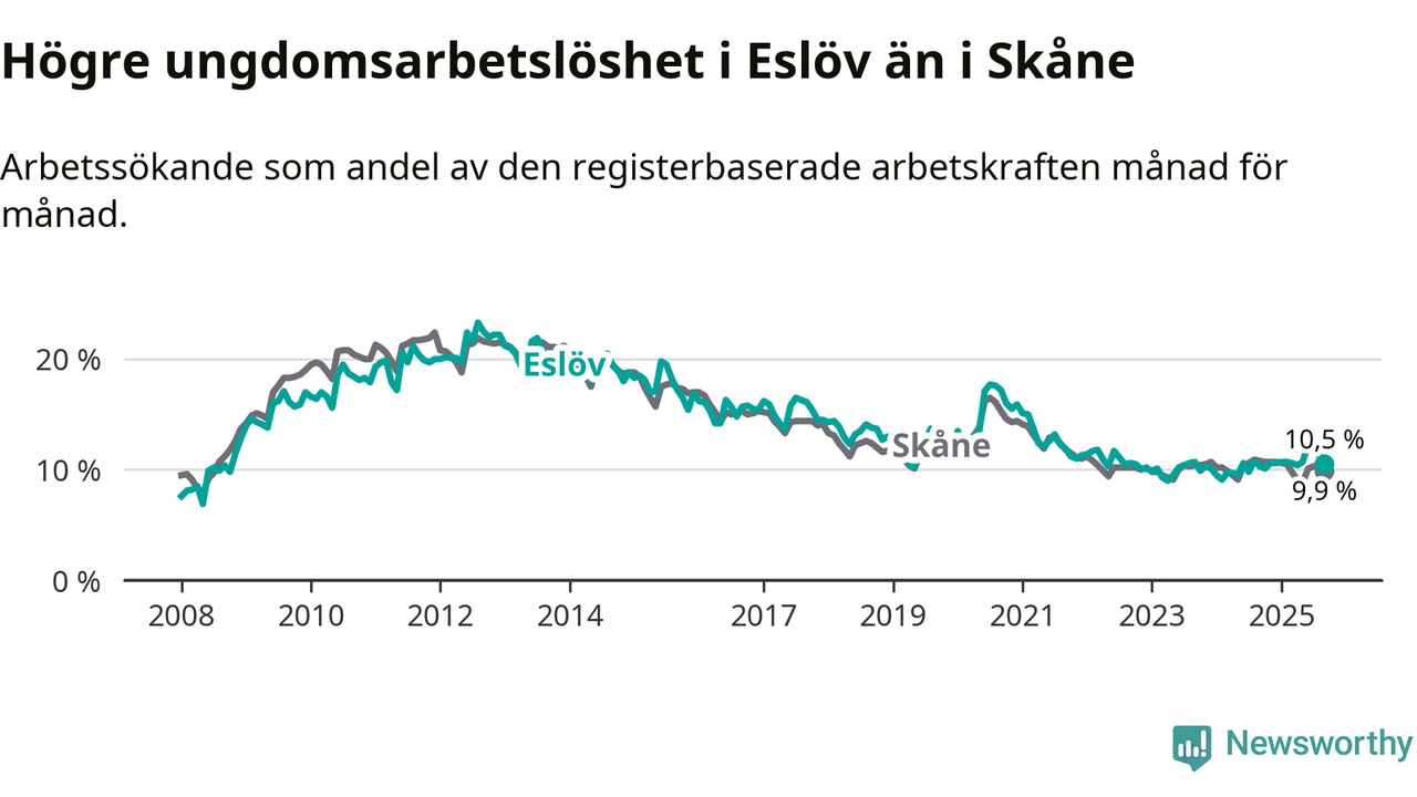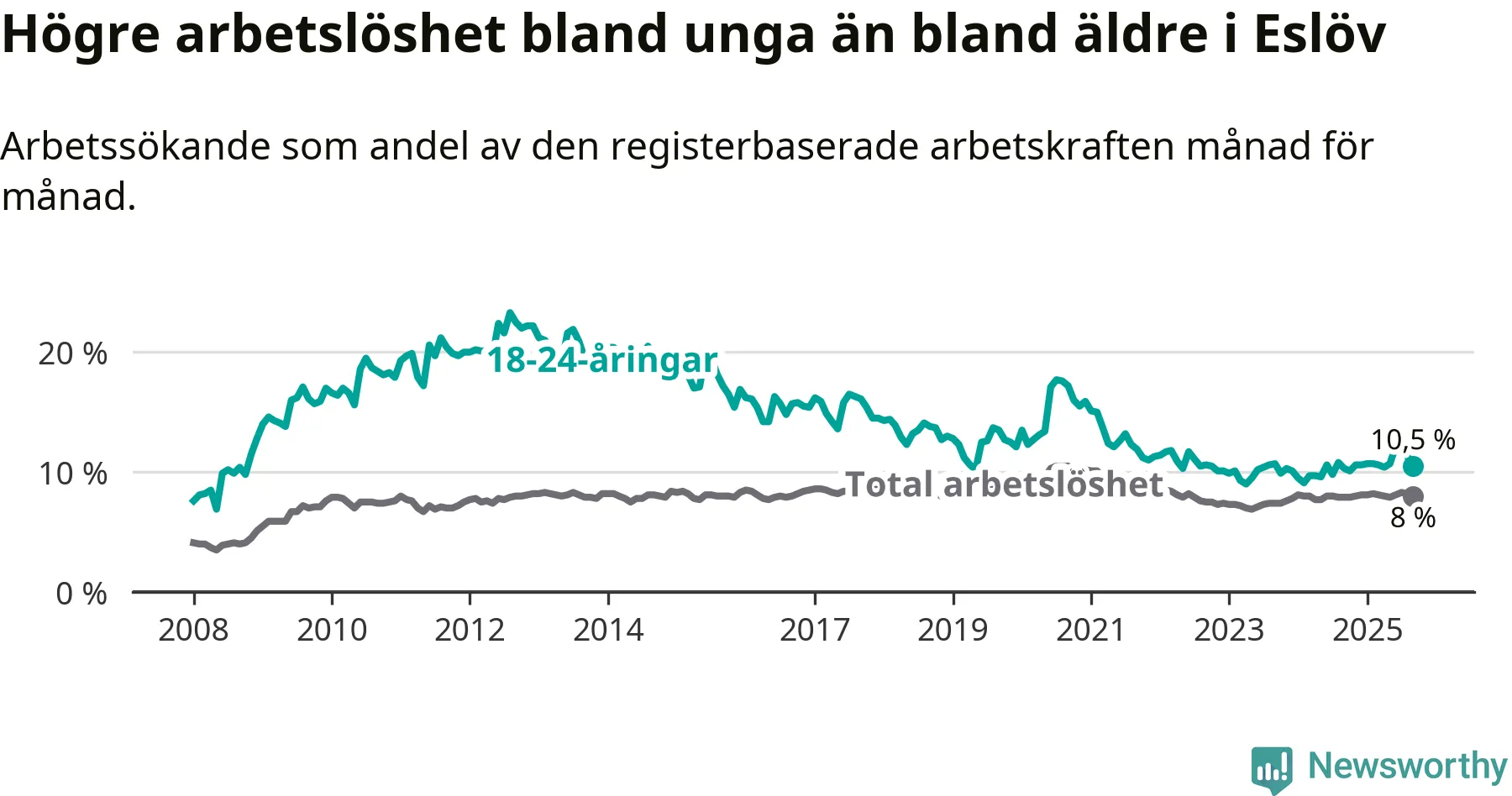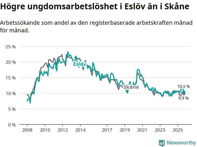 Medan Eslöv har lägre total arbetslöshet än Skåne, ligger ungdomsarbetslösheten 0,6 procentenheter högre i Eslöv.
