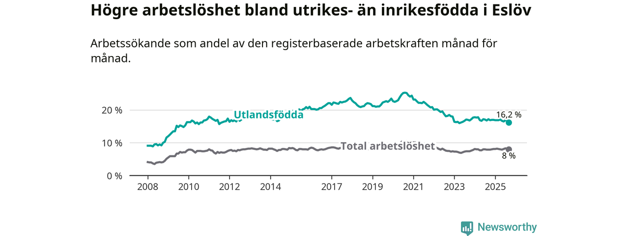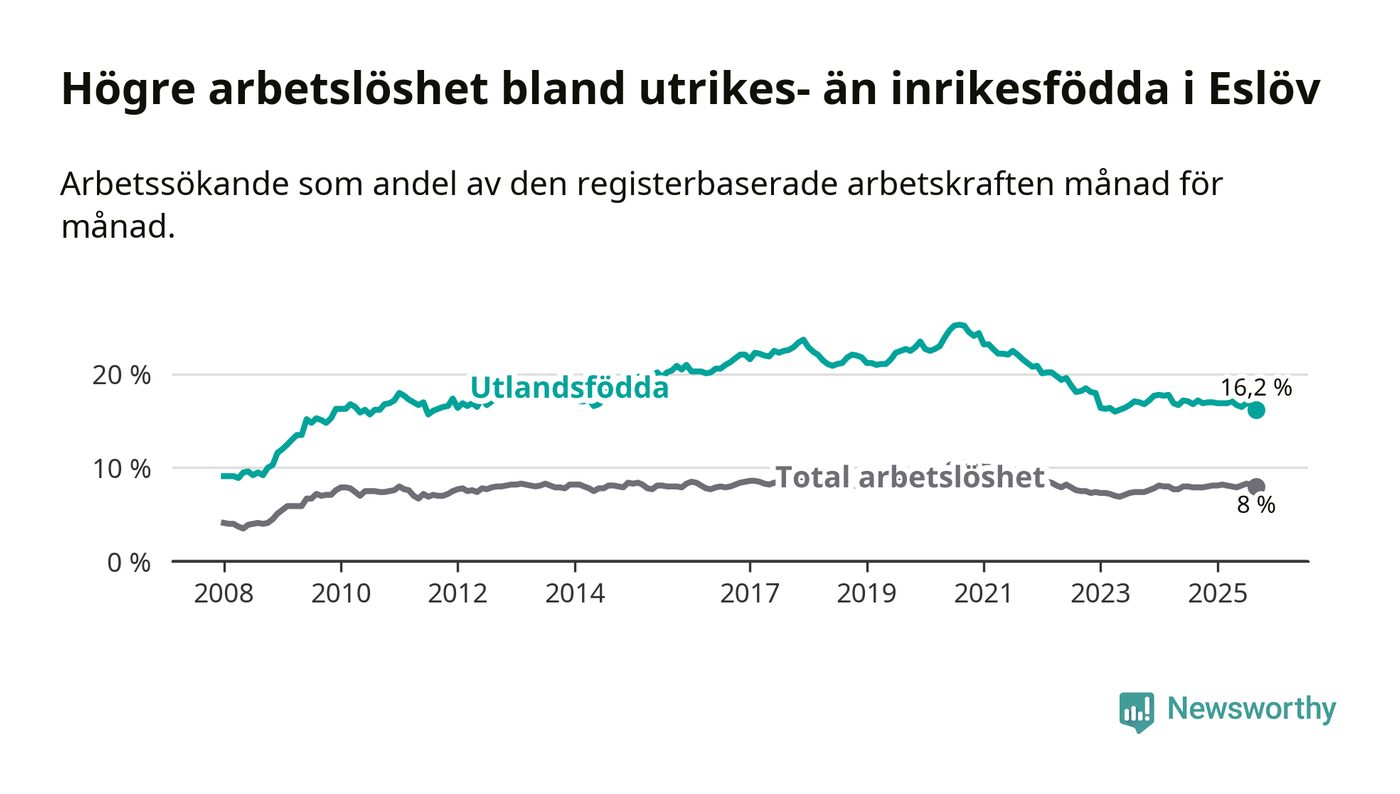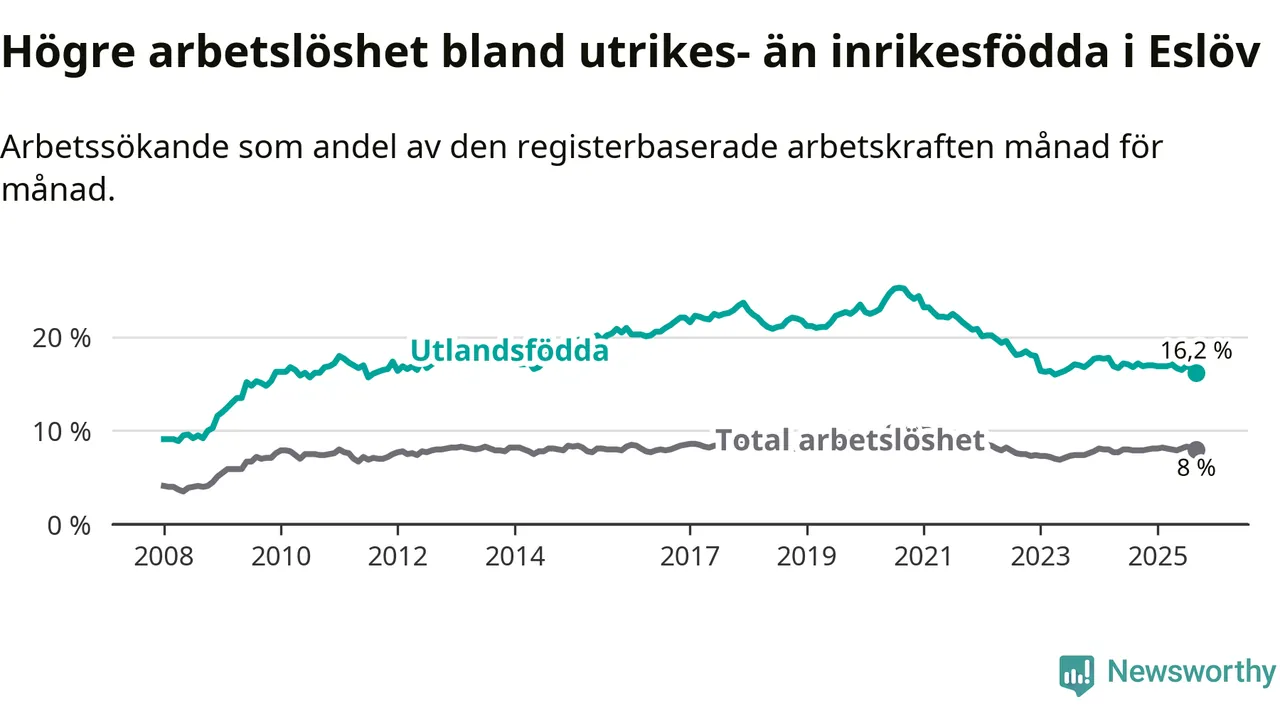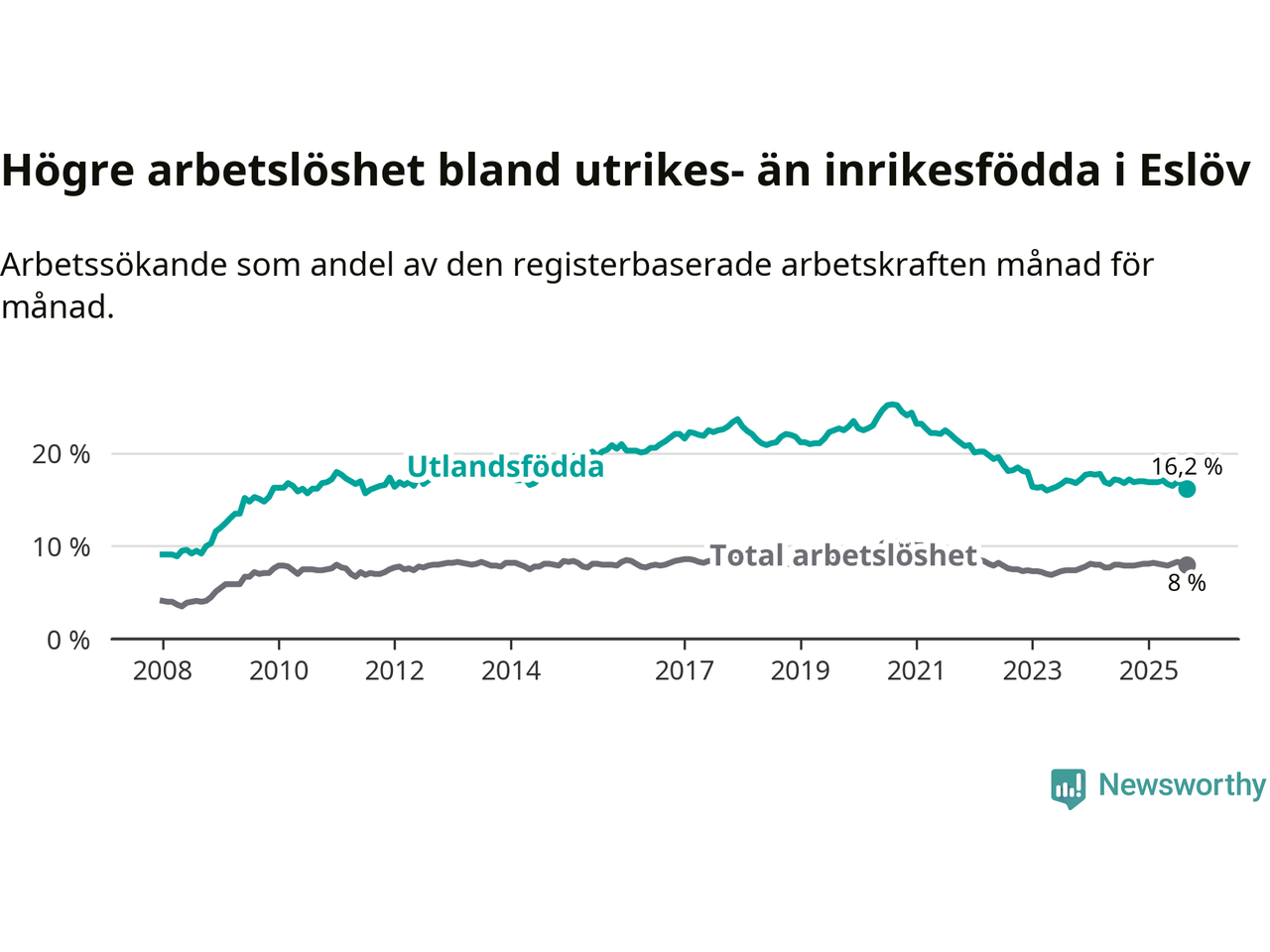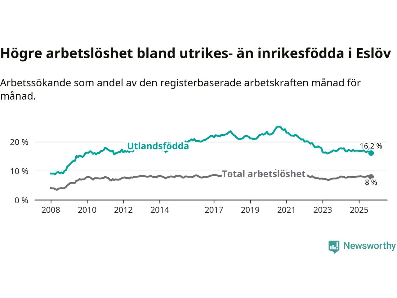 Arbetslösheten bland utlandsfödda var 16,2 procent i Eslöv under september månad, motsvarande 722 av 4 457 personer. Det är 1,0 procentenheter färre än vid samma tidpunkt i fjol (−40 om man räknar personer).