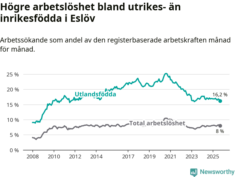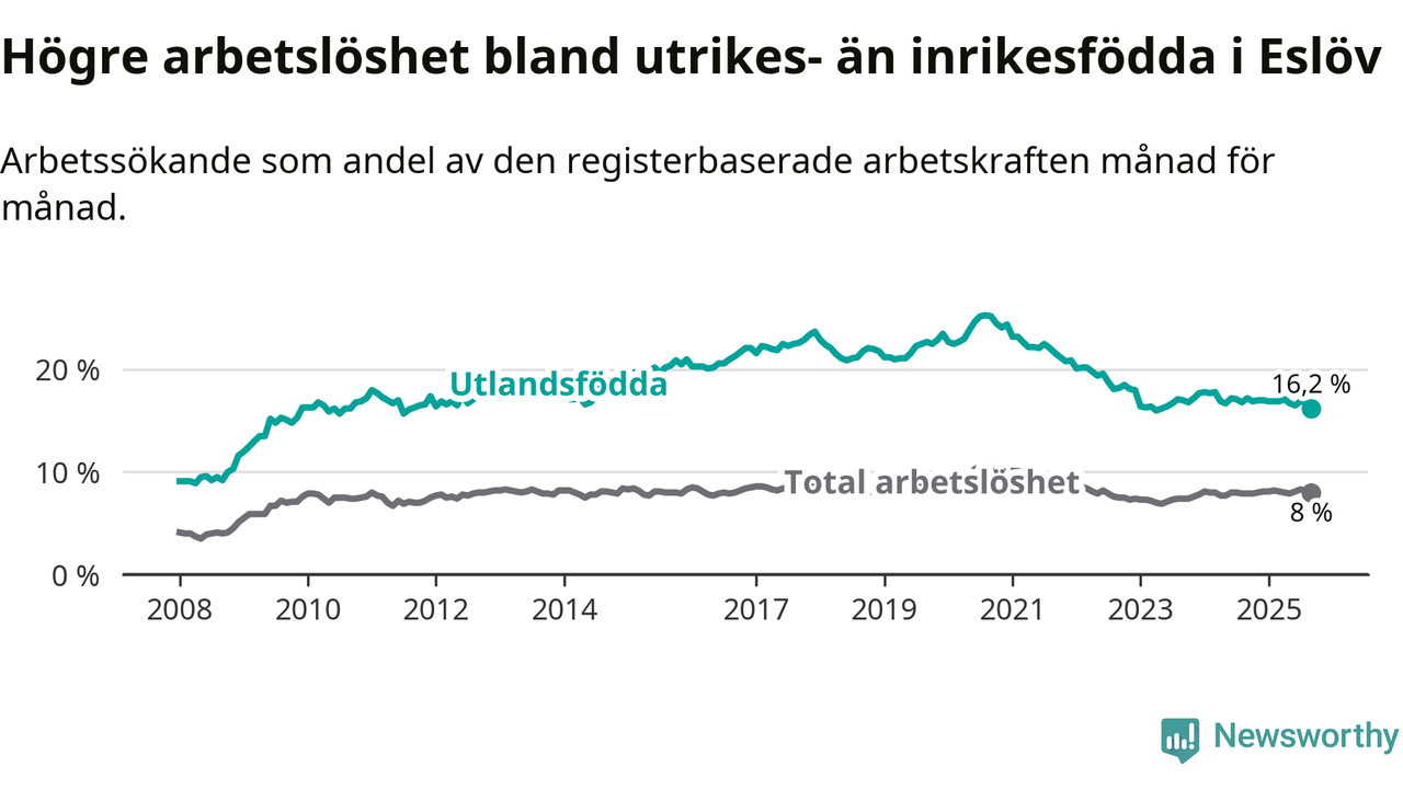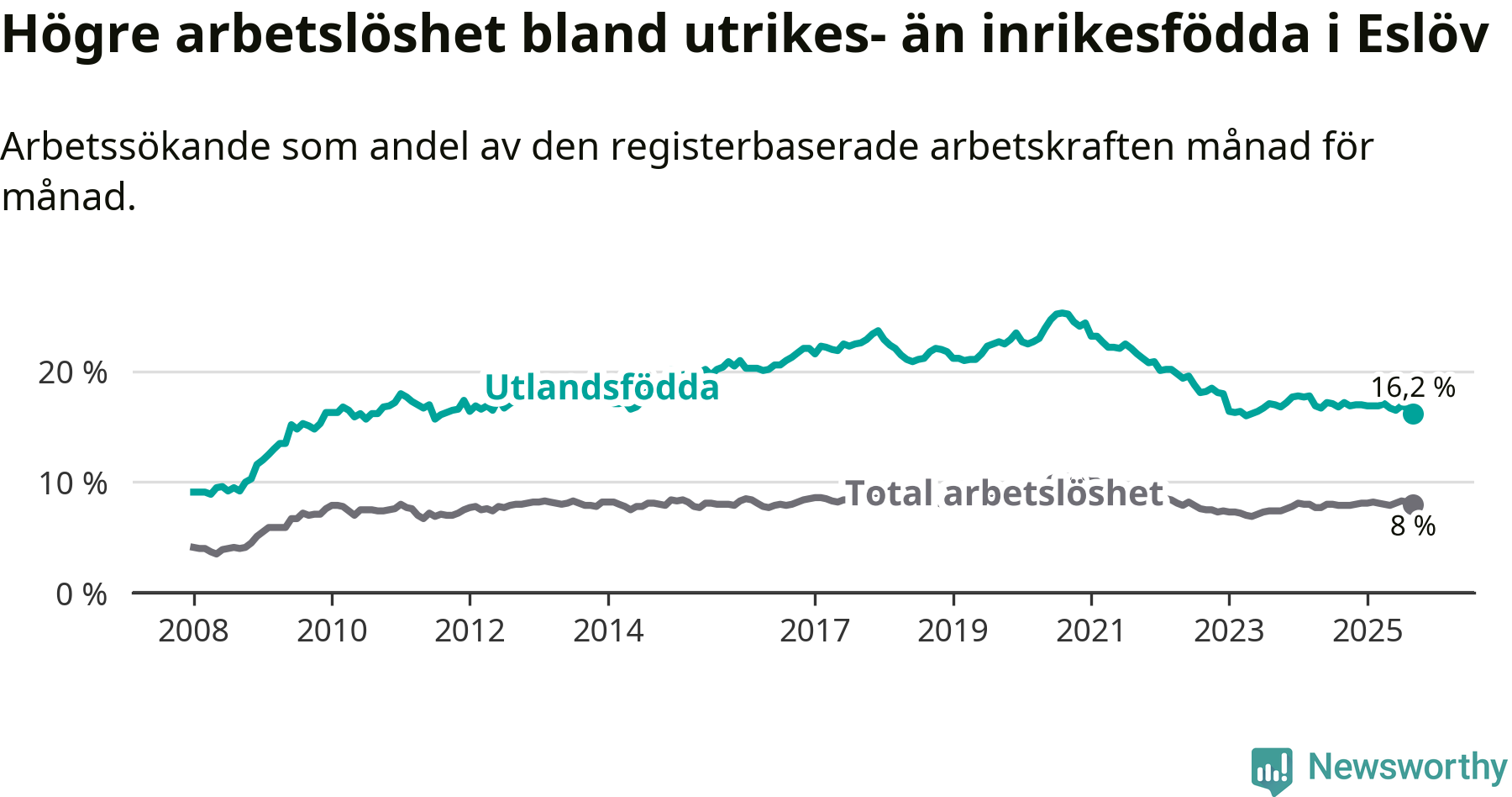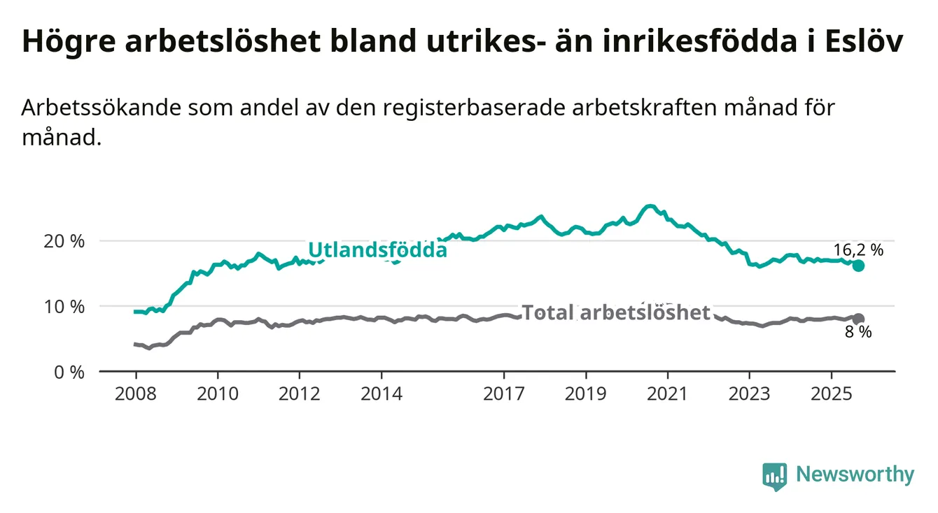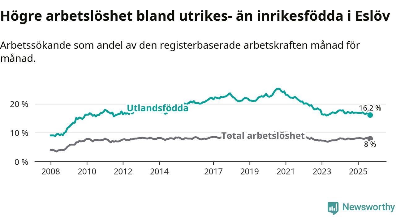 Arbetslösheten bland utlandsfödda var 16,2 procent i Eslöv under september månad, motsvarande 722 av 4 457 personer. Det är 1,0 procentenheter färre än vid samma tidpunkt i fjol (−40 om man räknar personer).