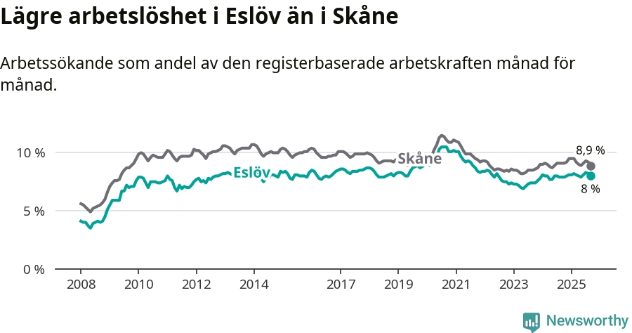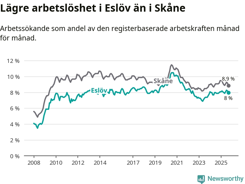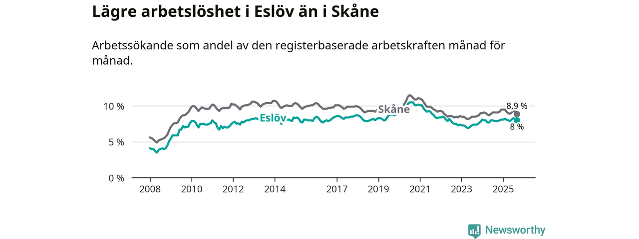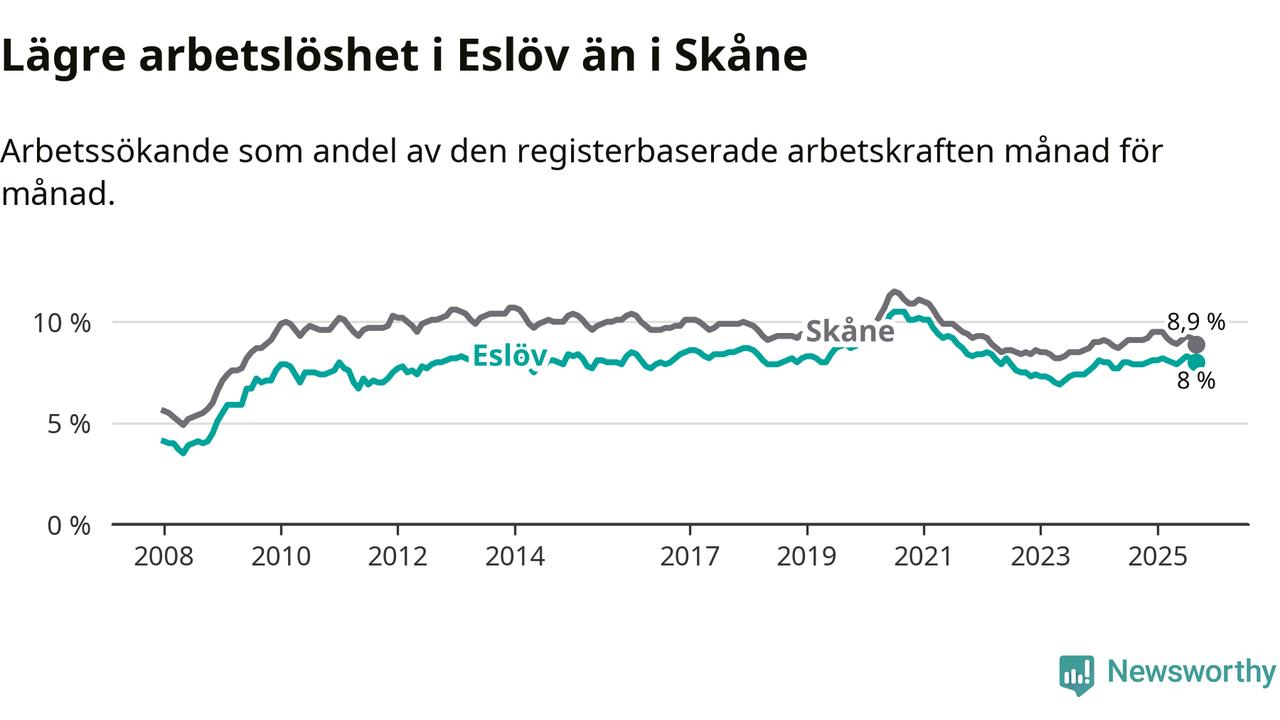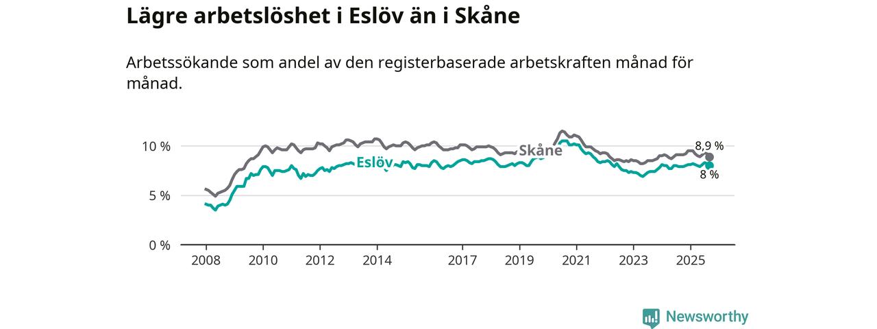 Under september månad rapporterade Eslövs kommun en total arbetslöshet på 8,0 procent. Det är en ökning jämfört med samma tidpunkt i fjol (+0,1 procentenheter). I Skåne län däremot sjunker arbetslösheten .
