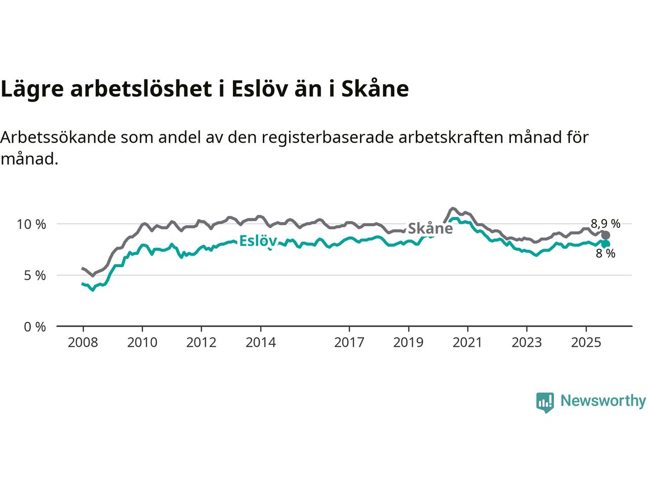 Även om arbetslösheten i Eslöv alltså ökar, så ligger den fortfarande under snittet i hela Skåne län (8,0 procent i kommunen, jämfört med 8,9 procent i hela länet). Lomma har den lägsta arbetslösheten i länet (4,1 procent), medan Perstorp har den högsta (13,6 procent). För att Eslöv skulle komma ner i samma arbetslöshetsnivå som Lomma skulle 672 personer behöva sysselsättas.