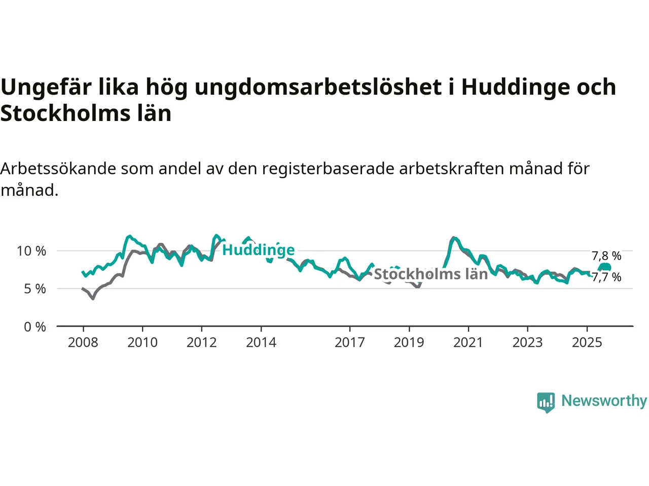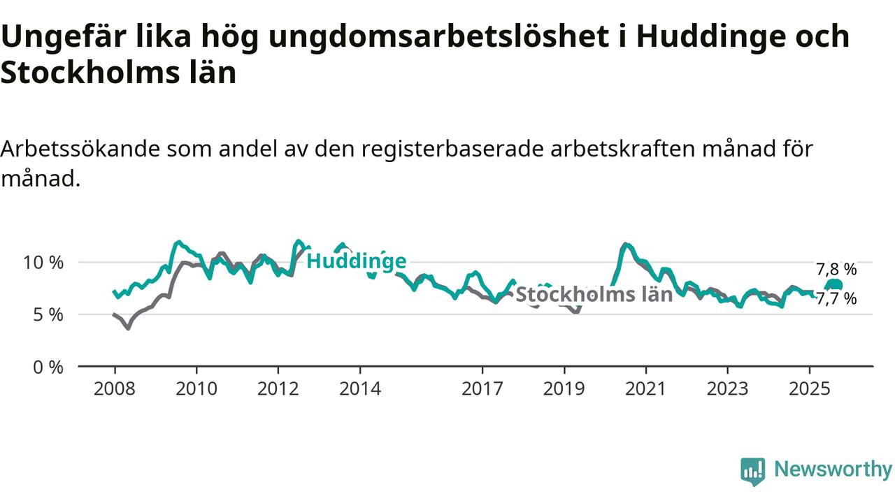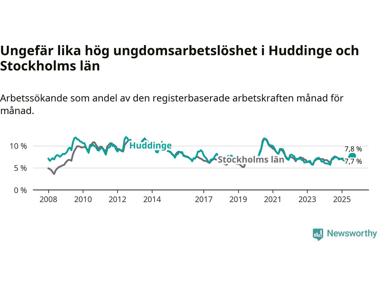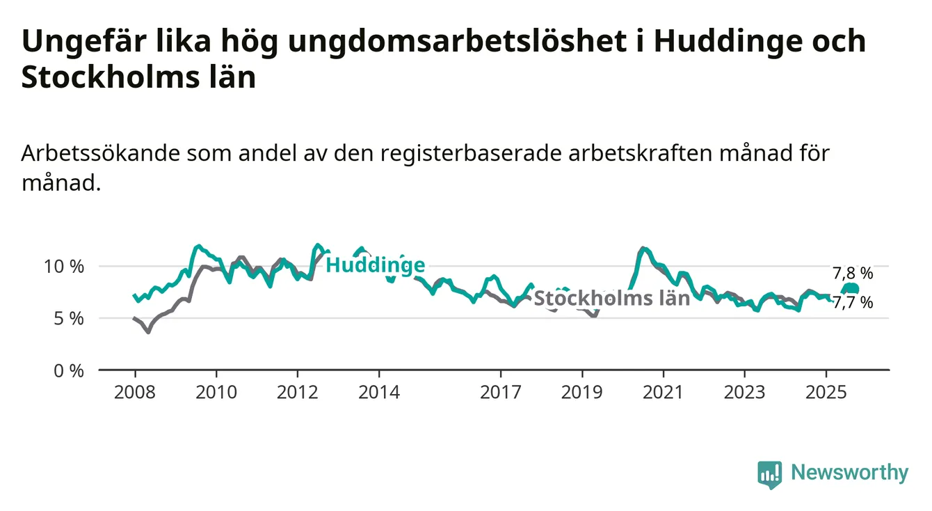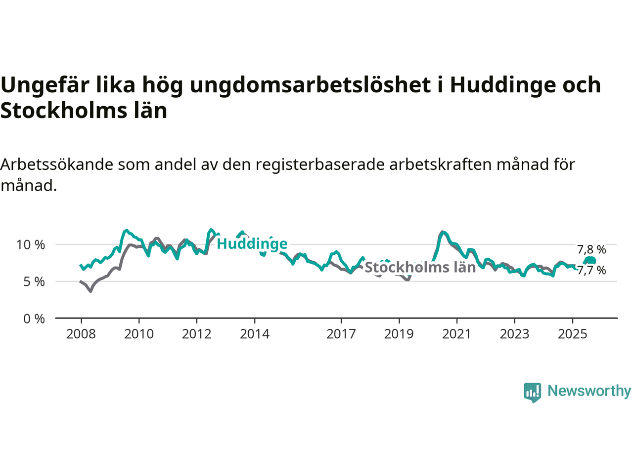 Medan Huddinge har högre total arbetslöshet än Stockholms län, ligger ungdomsarbetslösheten på i stort sett samma nivå.