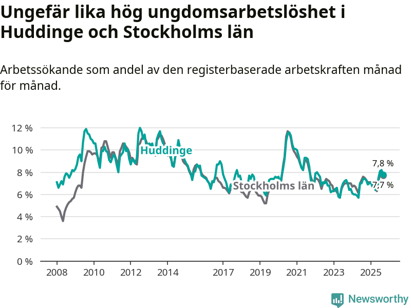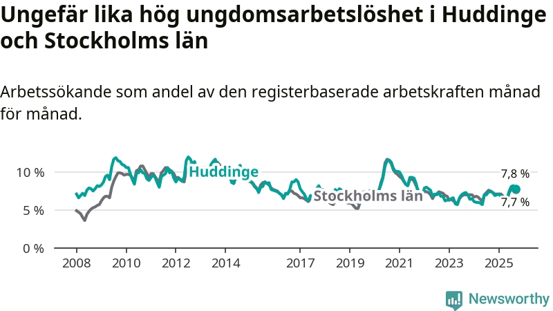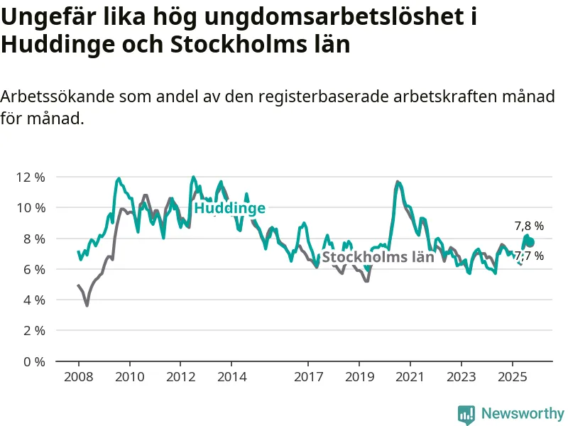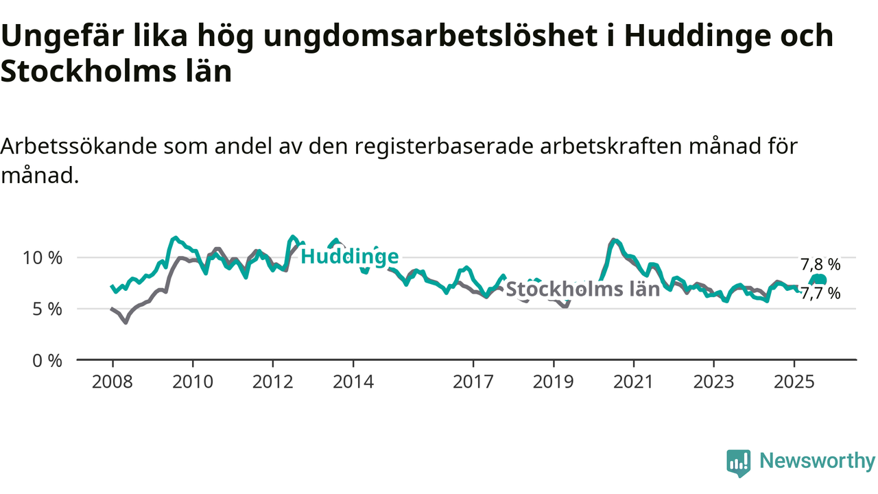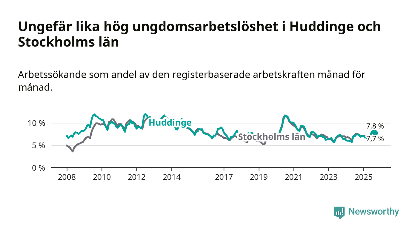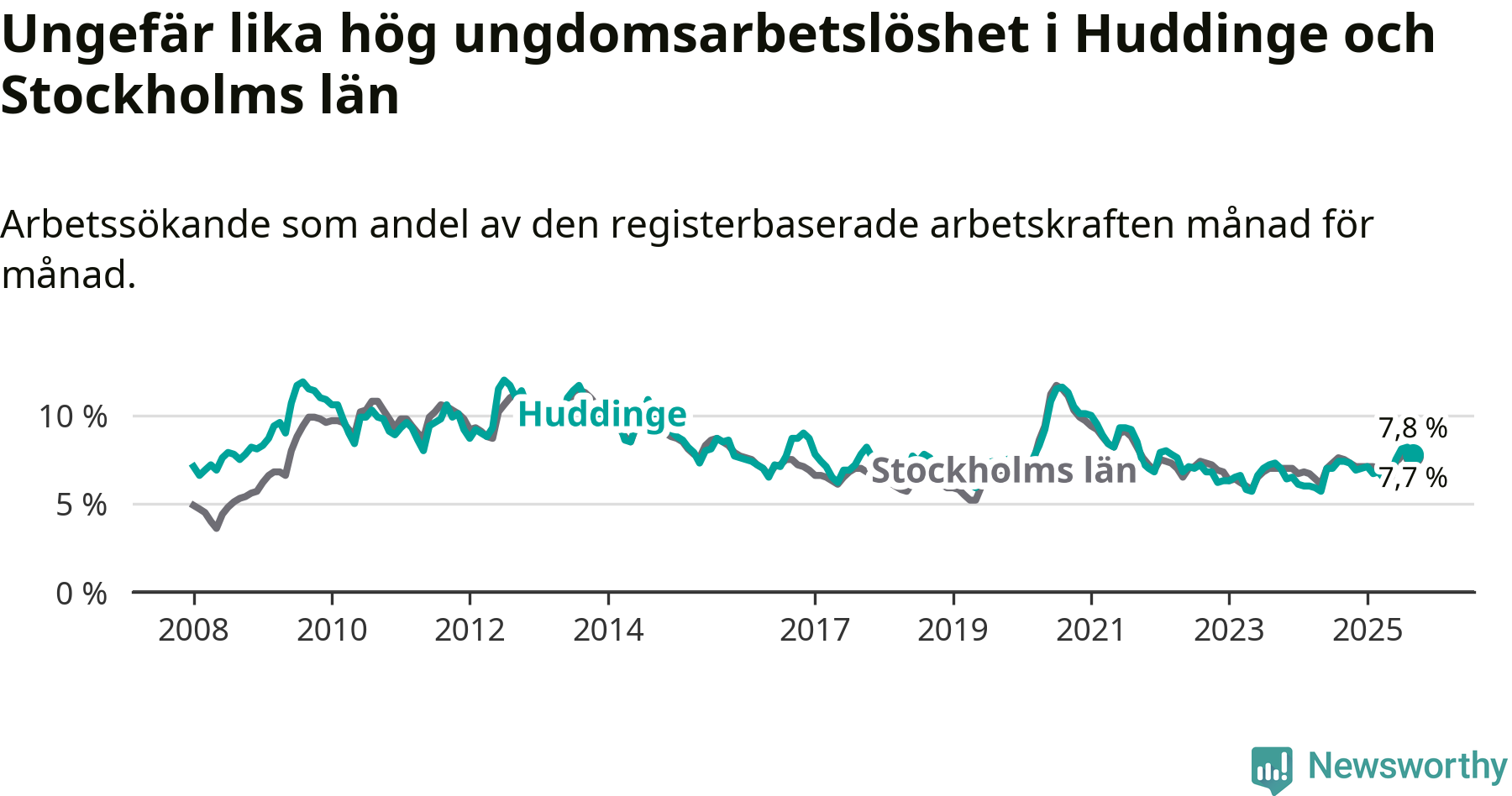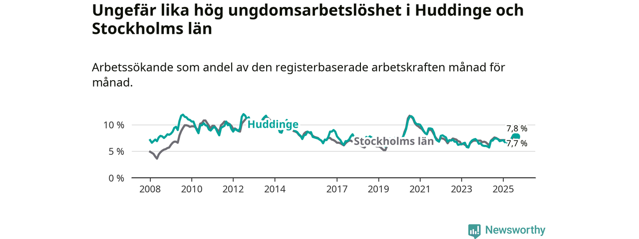 Medan Huddinge har högre total arbetslöshet än Stockholms län, ligger ungdomsarbetslösheten på i stort sett samma nivå.