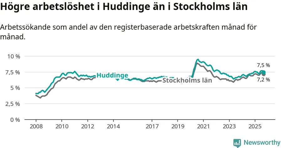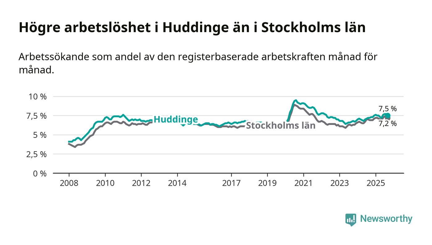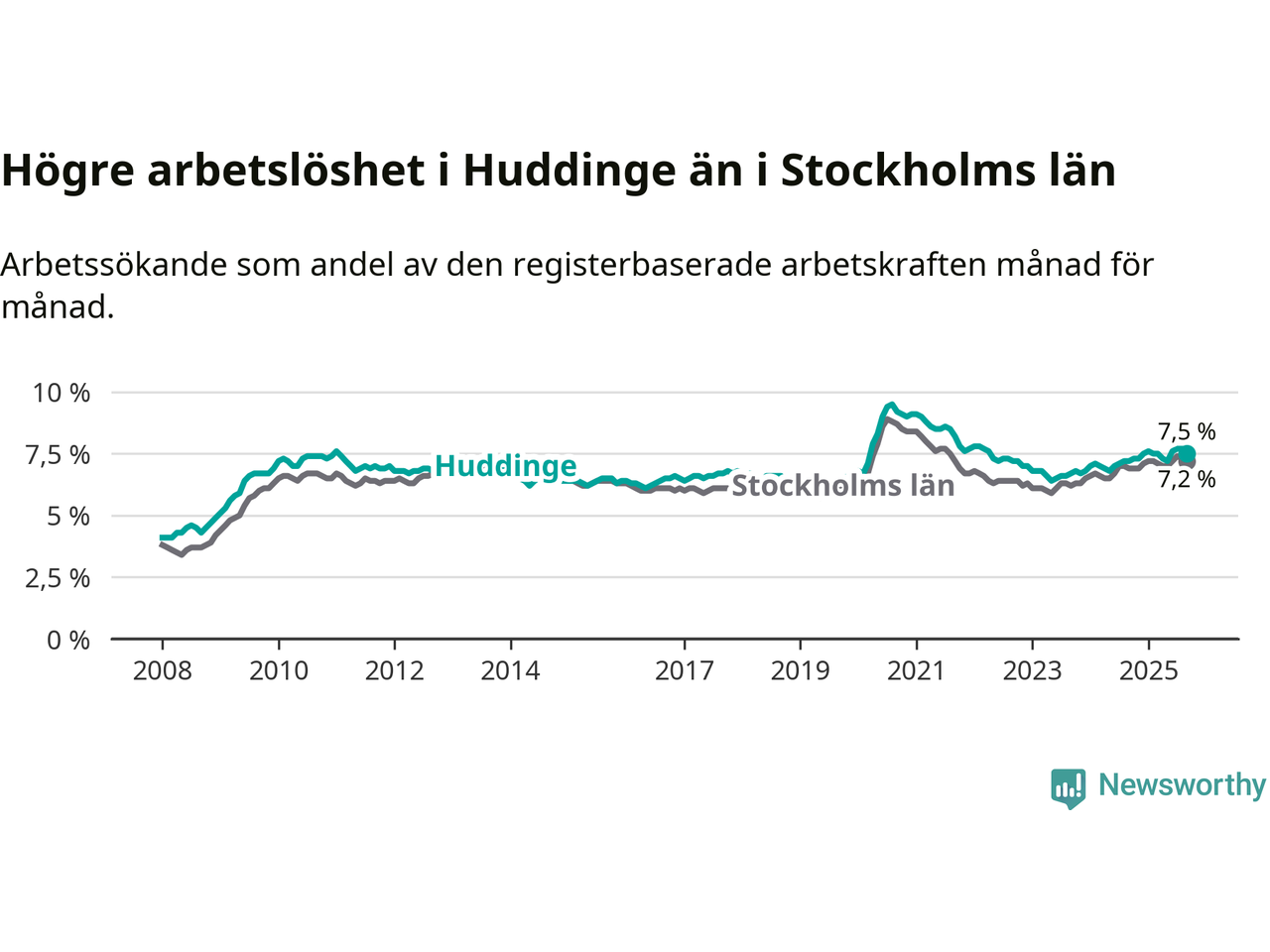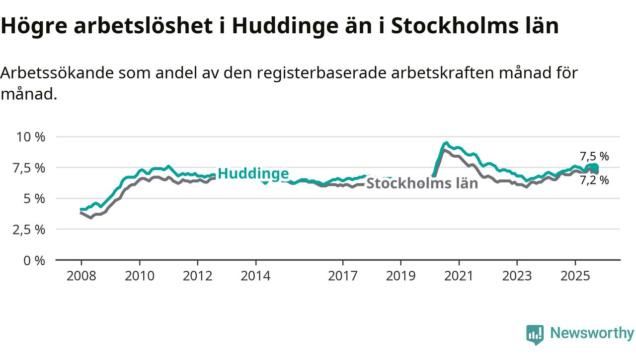 Under september månad rapporterade Huddinge kommun en total arbetslöshet på 7,5 procent. Det är en ökning jämfört med samma tidpunkt i fjol (+0,3 procentenheter). Även i Stockholms län stiger arbetslösheten .