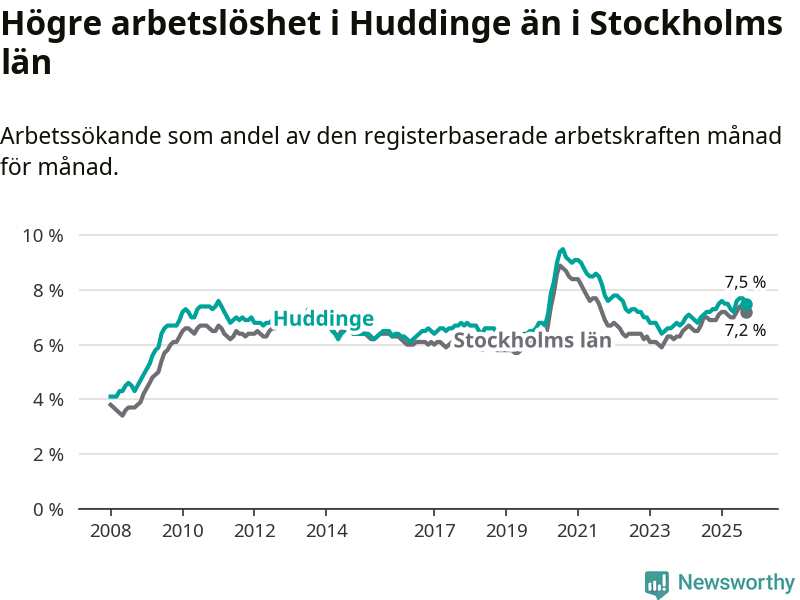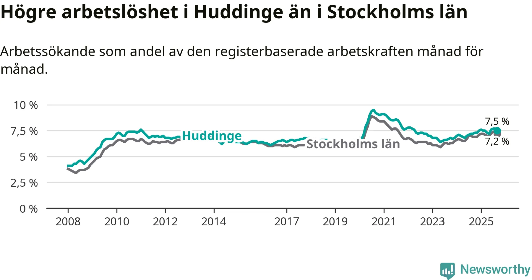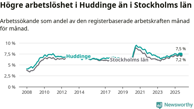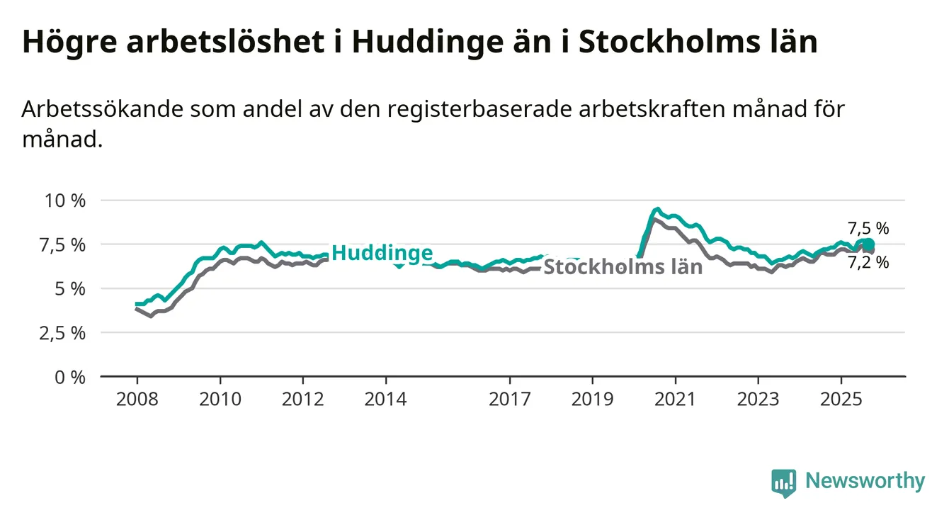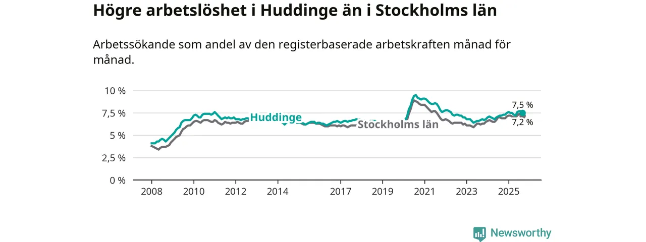 Under september månad rapporterade Huddinge kommun en total arbetslöshet på 7,5 procent. Det är en ökning jämfört med samma tidpunkt i fjol (+0,3 procentenheter). Även i Stockholms län stiger arbetslösheten .