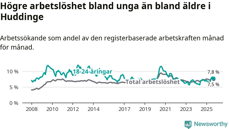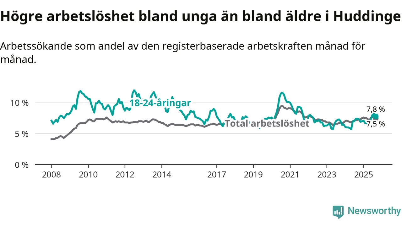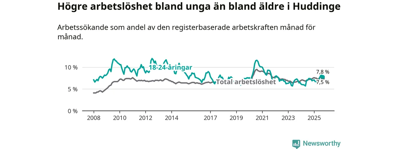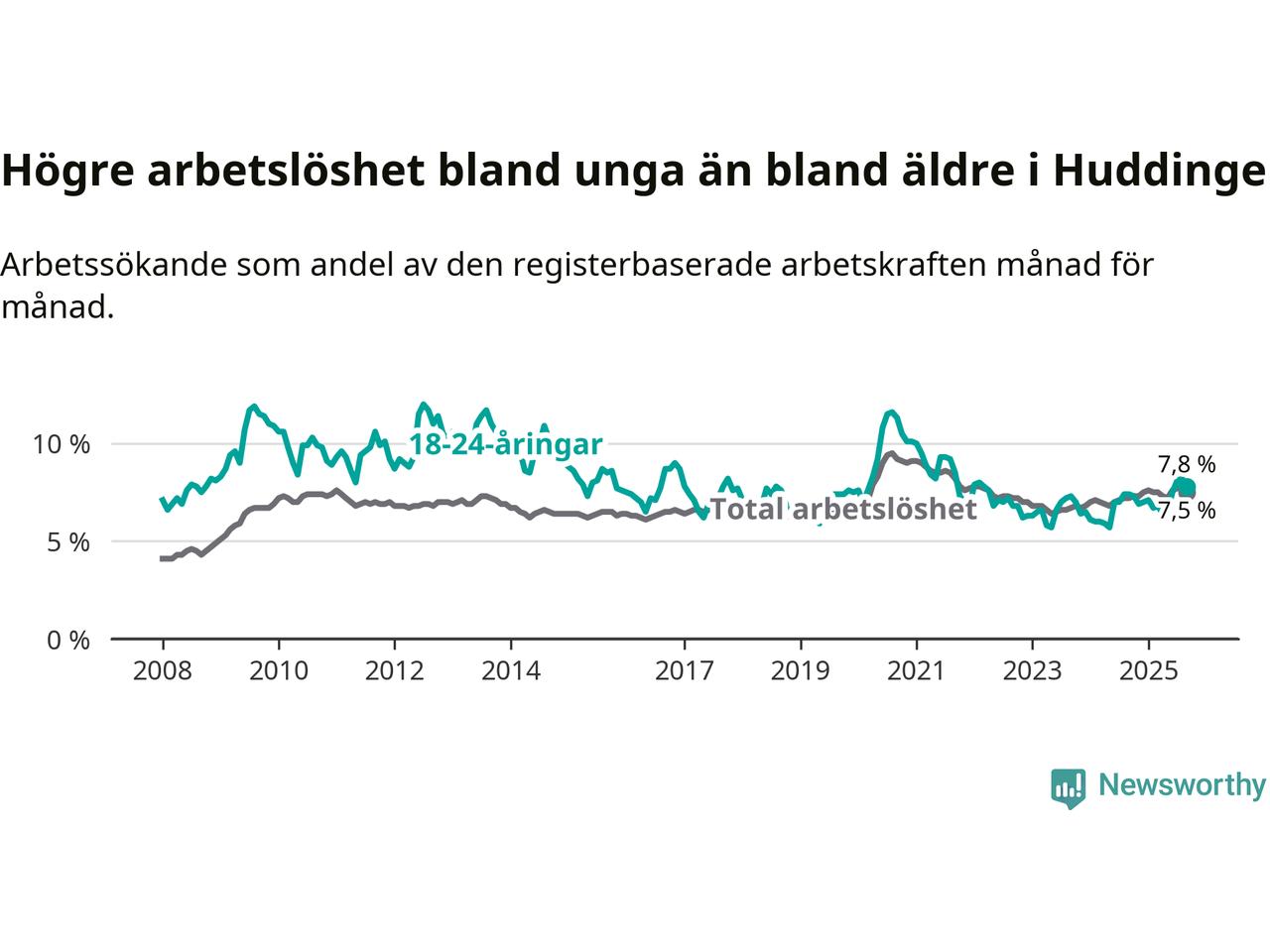 I och med den senaste månadens uppgång har de ungas arbetslöshet i Huddinge stigit 14 månader i följd (upp från 7,0 procent i juli 2024 till 7,8 procent nu).