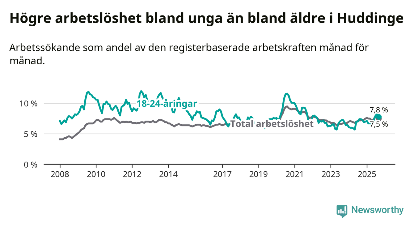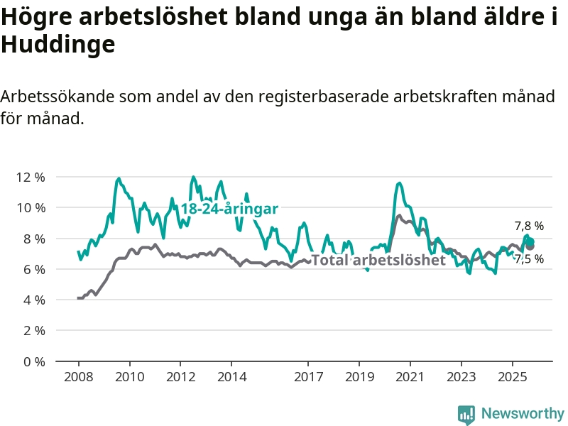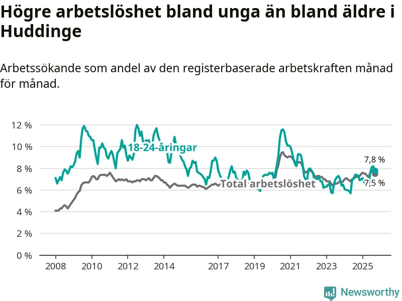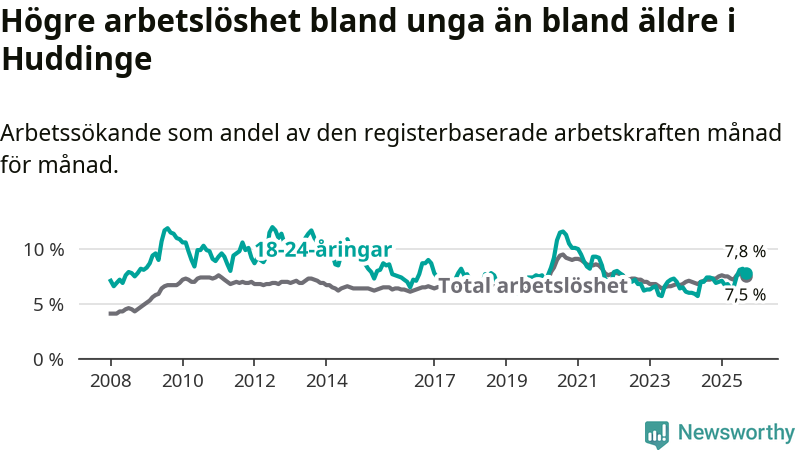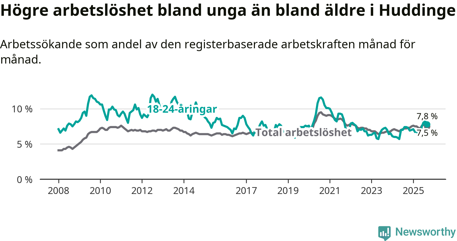 I och med den senaste månadens uppgång har de ungas arbetslöshet i Huddinge stigit 14 månader i följd (upp från 7,0 procent i juli 2024 till 7,8 procent nu).