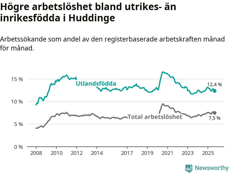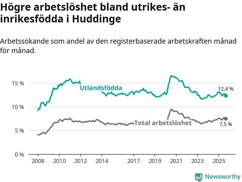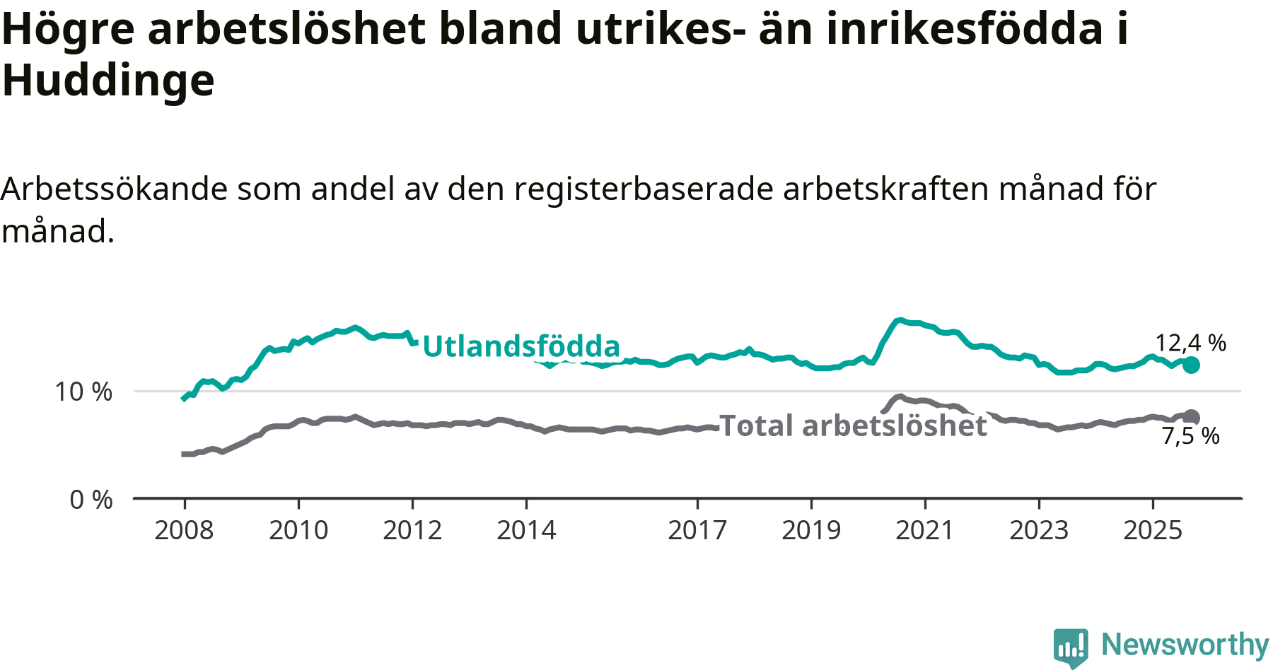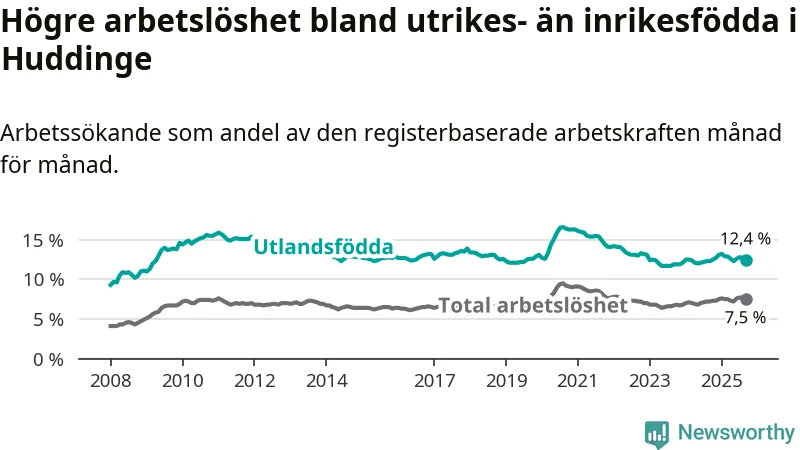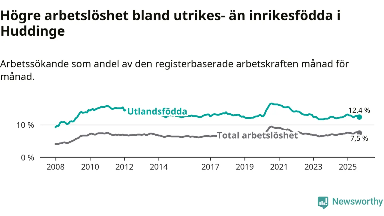 Arbetslösheten bland utlandsfödda var 12,4 procent i Huddinge under september månad, motsvarande 2 725 av 21 976 personer. Det är 0,1 procentenheter fler än vid samma tidpunkt i fjol (+24 om man räknar personer). Därmed är de utlandsföddas arbetslöshet högre än vid samma tidpunkt i fjol för 18:e månaden i följd.