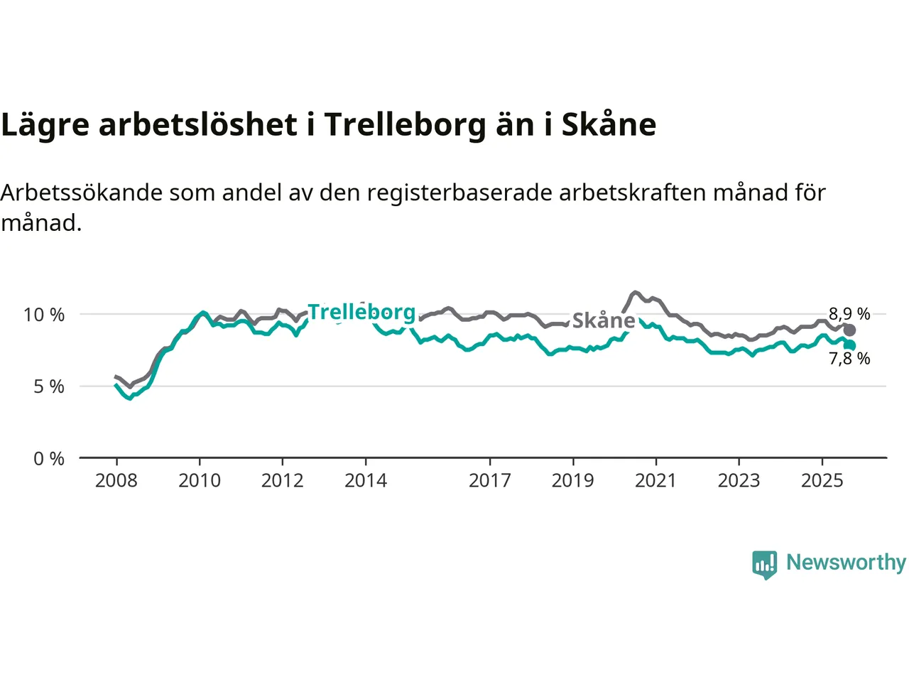 Även om arbetslösheten i Trelleborg alltså ökar, så ligger den fortfarande under snittet i hela Skåne län (7,8 procent i kommunen, jämfört med 8,9 procent i hela länet). Lomma har den lägsta arbetslösheten i länet (4,1 procent), medan Perstorp har den högsta (13,6 procent). För att Trelleborg skulle komma ner i samma arbetslöshetsnivå som Lomma skulle 855 personer behöva sysselsättas.