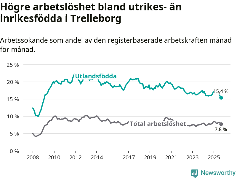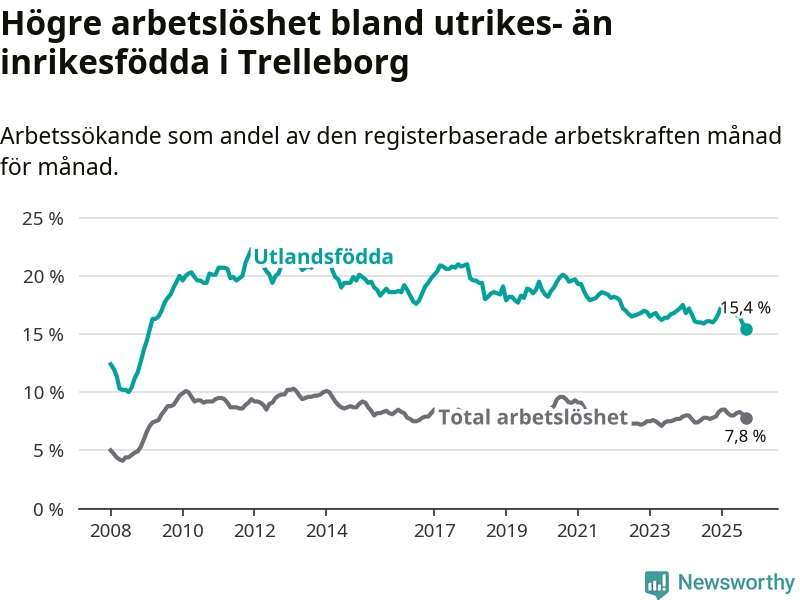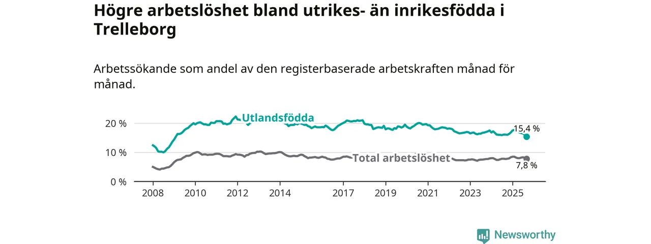 Skillnaden i arbetslöshet mellan utrikesfödda och hela befolkningen är 7,6 procentenheter i Trelleborg. Det är en mindre skillnad än för ett år sedan (−0,8 procentenheter).