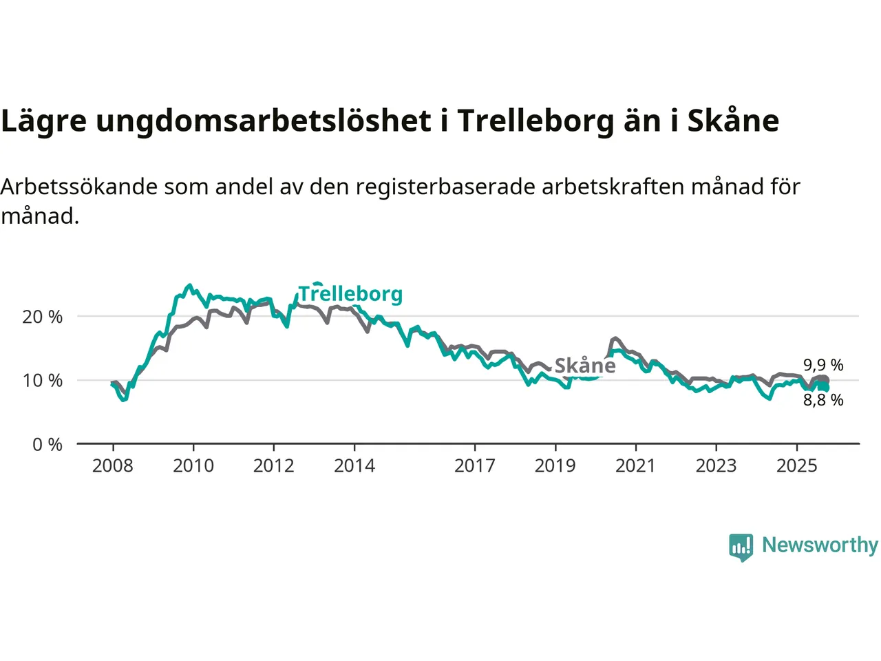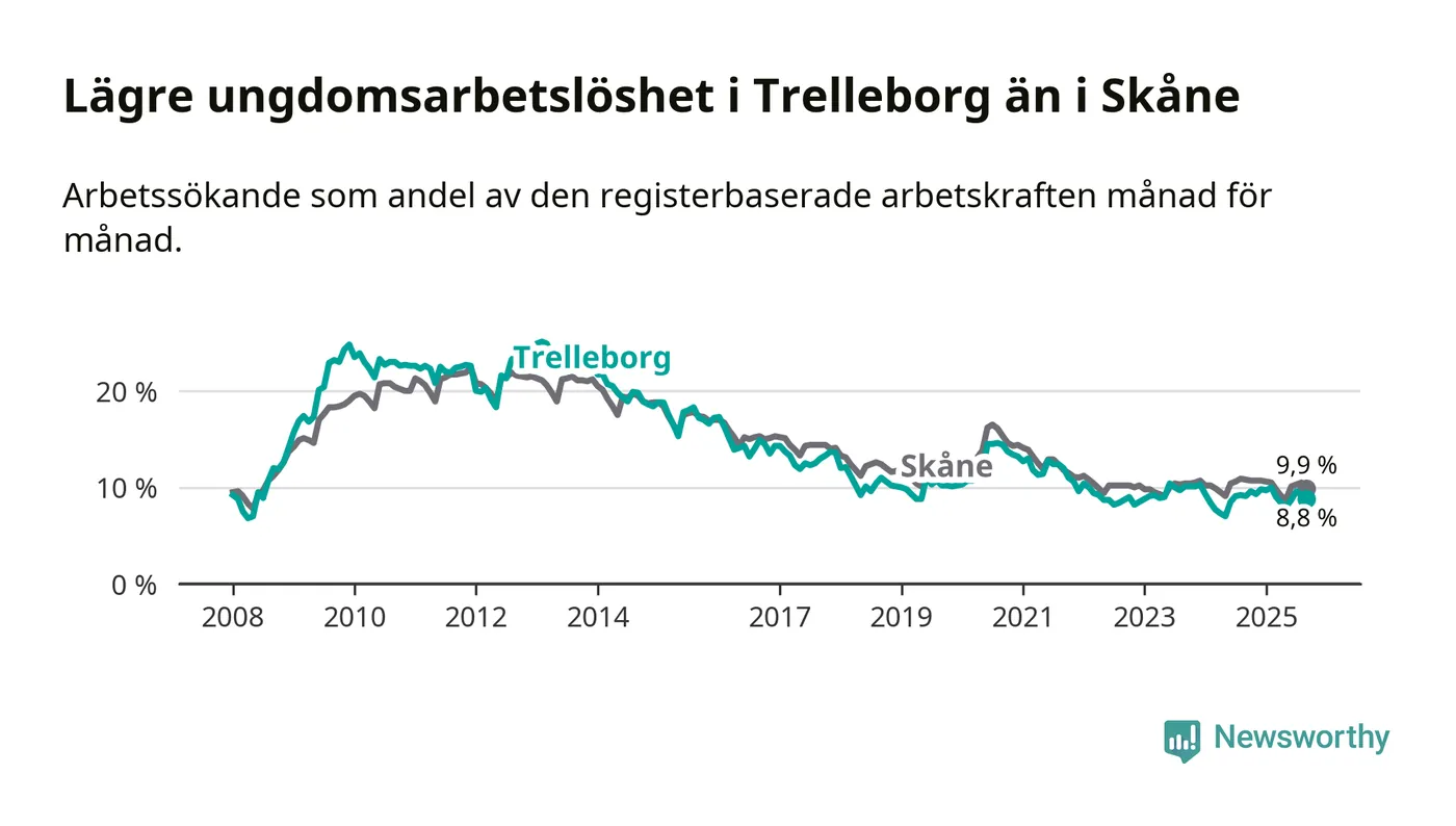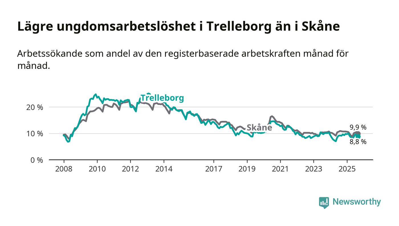 Precis som den totala arbetslösheten ligger ungdomsarbetslösheten i Trelleborg lägre än i Skåne som helhet. Skillnaden mellan kommunen och länet är 1,1 procentenheter.