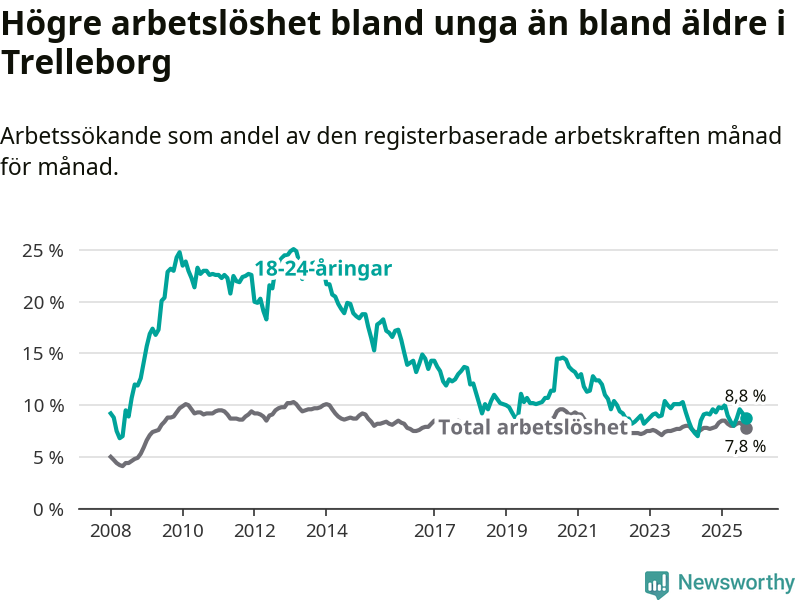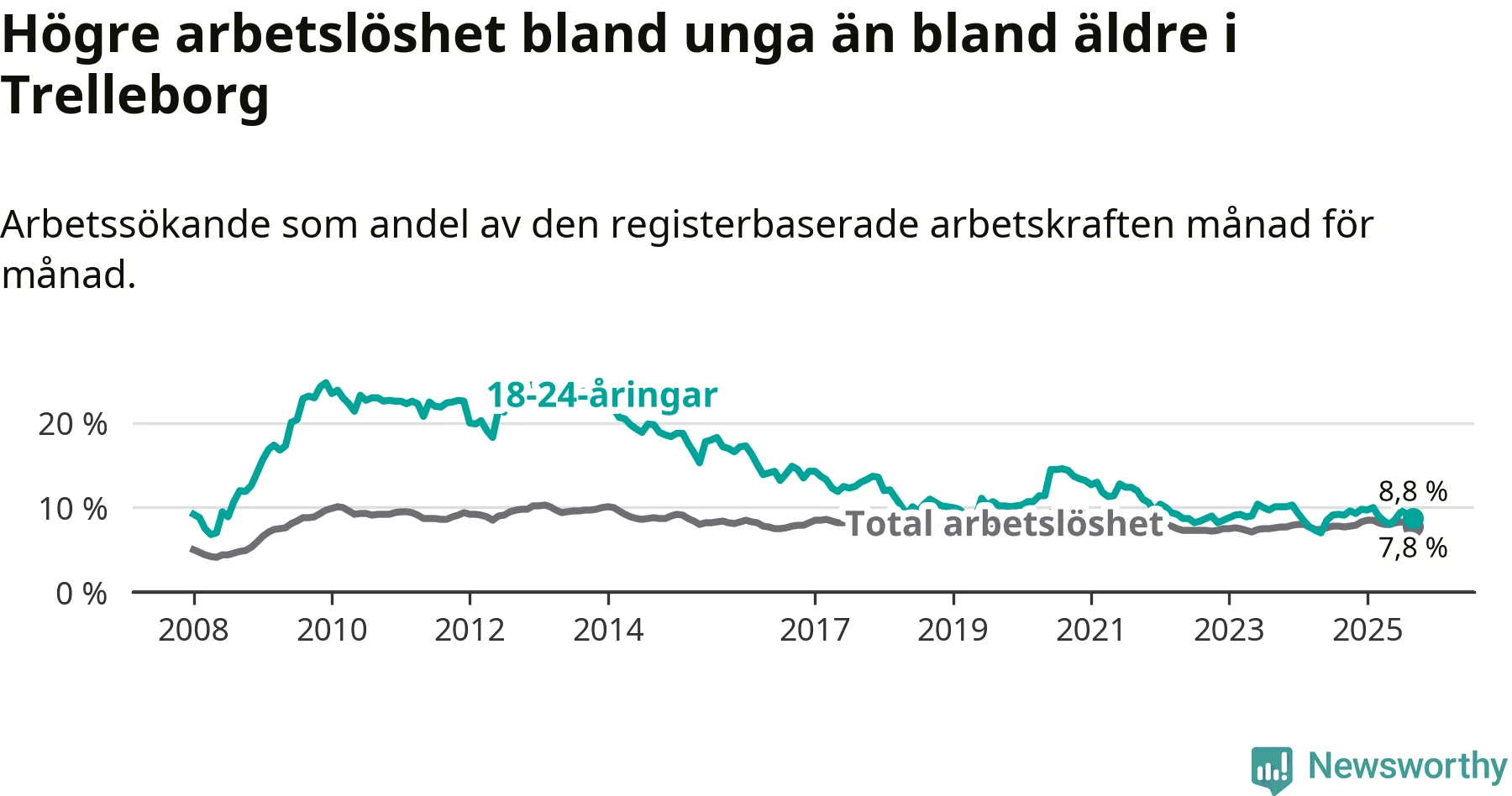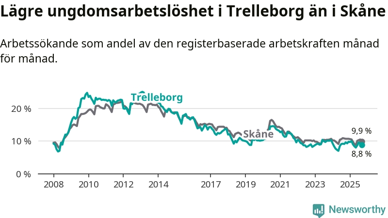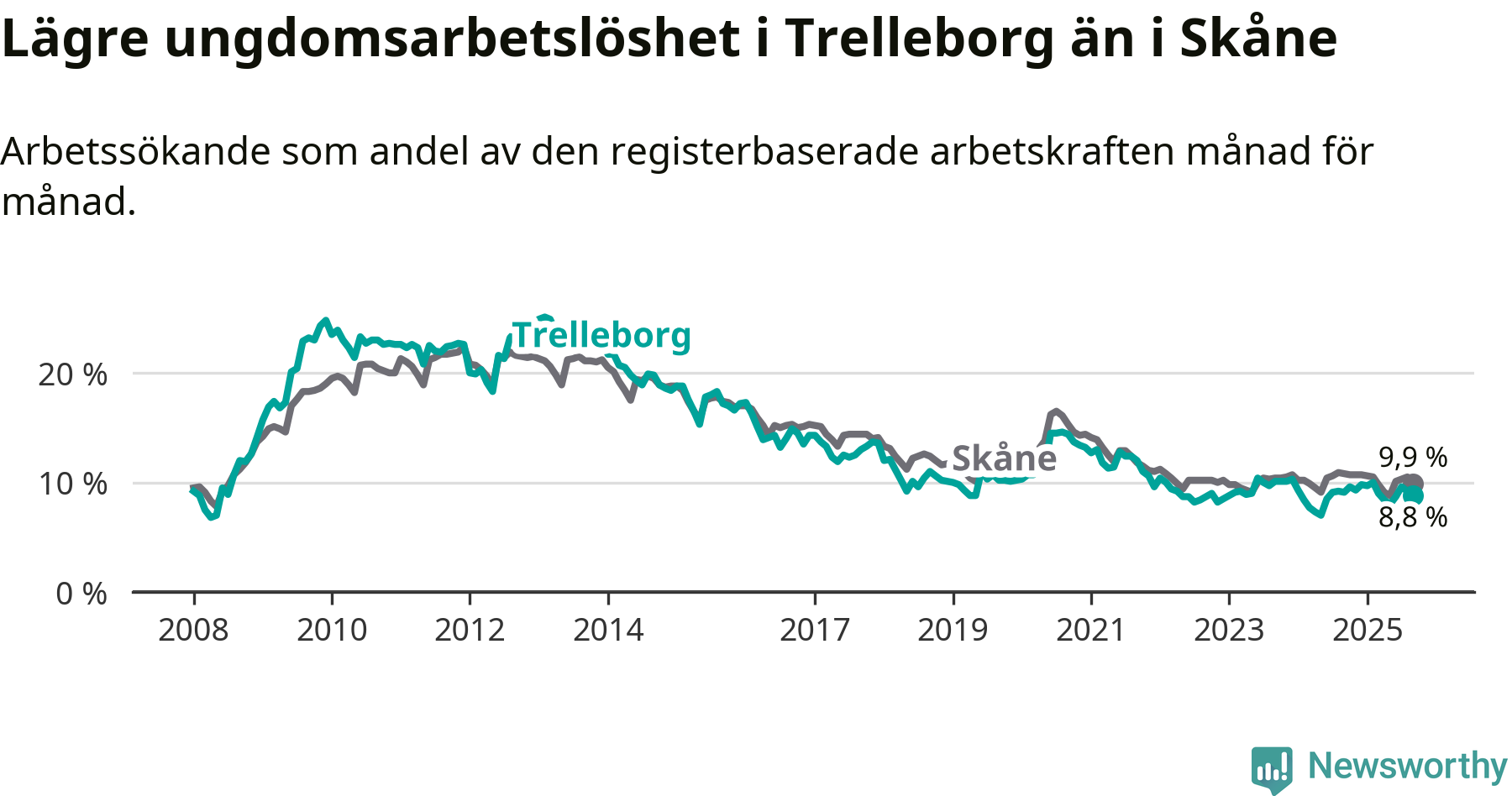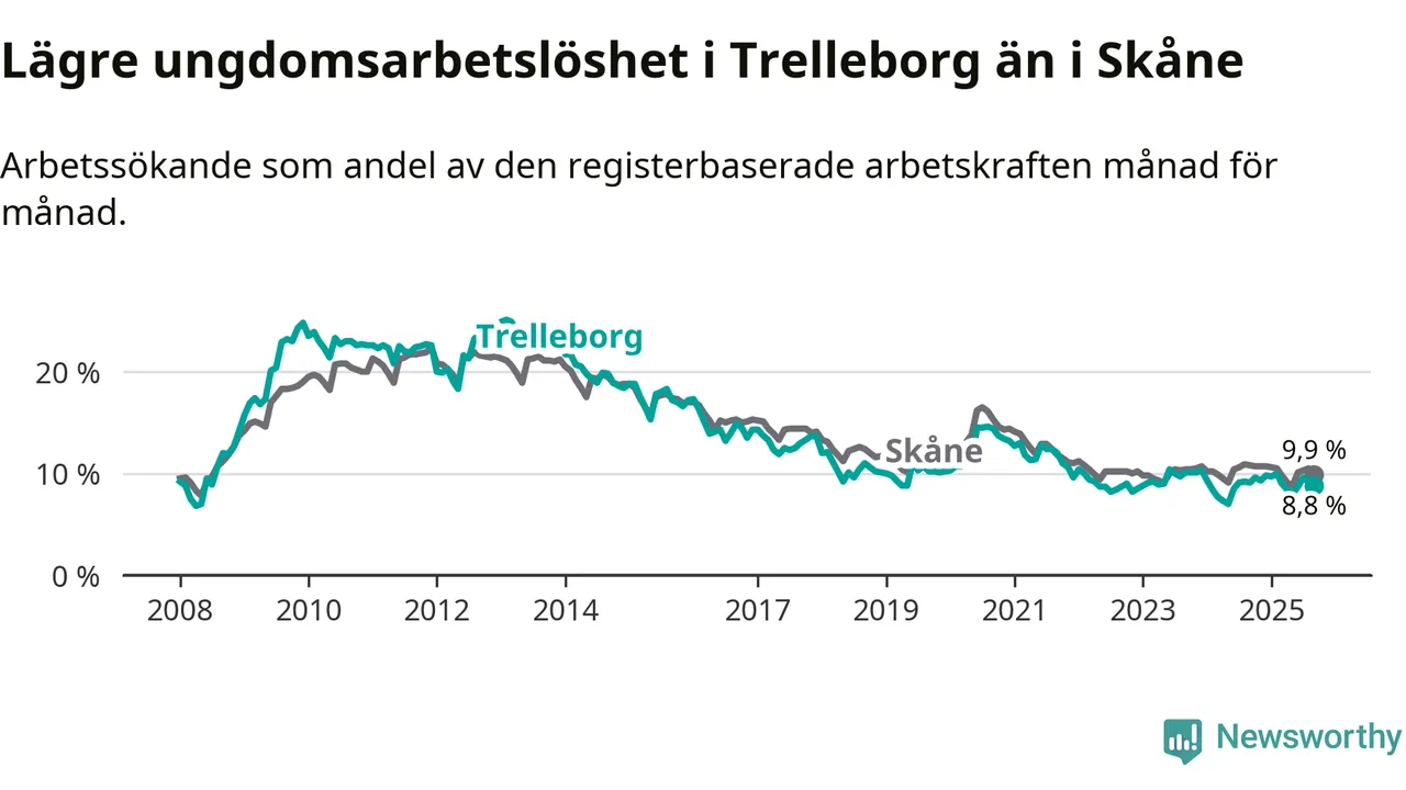Precis som den totala arbetslösheten ligger ungdomsarbetslösheten i Trelleborg lägre än i Skåne som helhet. Skillnaden mellan kommunen och länet är 1,1 procentenheter.