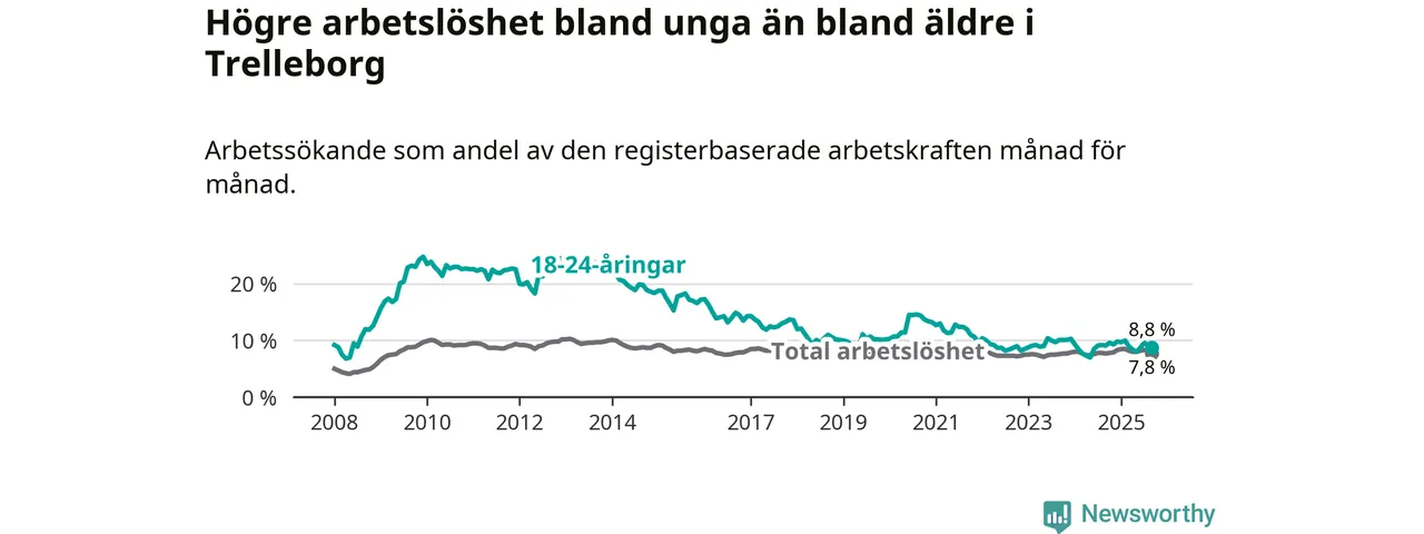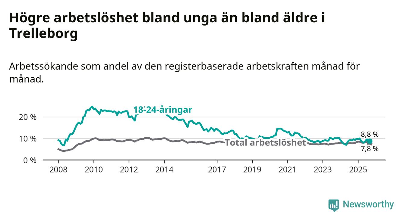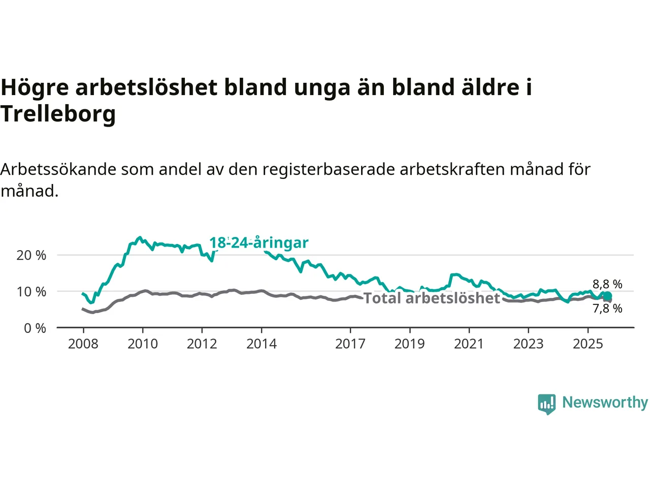 Under september månad rapporterade Trelleborgs kommun en total arbetslöshet på 7,8 procent. Det är en ökning jämfört med samma tidpunkt i fjol (+0,1 procentenheter). I Skåne län däremot sjunker arbetslösheten .